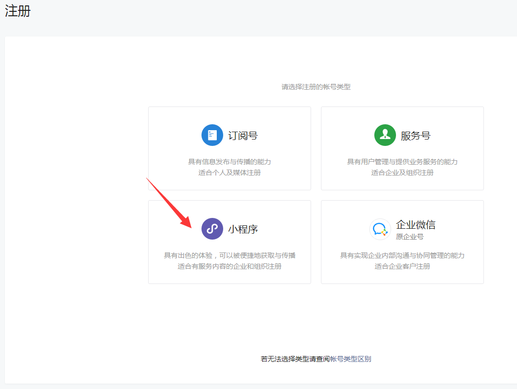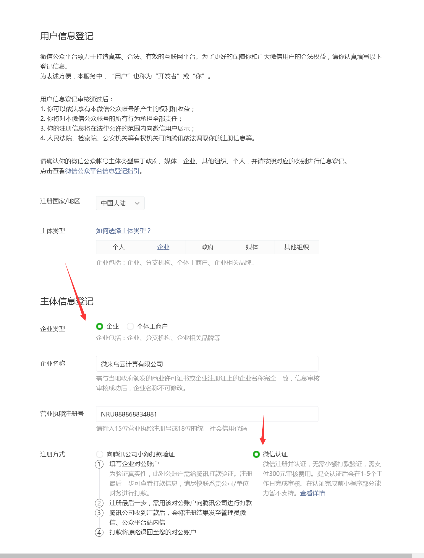 ### 一、传统新申请认证小程序账号 #### 1.申请帐号 进入微信公众平台官方网站 [https://mp.weixin.qq.com](https://mp.weixin.qq.com/ "https://mp.weixin.qq.com") 点击右上角的 立即注册  #### 2.在选择注册账号类型的页面,点击左下方的“小程序”。  #### 3.填写需要注册的邮箱、密码以及验证码后,点击“注册”按钮。注意:需要之前没有在公众号注册过的邮箱,每个邮箱仅能申请一个小程序,填写完成以后会发送一封确认邮件到邮箱。 建议使用网易邮箱注册,不建议使用QQ邮箱,因为QQ邮箱在你的QQ很久没登录的情况下会被注销 当然了,如果你有正常使用的QQ邮箱,且没有绑定微信任意帐号,也是可以用来注册微信开放平台的!  #### 4.登录注册用的邮箱,激活账号。  #### 5:打开你的网易或者QQ邮箱,进入邮件点击那个连接激活小程序帐号,激活完成后即可使用邮箱帐号密码登录小程序  #### 6:接下来填写主题类型、企业名称、营业执照注册号等主体信息。注意:目前主体只限于“个人/企业/政府/媒体/其他组织” 注意:个人注册的没法认证。没有办法添加业务域名,也没有办法开通支付功能,如果只是简单的测试使用,可以选择以个人为主体。 注意:我们的客户请注意,请选择,企业,政府,媒体,或其他组织,不要选择个人,否则小程序将无法使用 请按照您的营业执照来填写具体 注册方式,请选择微信认证,因为你选择了向腾讯公司小额打款验证,完了还是需要交300元的认证费用给腾讯,而且对公帐号转款手续费也不低!  #### 7,接下来填写管理员姓名、身份证号和手机号码等信息。确认无误后,点击“继续”。 注意:管理员信息可以不和营业执照上的法人一样!如果没有特殊情况,请填写法人即可!  #### 8,信息完善后,扫码支付300元认证费微信官方收,微信第三方核实打款验证,核实信息无误认证才会通过