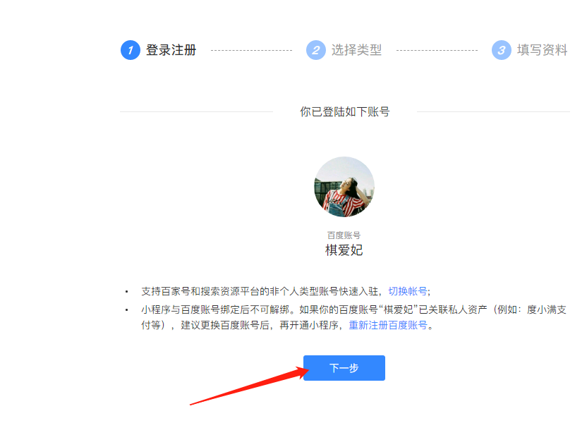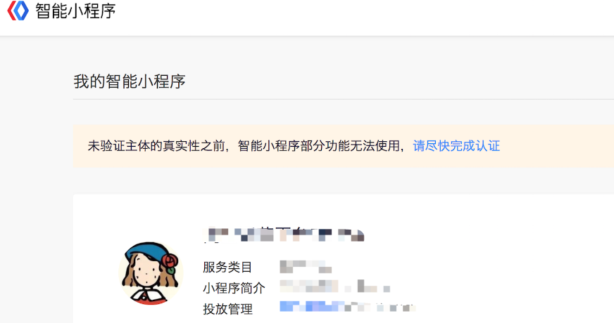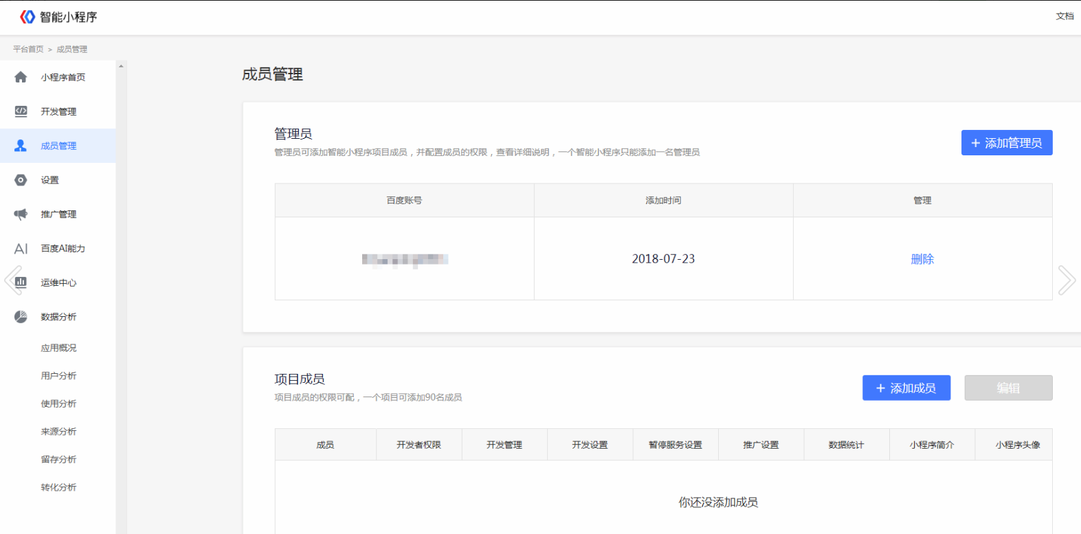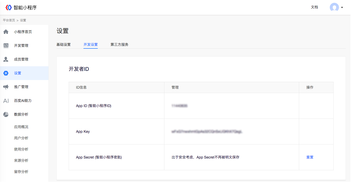 ##### # 一、百度智能小程序开发者后台登录地址:https://smartprogram.baidu.com/mappconsole/main/login![]# 百度智能小程序开发者后台登录地址:https://smartprogram.baidu.com/mappconsole/main/login![] 1:进入百度智能小程序平台,点击登录。如果你已有百度账号,此时会弹出提示框,询问你是否使用该百度账号登录。如果你没有百度账号,或者不希望用这个百度账号登录智能小程序,也可以点击使用其他账号登录,此时系统会弹出注册界面。输入手机号和密码信息,就可以创建一个智能小程序账号啦!   ##### ## 二、登录成功后,选择类型、填写信息并提交相应的资料。## 登录成功后,选择类型、填写信息并提交相应的资料。 可选择的类型选项有:企业、政府、媒体和其他组织。一定要按照实际情况,选择最准确的类型噢,否则有可能影响后面其他功能的使用。不同的类型,注册所需的资料也有所不同。   主体类型说明: 媒体:报纸、杂志、电视、电台、通讯社、其他等; 企业:企业、个体工商户、企业相关品牌; 政府:国内、各级、各类政府机构、事业单位、具有行政职能的社会组织等; 其他组织:公共场馆、公益机构、学校、社团、民间组织等机构团体申请; 不同类型的开发者所需的登记信息;包括主体信息、超级管理员信息两部分。  注:每个帐号有5次提交审核机会,5次审核仍然没通过的,将不能再提交。 ##### 三、 超级管理员信息登记 登记管理员身份证姓名、身份证号码并验证手机号。(超级管理员不支持更换)  ##### 四、 确认主体信息  ##### 五、当提交完资料,接下来要做的就是等待审核。审核通过后,就可以拥有自己的智能小程序帐号。  ##### 六、待百度小程序信息审核通过后,进入首页会有高级认证的链接,点击后跳转到高级认证页面,认证通过即可创建百度智能小程序并正常使用平台各项功能。  ##### 七、百度智能小程序信息完善 注册审核通过后,点击“创建智能小程序”完善智能小程序基本信息(填写智能小程序名称、简介,上传头像并选择服务范围)。  ##### 八、百度智能小程序开发前准备 登录智能小程序平台,进入平台首页- 成员管理,添加智能小程序项目成员并配置成员权限,一个智能小程序只能添加一名管理员。  ##### 九、进入“平台首页-设置”,获取AppID(智能小程序ID)、App Key、App Secret(智能小程序密钥)。