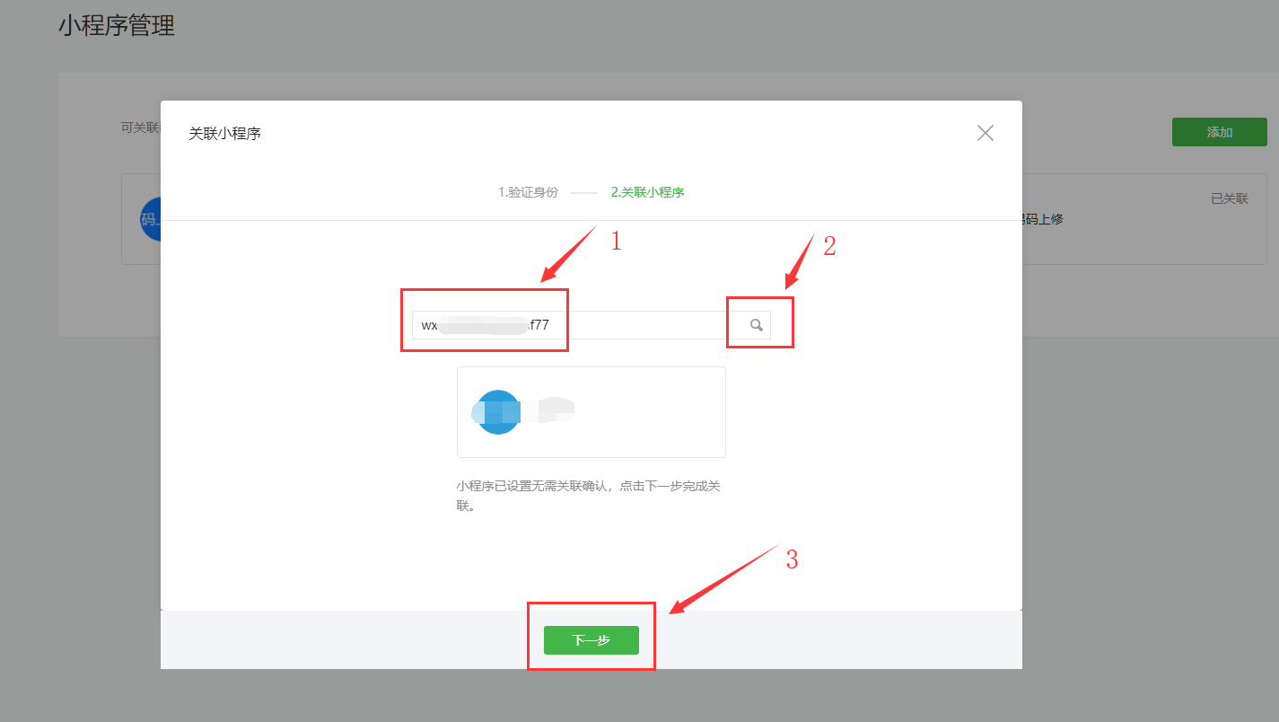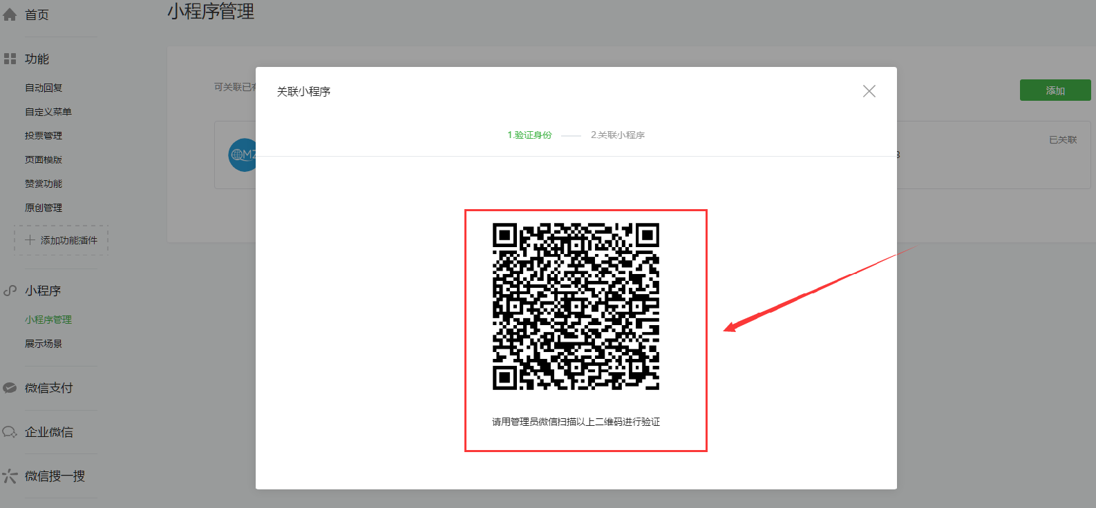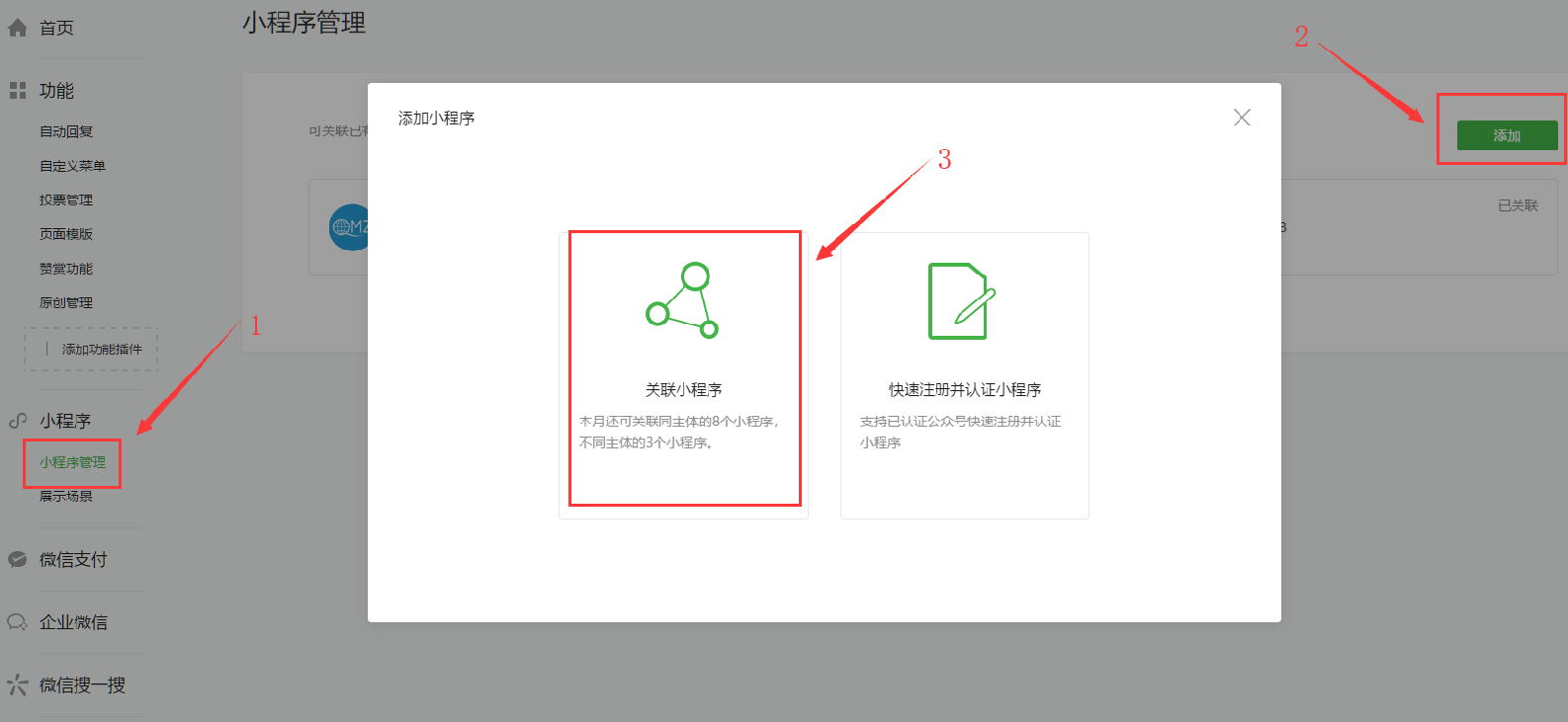 # 小程序绑定公众号教程 ## 第一步.用公众号账号登录微信公众平台https://mp.weixin.qq.com (登录过程,需要管理员微信APP扫码)  ## 第二歩.在小程序管理页面中查询小程序账号是否关联公众号,下图显示小程序已经关联,表示关联成功,如果没有关联,请根据第三步操作进行操作  ## 第三步,选择添加——关联小程序,扫码确认,输入关联小程序的APPID,点击下一步保存即可    ## 第四步.设置公众号底部设置跳转菜单栏,设置公众号菜单时候,菜单内容选择小程序