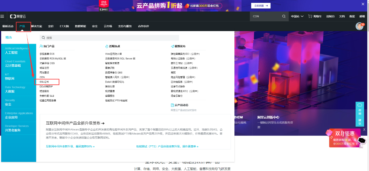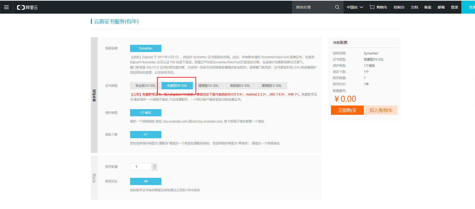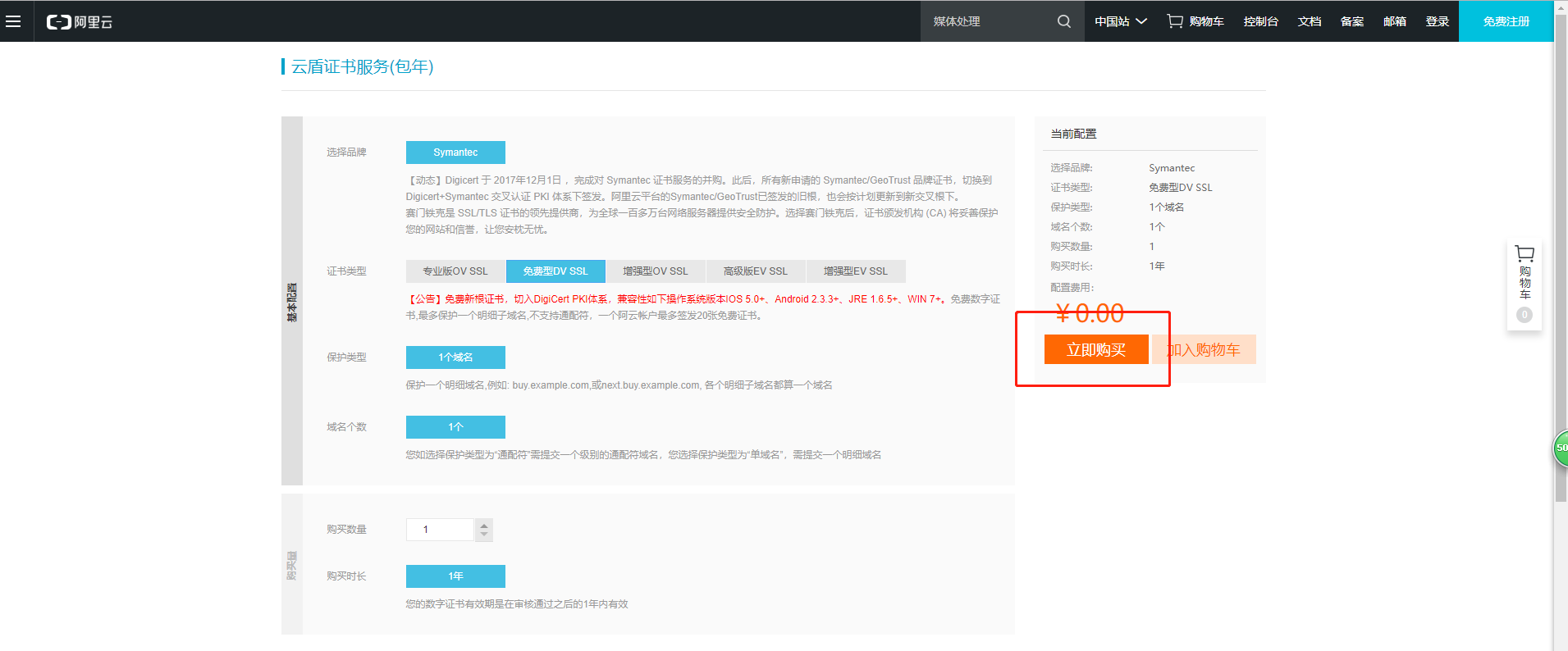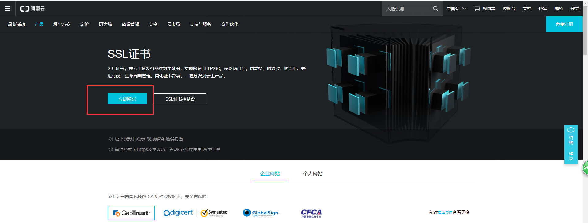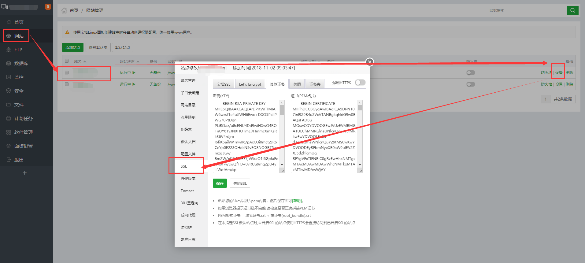 ### 3、SSL证书配置 - (仅限于私有化部署客户或OEM代理)SAAS版客户和代理商请忽略! ### 一、申请 SSL证书 #### 阿里云可以申请免费的ssl证书。 #### 1、产品——ssl证书  #### 2、立即购买  3、  然后等一下,会看到一个免费的,点击即可   #### 二、宝塔面板中SSL证书配置 #### 1、登录  #### 2、点击 “设置” 如果没有建立站点,先建立站点。  #### 3、填入内容 看好了,左侧是:秘钥(KEY),右侧是证书,如果有3个文件,KEY粘贴入左侧文本框,其他两个粘贴在右侧,尽量不要有空格。