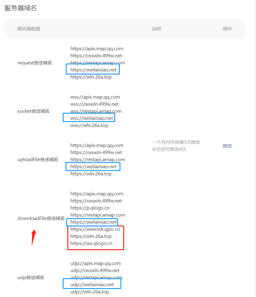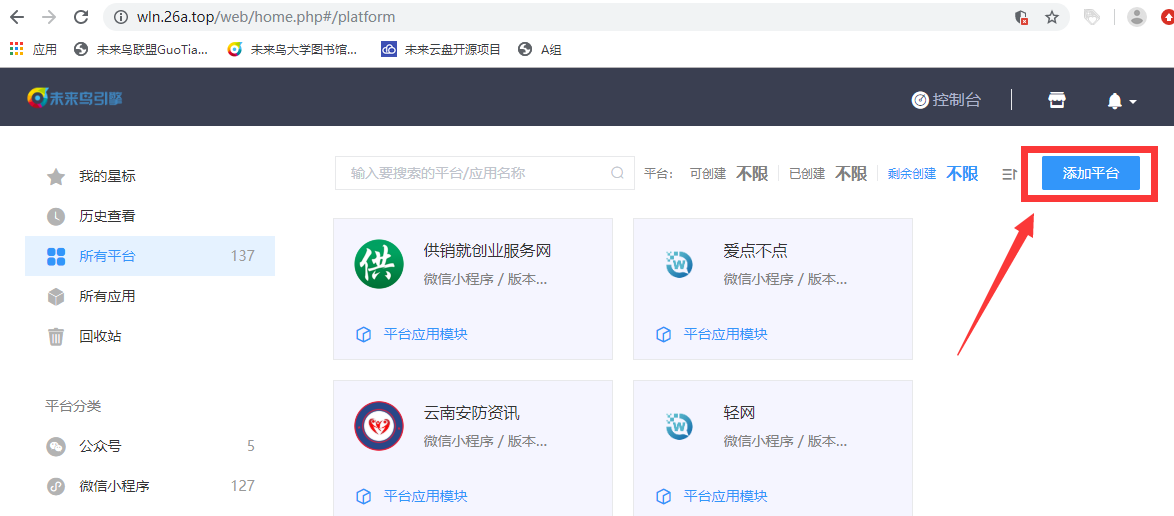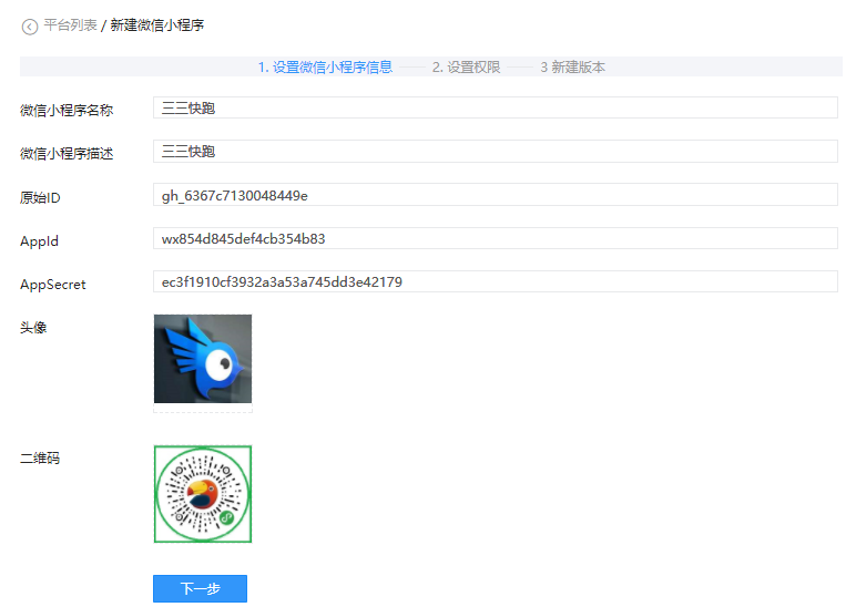 ### 前提 1.申请了微信小程序帐号 2.并通过了微信认证 ### 一.填写小程序信息 登录到微信小程序公众后台:[https://mp.weixin.qq.com/](https://mp.weixin.qq.com/ "https://mp.weixin.qq.com/") 请按照您的需要填写资料 小程序名称: 小程序头像: 小程序介绍 服务类目:请按照你行业所属的服务类目来选择和添加 ### 直接进入首页或者点击设置-基本设置 填写完毕内容如下图(注意不要照抄XXXXX)  ### 二.整理对接到未来鸟平台需要的基础资料和域名设置 请整理好获取到如下资料,并使用文本来记录 1. 注意:以下内容仅为范例,请为照抄 2. 小程序原始ID:gh_6367c7130048449e 3. 小程序APPDI:wx854d845def4cb354b83 4. 小程序AppSecret: ec3f1910cf3932a3a53a745dd3e42179 - 注意,建议放到有到云笔记中! #### 1.小程序原始ID 获取 小程序原始ID:  #### 2.开发设置获取AppID和AppSecret 注意:AppSecret 点生成以后,将需要管理扫码,而且这些密匙是不会保存在微信公众平台服务器上,请注意保存! 具体步骤,请看下图   #### 3.开始配置服务器域名 ##### 设置——开发设置——服务器域名——开始配置 ##### 请添加以下这几个域名进去,没有特殊需求,添加这几个域名即可!如有需求要加别的域名,请自行添加 - restapi.amap.com - apis.map.qq.com - wln.26a.top(此域名必须添加) - weilainiao.net(此域名必须添加)(如果客户使用的是自备域名或自定义域名这里换成客户的域名!) - osswln.499w.net(此域名必须添加) ##### 注意:获客星球小程序和其他小程序不一样必须要额外在添加以下三个域名到downloadFile合法域名 downloadFile合法域名: wx.qlogo.cn p.qlogo.cn wework.qpic.cn  ###### 蓝色框内为客户的自定义域名,如果客户不用自定义域名,请使用wln.26a.top ##### 这五个合法的域名都填写成一样的,具体完成图请参看上图! #### .4.未来鸟平台小程序添加 进入https://wln.26a.top 后台登录您的帐号 在系统会自动进入首页,点击去创建平台  #### 选择需要创建的程序类型,我选择创建微信小程序  #### 选择手动添加小程序  #### 新建单个小程序 打包生成小程序,仅针对开发者单个小程序插件.  #### 设置小程序基础信息 #### 这里的内容请从你的公众号或者你记录的文档中复制 #### 特别注意的是版本号,必须使用以下格式:1.1.1 之类, ### 添加应用:请选择你要一键生成的小程序应用即可 #### 完成后的范例图如下(请勿照抄) #### 然后点击下一步!  #### 权限选择,这里是站长才有的权限,如果您的账号不是站长账号,您可以忽略这一步  #### 然后添加版本描述和版本号,以及应用后点击生成版本即可! #### 特别注意的是版本号,必须使用以下格式:1.1.1 之类,  以后进入小程序配置页面 #### 请点击 平台 即可进入小程序配置页面 #### 请点击 应用 即可进入小程序内容页面,然后进行内容的填充和界面的DIY #### 因为每个应用场景不一样,所以我们这里不在多介绍!  #### 5.业务域名设置 (特别注意):普通的小程序是不需要添加业务域名的,部分采用H5页面的小程序或者有网页连接需要跳转 那么就一定要添加业务域名,不添加业务域名,H5页面或外部链接将无法访问 注意,到这里我们请先返回 https://mp.weixin.qq.com 后台 ##### 开发——开发设置——业务域名——开始配置 ###### 添加业务域名后,小程序内可调用组件打开限定域名内的网页。 ###### 业务域名请根据自己小程序内需要调用的组件下的域名自行填写,比如需要链接外部网址一类的,一个域名只能供20个小程序添加业务域名使用。 添加自行所需的业务域名后保存即可 如果不可以保存,请下载校验文件然后上传到 wln.26a.top即可校验  ##### ‘下载校验文件’上传步骤 A.点击蓝色 下载校验文件 到本地  B.登录 wln.26a.top 平台 然后依次点击——平台——配置——域名设置——小程序配置-(小程序业务域名效验文件)上传(上传你刚下载的文件)——更新即可!  C,上传文件,并点击 更新 以后  我们在返回微信公众开放平台  点击保存即可!保存成功以后的效果图如下  #### 6.售后客服管理权限添加  请添加售后客服微信号: weilainiao1204 weilainiao2011 并给予全部权限 ###### 注意:以上2个为我们的两个售后专用员,你也可以添加你的小程序添加其他管理员!这里也可以选择不添加!如果不需要协助的话! 具体操作请看下图  #### 7.开发管理! A.登录 wln.26a.top 平台 ##### 然后依次点击——平台——应用(XXXXX)填充完内容以后 ##### 然后依次点击——平台——上传微信审核 ![] B.开发版可以在这里进行预览,进行小程序内容调试,微信扫码预览开版小程序  C.当你在开发版小程序中觉得没有问题,可以发布了时候,请点击 上传代码 按钮!  D.登录微信开放平台小程序后台——开发管理  ##### 提交最新的版本,注意,新提交的版本号要比原来的大 ##### 比如上次提交的是1.16 那么这次你要提交1.17 ##### 然后请注意您的管理员微信,审核通过以后会有模版消息通知  ##### 收到审核通过的通知以后,再次登录微信开发者平台——开发者管理——审核版本——点击右侧的 全量发布(意思是全网发布的意思),小程序就正式上线了! ![]