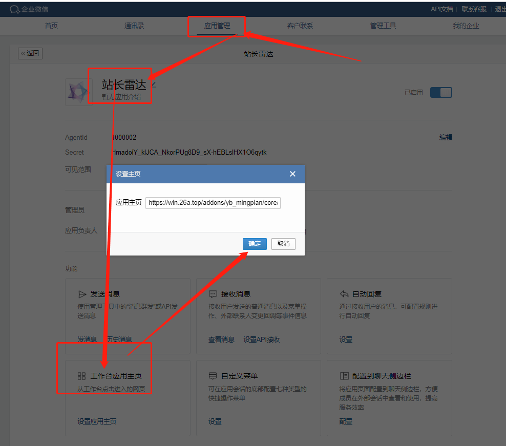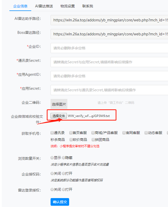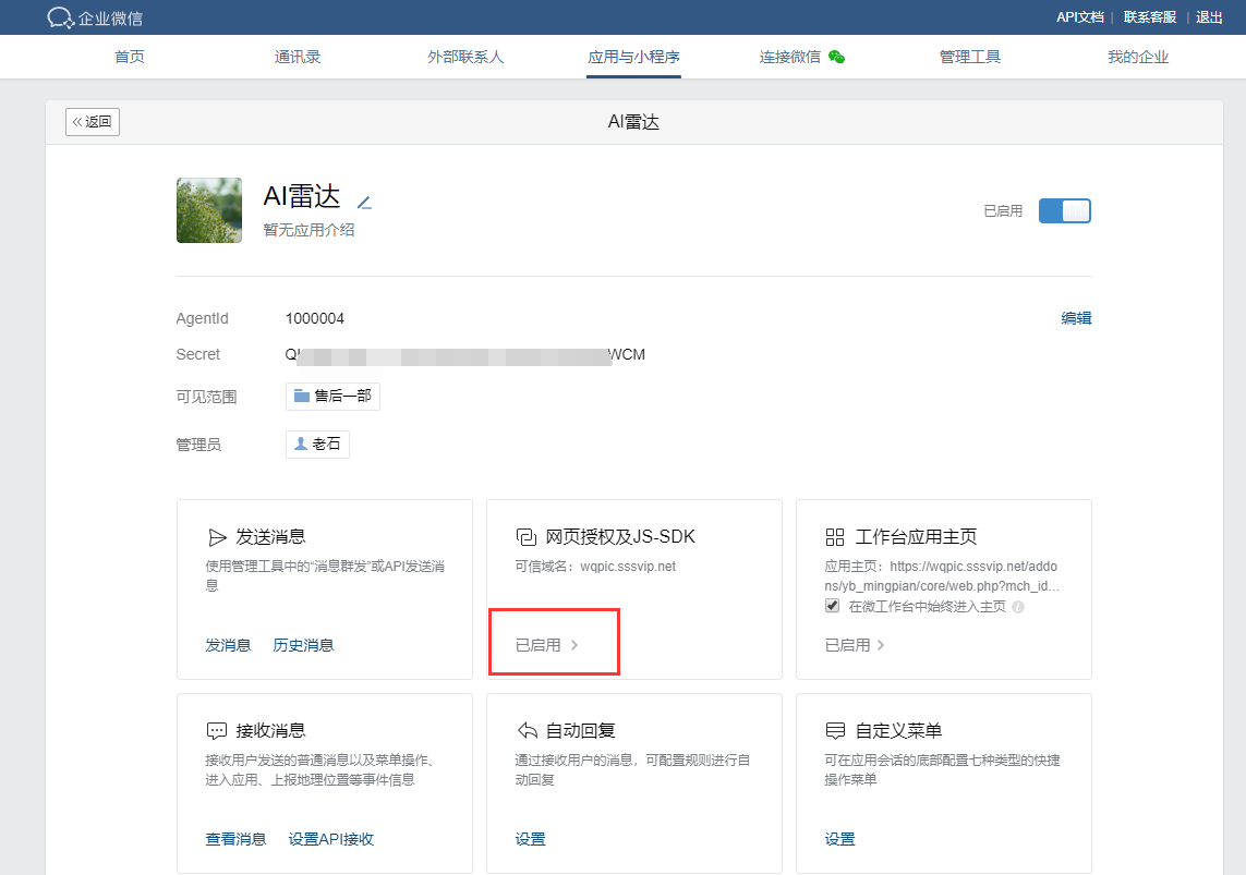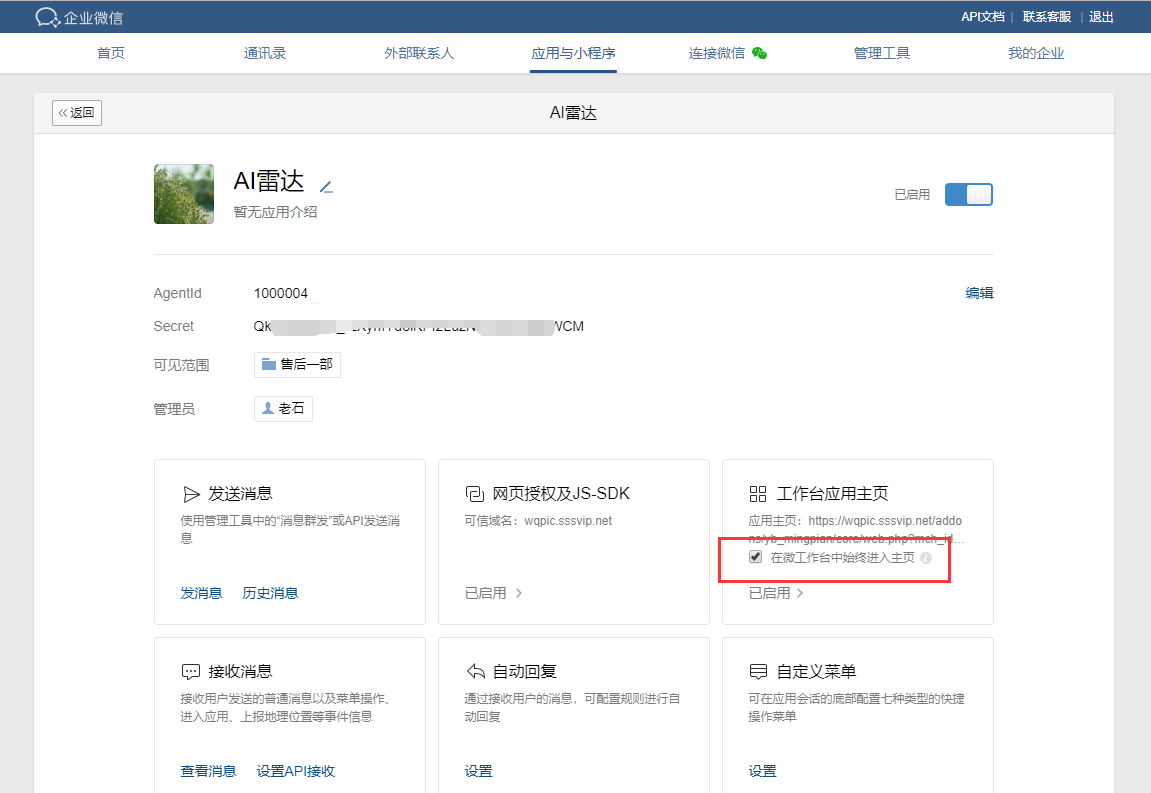 #### 一.创建AI雷达(一) 企业微信后台目录-应用管理-应用-自建! #### 1)、创建应用  #### 2)、填写信息  #### 应用名称:自定义既可。 #### 二.配置AI雷达(二) #### 1)、可信域名:填写自己的域名 应用管理-自建-AI雷达“自定义的”  点击 “申请校验域名”  下载此校验文件,并将其上传至系统应用后台:企业号——参数设置  在此处上传文件并提交保存后,要回到企业微信,勾选 “已上传域名归属校验文件”。  校验成功后,将显示 “已启用”。  #### 2)、输入ai雷达的应用主页  这里所填写的路径在下图中的位置查找。Boss雷达也是在这里查找。  主页路径在获客星球智能名片后台,企业微信-参数设置中查看和复制 路径填写完毕后, “在微工作台中始终进入主页” 一定要勾选。  #### 3)、路径填写上后,这里的复选框,要选中。  #### 4)、设置 “企业微信授权登录”   只需要配置 WEB网页设置授权回调域即可!  - 输入 - wln.26a.top - 点击保存即可! - 私有化以及OEM代理请在这里输入自己的域名!