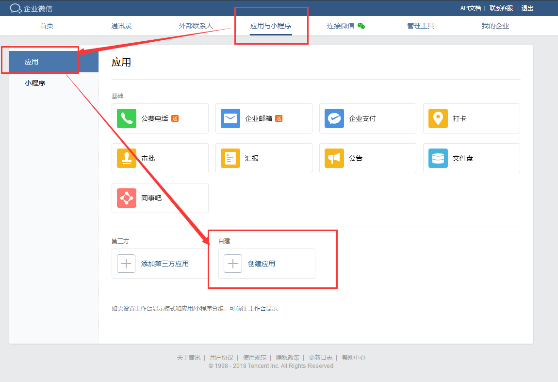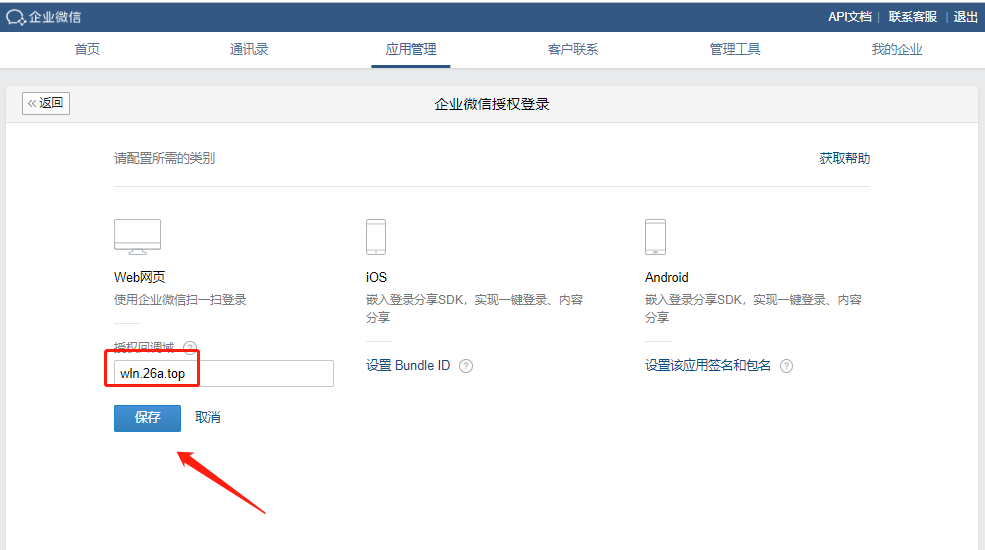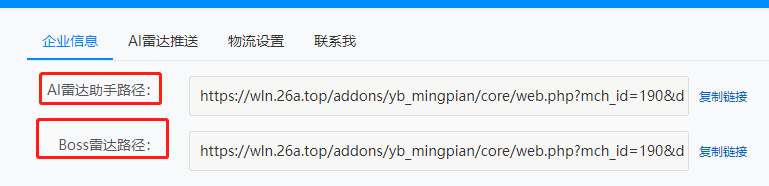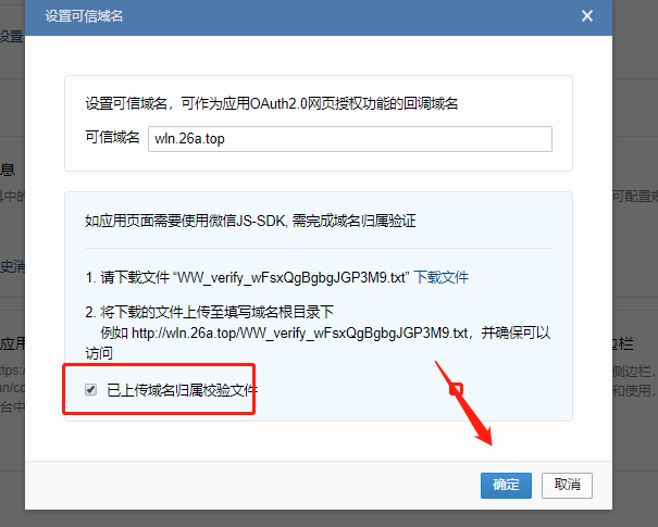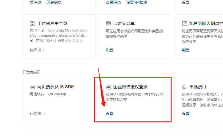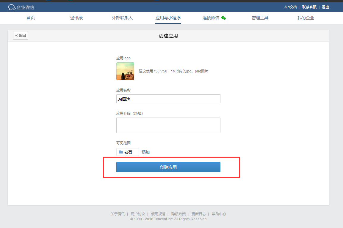 #### 一.创建AI雷达(一) 企业微信后台目录-应用管理-应用-自建! #### 1)、创建应用  #### 2)、填写信息  #### 应用名称:自定义既可。 #### 二.配置AI雷达(二) #### 1)、可信域名:填写自己的域名 应用管理-自建-AI雷达“自定义的”  点击 “申请校验域名”  下载此校验文件,并将其上传至系统应用后台:企业号——参数设置  在此处上传文件并提交保存后,要回到企业微信,勾选 “已上传域名归属校验文件”。  校验成功后,将显示 “已启用”。  #### 2)、输入ai雷达的应用主页  这里所填写的路径在下图中的位置查找。Boss雷达也是在这里查找。  主页路径在获客星球智能名片后台,企业微信-参数设置中查看和复制 路径填写完毕后, “在微工作台中始终进入主页” 一定要勾选。  #### 3)、路径填写上后,这里的复选框,要选中。  #### 4)、设置 “企业微信授权登录”   只需要配置 WEB网页设置授权回调域即可!  - 输入 - wln.26a.top - 点击保存即可! - 私有化以及OEM代理请在这里输入自己的域名!