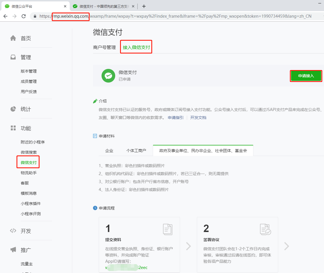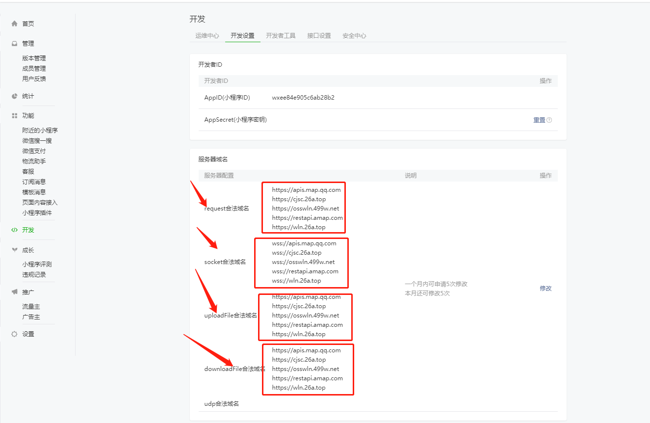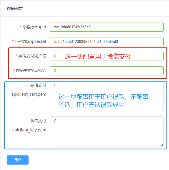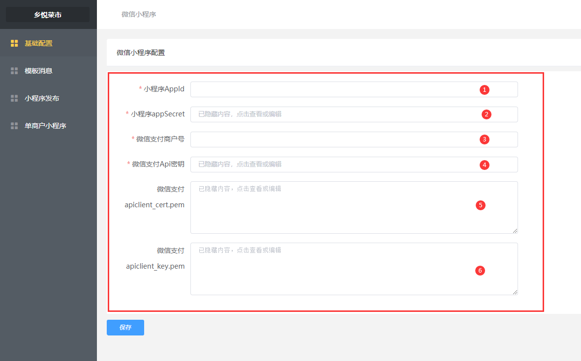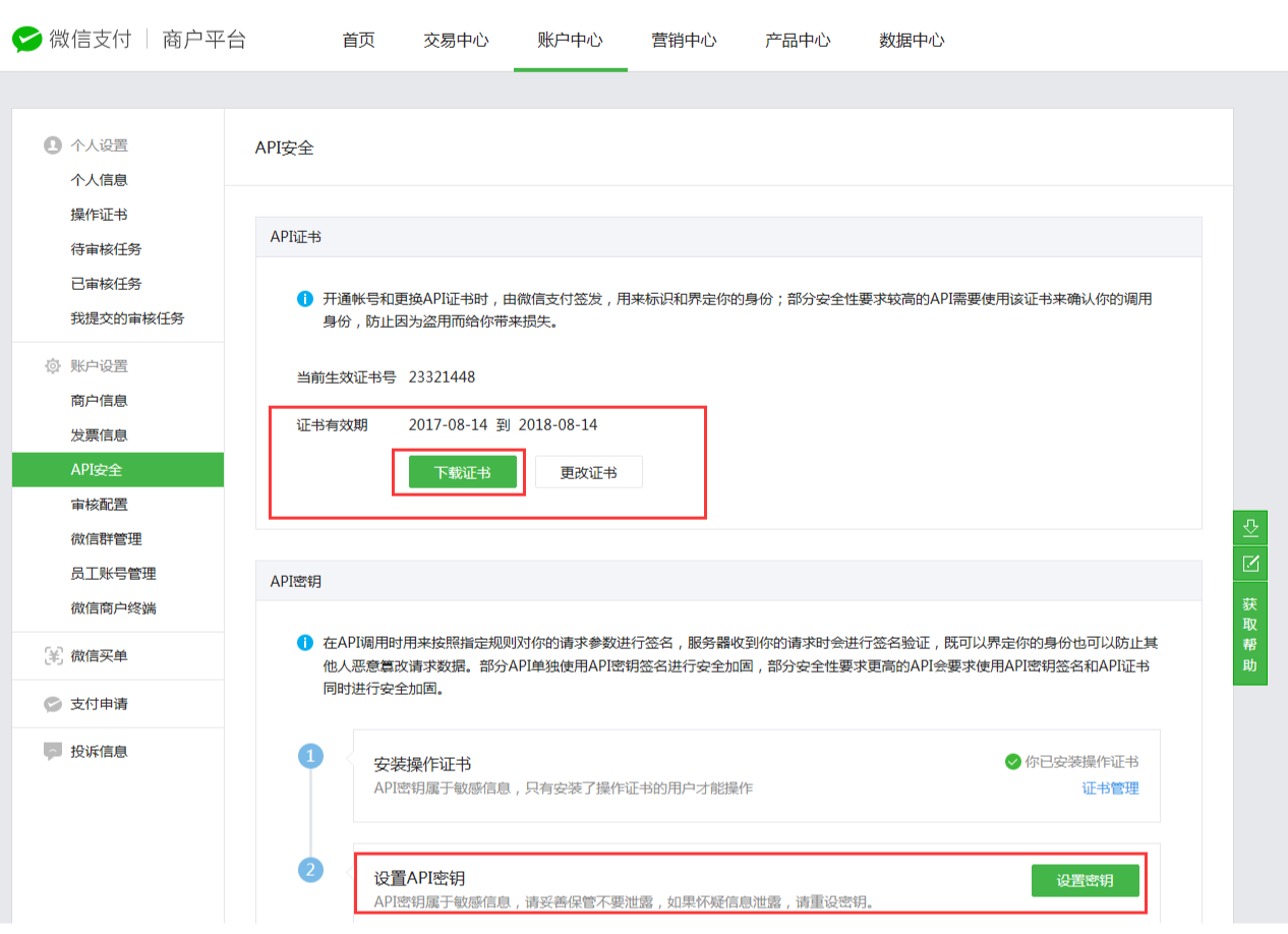 ### 基础配置 注:小程序对接可直接小程序管理员扫码授权(商城系统管理员账号有此权限,==员工账号不能进行授权==)  ==#### 手动配置对接== 第一步:微信小程序的配置以及支付功能对接 #### 下图中所有的参数均需要在微信官方注册开通过后才能取得相应的数据。 (1)小程序Appid【此处的值需要在小程序官方后台去获取】 (2)小程序appSecret (3)微信支付商户号 (4)微信支付Api密钥 (5)微信支付apiclient_cert.pem (6)微信支付apiclient_key.pem  #### 填写小程序APPID和小程序密钥AppSecret - 登录微信小程序平台-->开发-->开发设置 将小程序参数填写到商城后台  #### 将商城访问网址域名填写到小程序后台(mp.weixin.qq.com)设置—开发设置—服务器域名 #### 请填写以下几个域名为服务器域名: ##### apis.map.qq.com ##### cjsc.26a.top ##### osswln.499w.net ##### restapi.amap.com ##### wln.26a.top - 私有化部署用户和OEM代理请注意 - 请把wln.26a.top 和cjsc.26a.top修改为您自己的电商系统域名 - 请把osswln.499w.net 修改为您自己的云储存域名!  #### 完成上面的两个步骤就实现了微信小程序和商城后台的相互关联,如商城不需要支付功能可以不用配置下面操作,如果需要微信支付,必须配置以下操作 #### 配置微信支付,微信小程序后台(mp.weixin.qq.com)必须先申请开通微信支付,开通后,登陆微信支付商户平台(https://pay.weixin.qq.com)下载API证书,证书解压好后用记事本打开,全选复制粘贴到商城后台  ### 微信支付相关参数获取: 新版商户平台证书获取教程:http://kf.qq.com/faq/161222NneAJf161222U7fARv.html 登陆小程序后台(https://mp.weixin.qq.com): 点“微信支付”若,未开通,则需要开通  商户号及密码已发送至邮箱xxxxx@qq.com。登陆邮箱找到微信支付商户平台相关信息  登陆微信支付|商户平台(https://pay.weixin.qq.com)  设置32位API秘钥、下载API支付证书(apiclient_cert.pem和apiclient_key.pem)并解压用记事本打开——复制,粘贴到对应配置位置