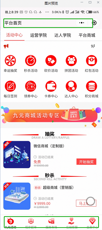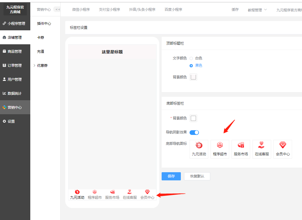 ### 标签栏 #### 用处: 美化商城首页顶部导航跟底部导航。  - 底部导航图标支持编辑和删除 - 支持拖动排序 小程序端效果图