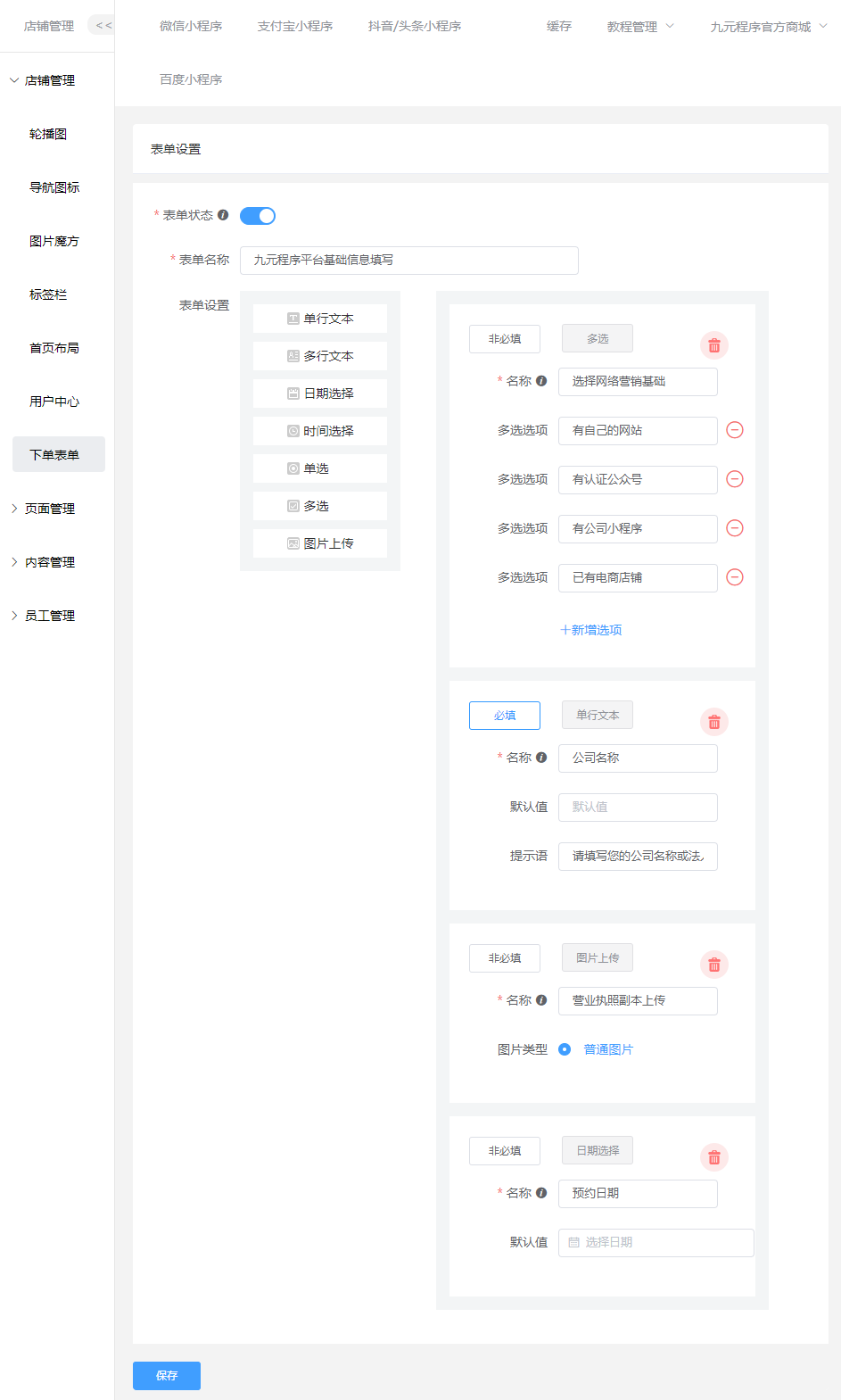 ### 下单表单 #### 用处: 用于买家下单的时候,可以选择你需要买家填写的信息、备注。  #### 表单支持:单行文本,多行文本,时间选择器,日期选择器,单选,多选,图片上传,支持拖动排序 ### 小程序端效果图: