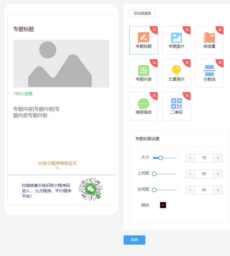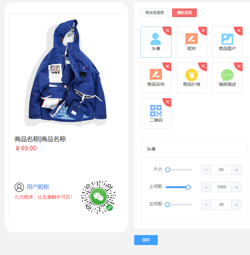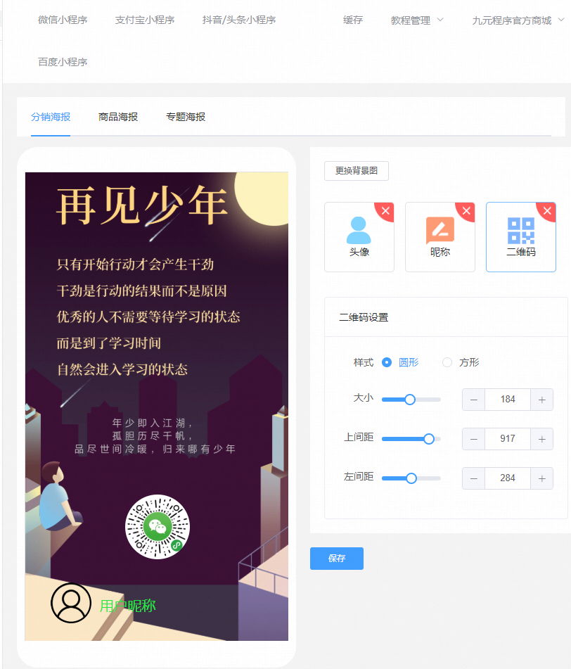 ### 自定义海报 #### 用处: 主要用于生成分享海报分享给别人查看。 - 分为三块:(分销海报、商品海报、专题海报)  ### 分销海报 - 推广海报用于分销商-分销中心-推广海报,生成具体平台个性化的带分销商推广小程序码的炫酷海报,可直接转发也可生成图片发送给朋友或者分享在朋友圈; - 点击设置( - 1.设置背景图尺寸750x1334,,可设置个性化效果(包含分销商昵称,小程序码等大小位置颜色)) - 注:若用户小程序推广海报出不来,请确认1.小程序必须上线发布-小程序码接口要求 - 2.商城管理-商城设置-支付证书是否设置正确,若不确定,则2个都设置为0,若能出来,则是支付证书设置问题,请重新填写正确的支付证书 - 3,确认php扩展-imagick关闭  #### 小程序端效果图:  ### 商品海报  #### 小程序端效果图:  #### 专题海报  #### 小程序端效果图: