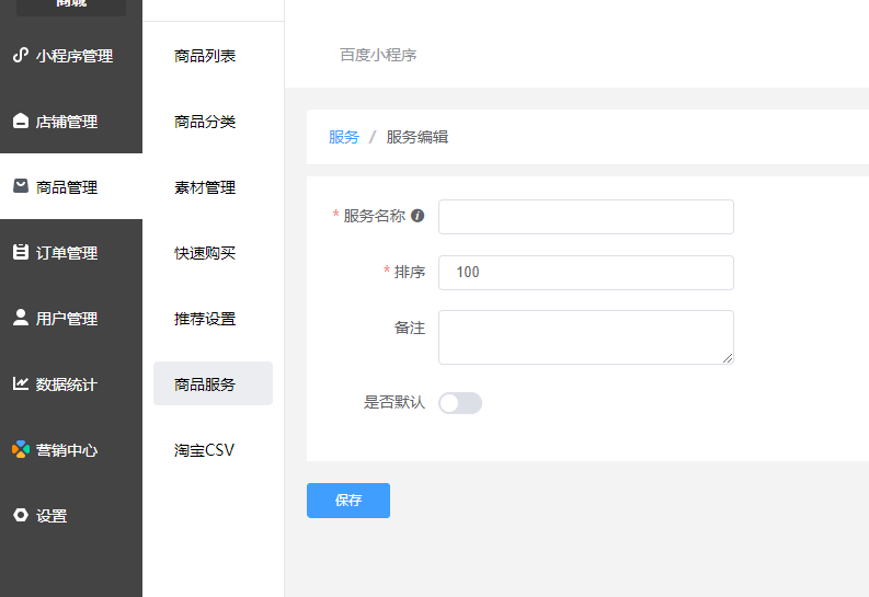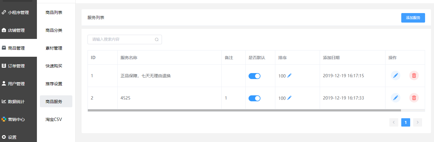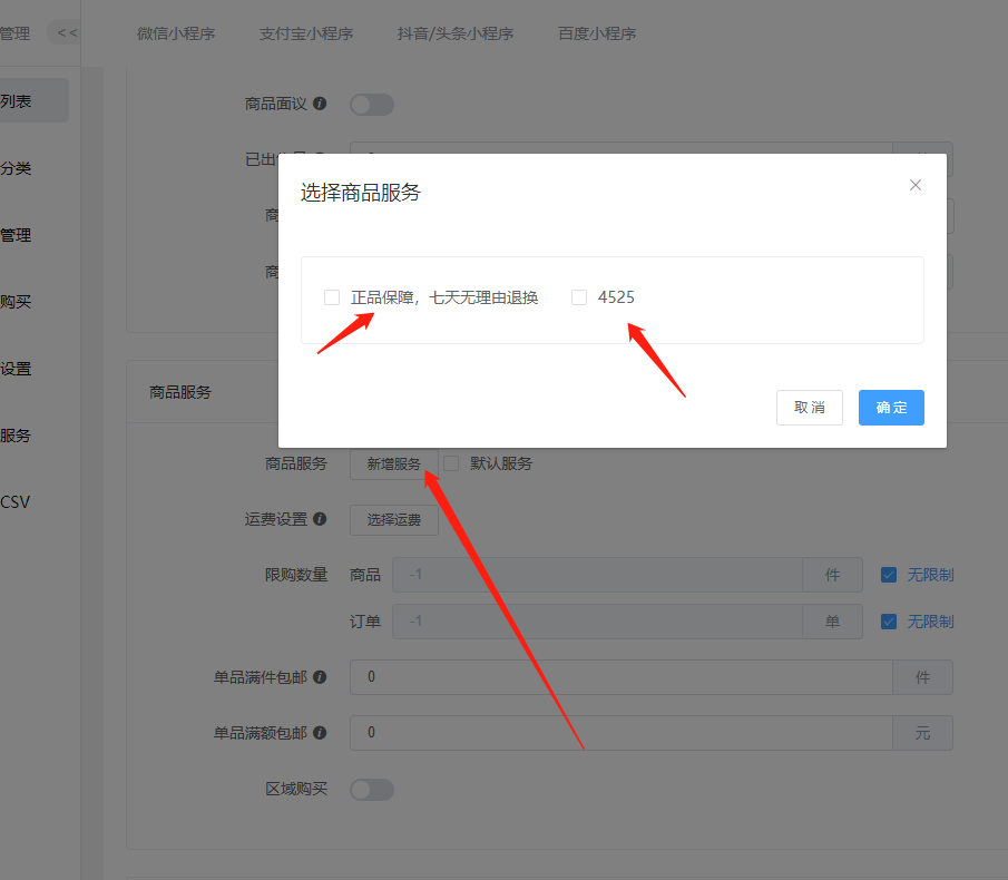 ### 服务 #### 用处: 主要用于添加商品的时候,可以选择服务。 - 支持服务名称搜索 - 支持直接输入排序 - 支持多个默认  #### 添加服务  #### 后台效果图:(商品管理-->添加商品的时候)  #### 小程序端效果图: