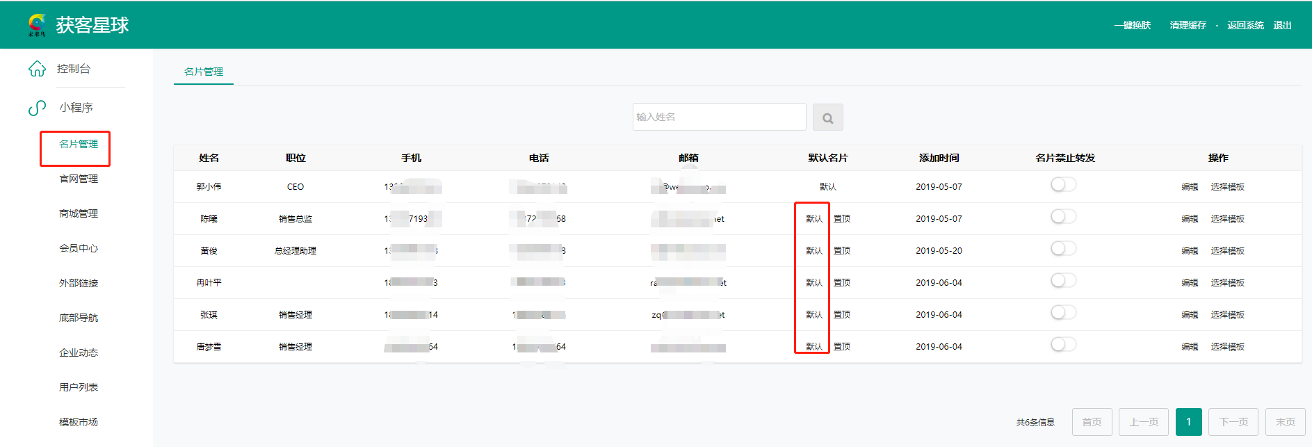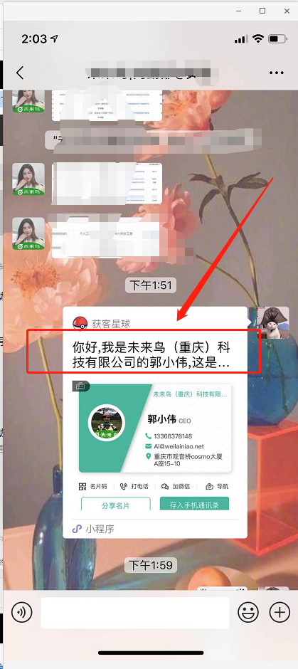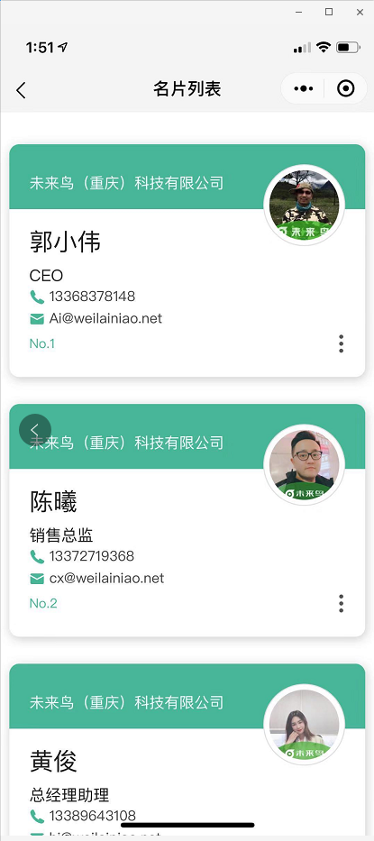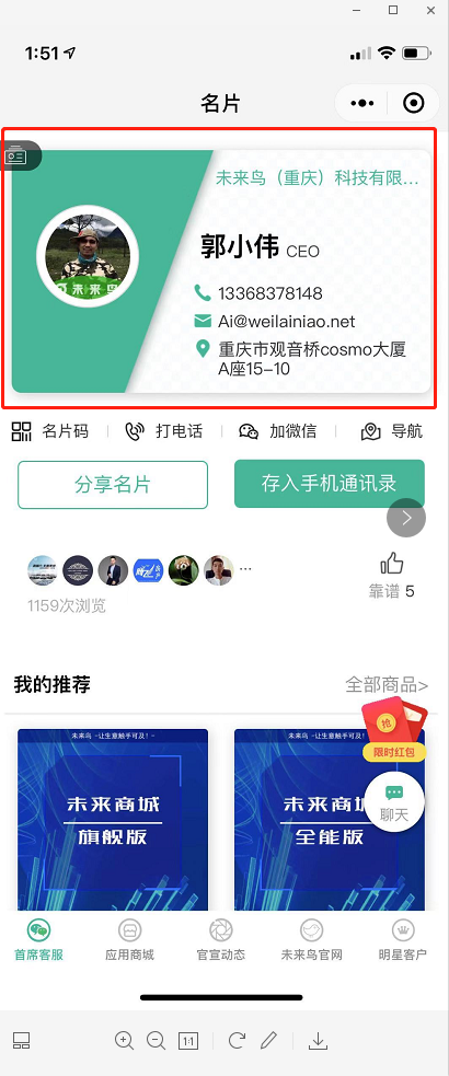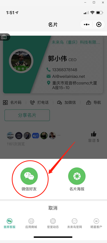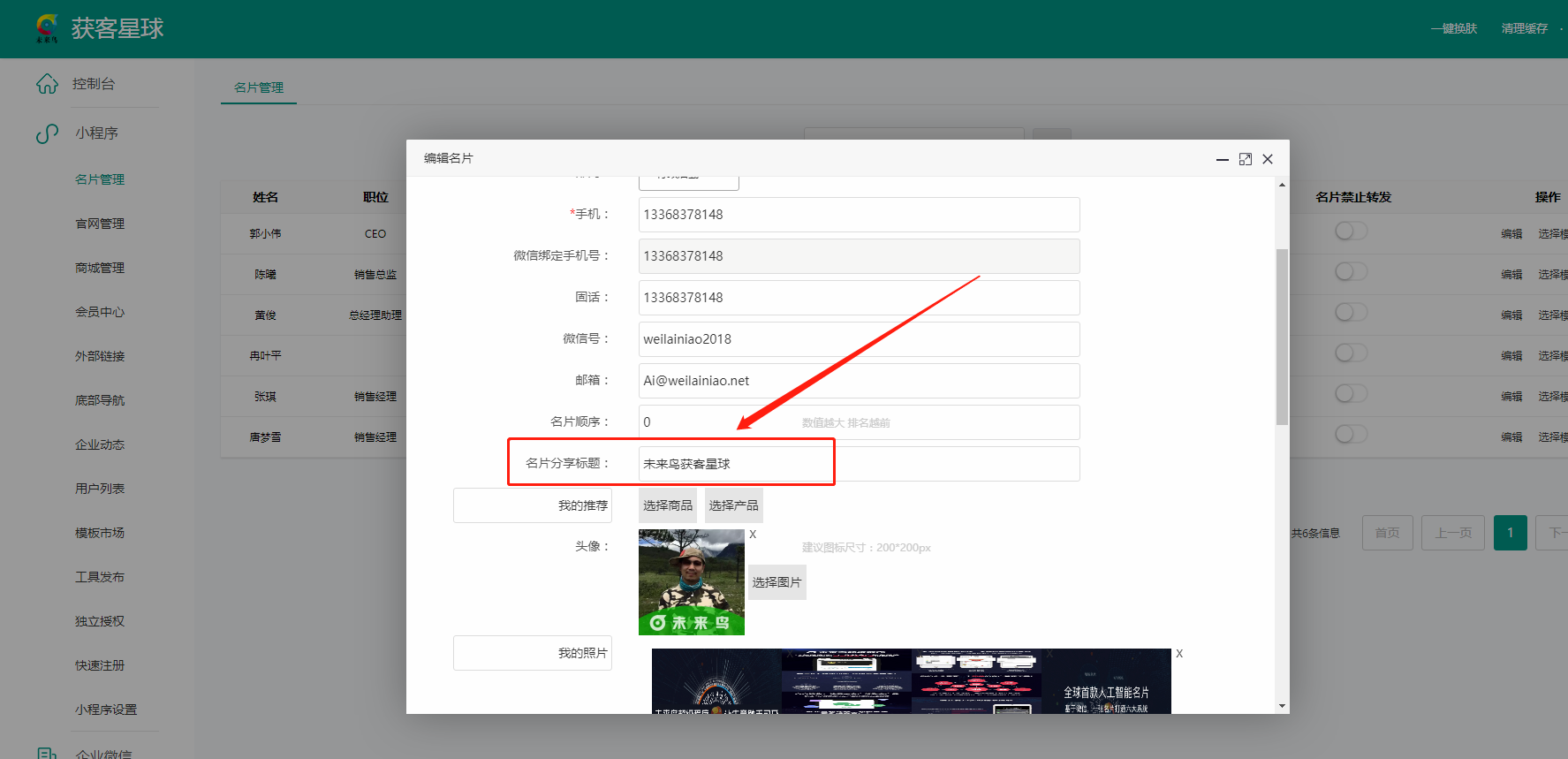 ### 名片管理  显示所有的名片信息,可执行编辑、选择模板等操作。 选择模板:选择名片在小程序上显示时候的模板。   名片分享标题: 名片管理中设置后。  手机上“分享微信好友”  显示在手机上,如下图: