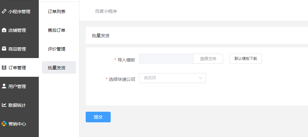 ### 批量发货批量发货 #### 用处: 主要用于批量设置发货。  - 下载模板,根据模板填写信息。 - 上传文件、选择快递公司,点击提交 #### 注意:无法触发电子面单