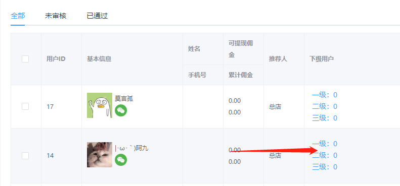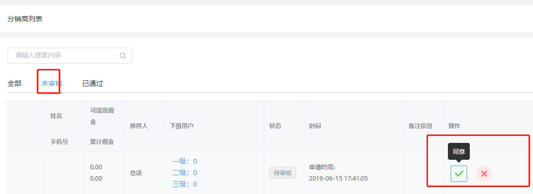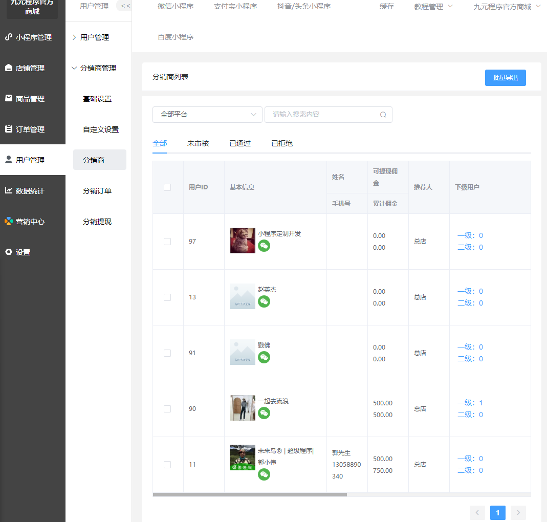 ### 分销商 - 设置好小程序,用户在小程序端申请成为分销商或者已经成为分销商之后,所有分销商在该页面进行管理  #### 审核分销商审核分销商 - 点击未审核筛选出等待审核的分销商,点击操作-审核通过/或者不通过,若不通过,该用户下次能继续申请成为分销商  #### 分销商操作 - 审核通过成为分销商之后,后台可查看分销订单,提现详情、分销商信息,分销二维码,下级成员以及成员的订单,并且可以删除分销商 - 鼠标放到小图标上出现提示文字  - 分销订单:点击分销订单显示该分销商所属下一级所有的订单信息 - 提现明细:点击提现明细,可查看该分销商所有申请提现记录 - 删除分销商:点击删除分销商,该功能是删除分销商资格以及删除该分销商上下级分销关系;注:只删除关系,不删除之前的分销业务数据跟佣金数据,若下次该分销商再次成为平台分销商,则之前佣金数据跟订单数据仍然存在,但是成员信息不在; - 查看下级:可在列表页直接点击插件下级成员