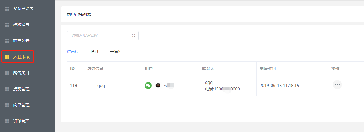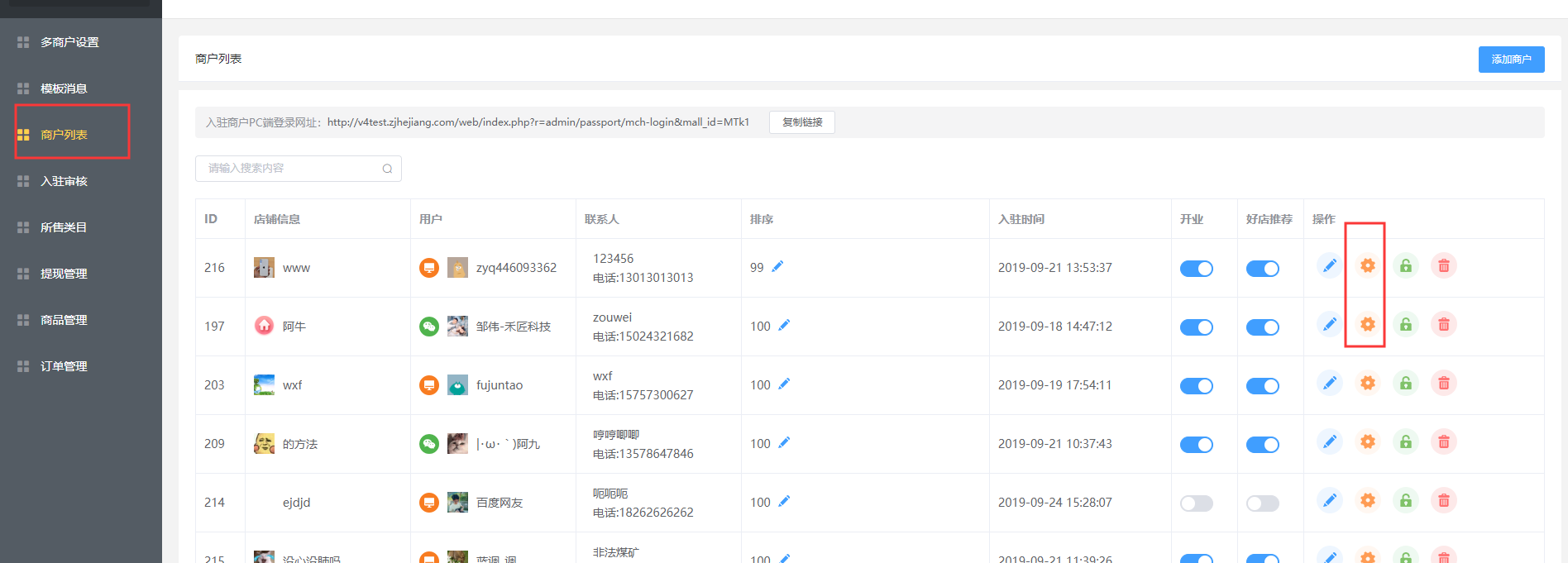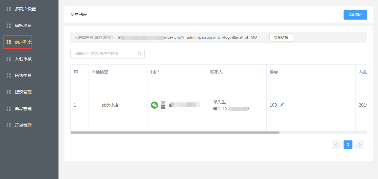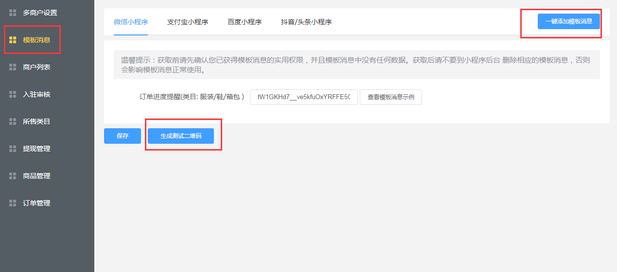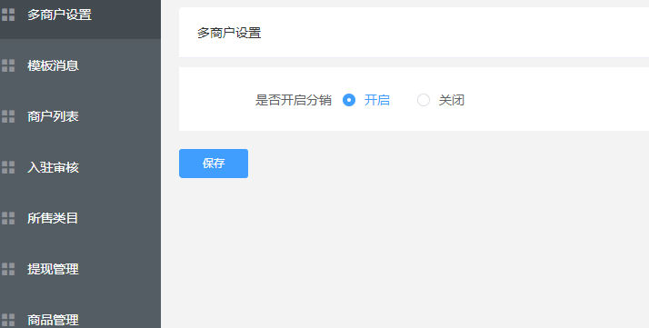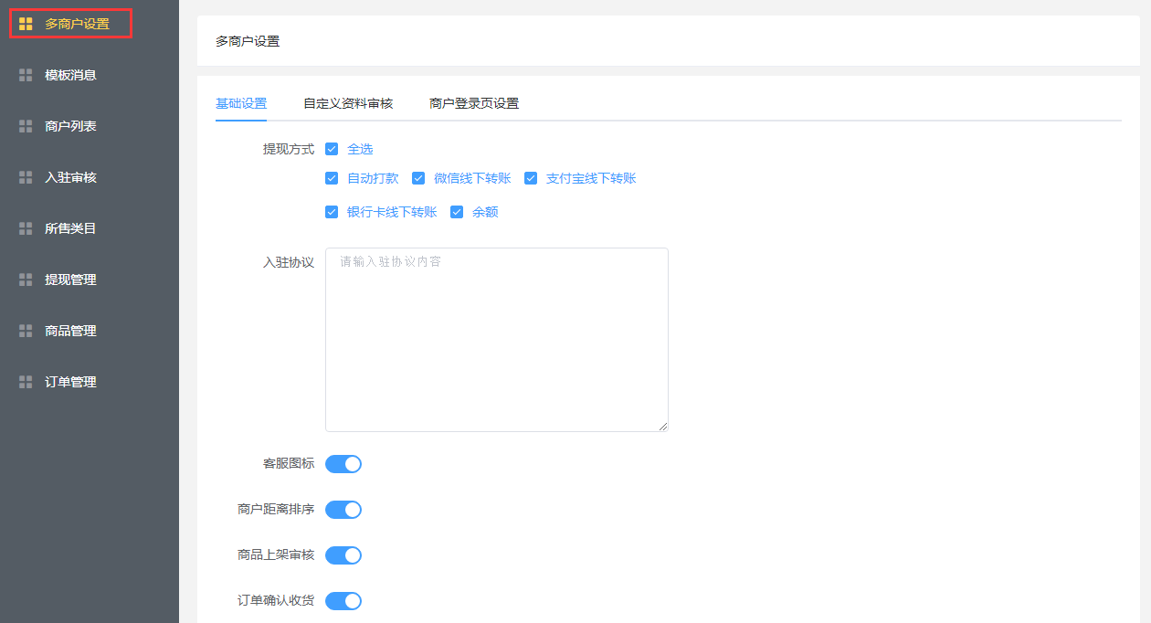 ### 多商户插件介绍  ### 1.基础设置 前言:多商户是配合商城主应用才能使用  支持选择提现方式,多商户的用户在申请提现时使用 客服图标(开启) 商户距离排序 商品上架审核 订单确认收货  1.商户距离排序(开启)  2.商品上架审核(开启)(在多商户-->商品管理里查看)  3.自定义资料审核  4.图片类型支持普通图片、营业执照、身份证  5.小程序端演示图  6.商户登录页设置  7.pc端演示图  ### 2.模板消息 可以点击一键添加模板消息(也可以手动添加:模板的内容和顺序请严格按照教程说明!!!) 生成测试二维码,扫码查看效果  ### 3.商户列表  1.多商户用户可以登录入驻商pc网址  2.可以查看用户的店铺信息   3.可以开启分销  4.可以修改用户的登录密码  5.可以删除用户的店铺  ### 4.入驻审核 可以查看待审核、通过、未通过的店铺信息  点击审核  查看基本信息  商户信息  自定义审核资料  审核信息 可选择审核通过或者不通过 审核结果对申请用户可见  ### 5.所售类目  1.添加类目(添加的分类可以让用户在添加商品的时候选择)  ### 6.提现管理  ### 7.商品管理 多商户-->多商户设置里面开启了商品上架审核的话,在这边审核  点击详情可以查看商品详情 点击删除可以删除商品 ### 8.订单管理  只支持查询、筛选、批量导出、查看订单详情 ### 9.多商户用户端  1.商品管理  2.订单管理  3.财务管理  4.用户管理  5.多商户用户手机端  ### 10.分销功能 首页商城必须开启分销层级 1进插件中心-商户列表-找到要开启的商户-点设置开启分销   2.商户登陆自己的后台-店铺设置开启分销  3.商户给自己的商品设置分销佣金