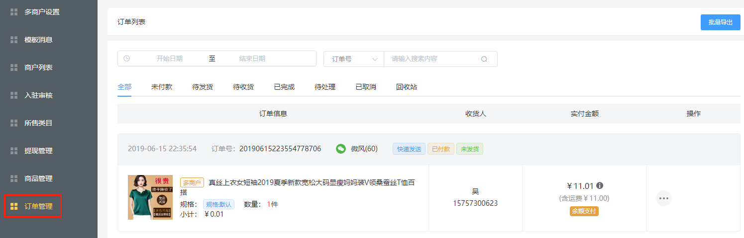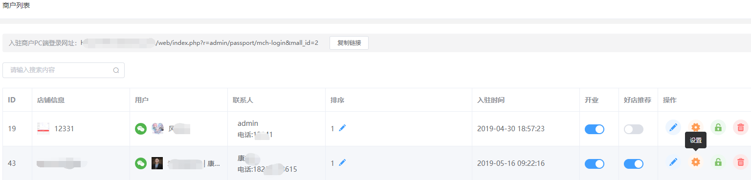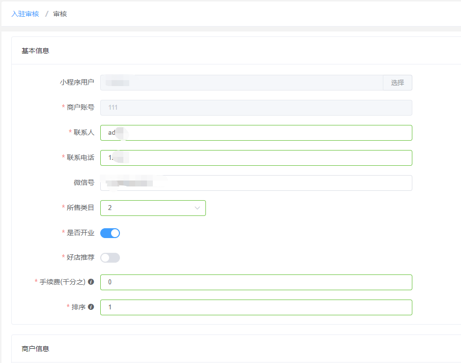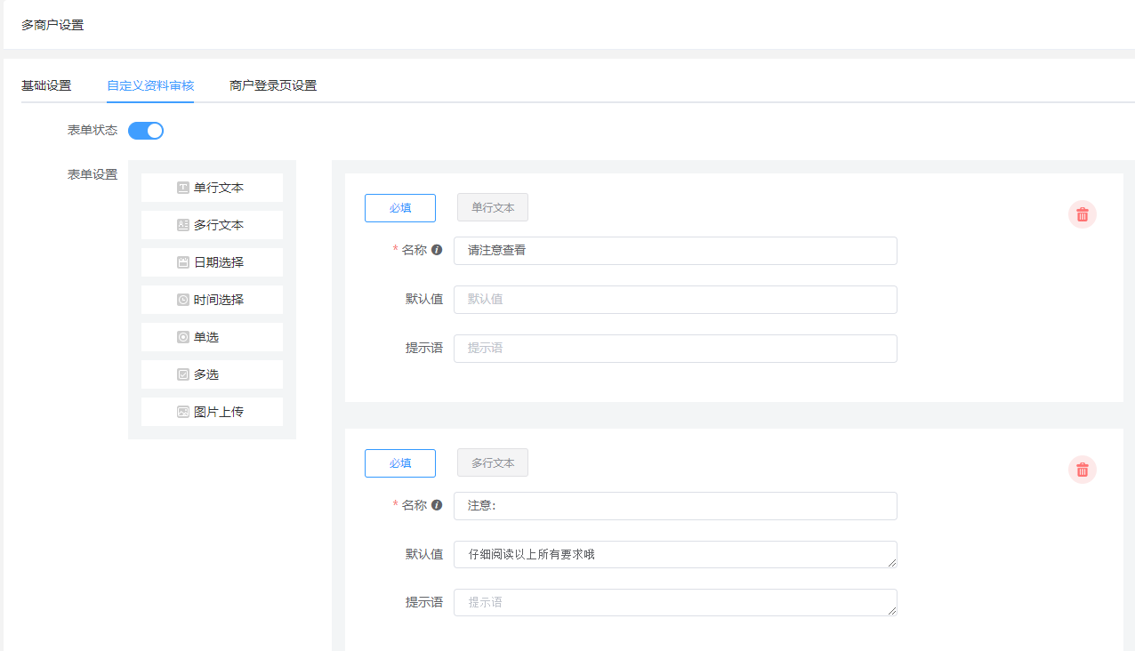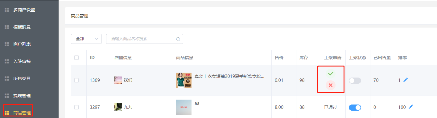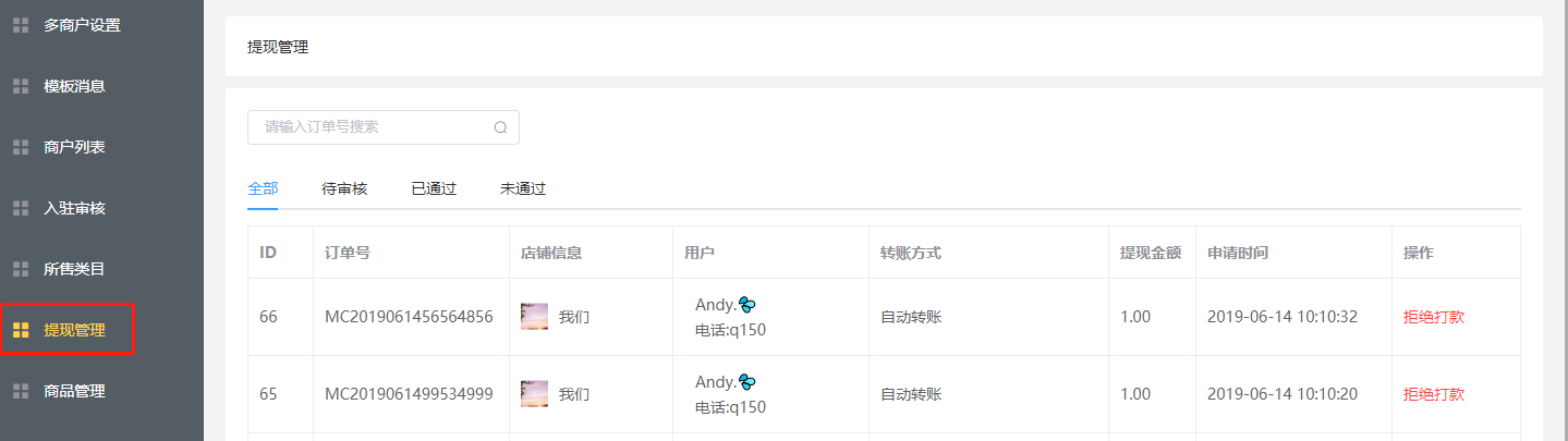 ### 多商户插件介绍  ### 1.基础设置 前言:多商户是配合商城主应用才能使用  支持选择提现方式,多商户的用户在申请提现时使用 客服图标(开启) 商户距离排序 商品上架审核 订单确认收货  1.商户距离排序(开启)  2.商品上架审核(开启)(在多商户-->商品管理里查看)  3.自定义资料审核  4.图片类型支持普通图片、营业执照、身份证  5.小程序端演示图  6.商户登录页设置  7.pc端演示图  ### 2.模板消息 可以点击一键添加模板消息(也可以手动添加:模板的内容和顺序请严格按照教程说明!!!) 生成测试二维码,扫码查看效果  ### 3.商户列表  1.多商户用户可以登录入驻商pc网址  2.可以查看用户的店铺信息   3.可以开启分销  4.可以修改用户的登录密码  5.可以删除用户的店铺  ### 4.入驻审核 可以查看待审核、通过、未通过的店铺信息  点击审核  查看基本信息  商户信息  自定义审核资料  审核信息 可选择审核通过或者不通过 审核结果对申请用户可见  ### 5.所售类目  1.添加类目(添加的分类可以让用户在添加商品的时候选择)  ### 6.提现管理  ### 7.商品管理 多商户-->多商户设置里面开启了商品上架审核的话,在这边审核  点击详情可以查看商品详情 点击删除可以删除商品 ### 8.订单管理  只支持查询、筛选、批量导出、查看订单详情 ### 9.多商户用户端  1.商品管理  2.订单管理  3.财务管理  4.用户管理  5.多商户用户手机端  ### 10.分销功能 首页商城必须开启分销层级 1进插件中心-商户列表-找到要开启的商户-点设置开启分销   2.商户登陆自己的后台-店铺设置开启分销  3.商户给自己的商品设置分销佣金