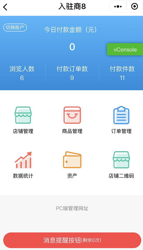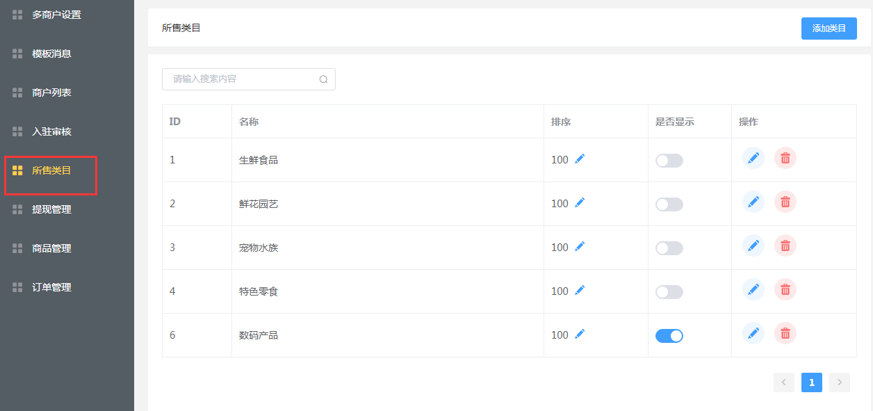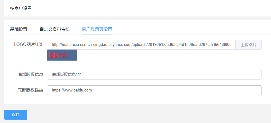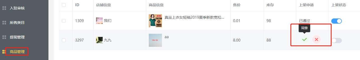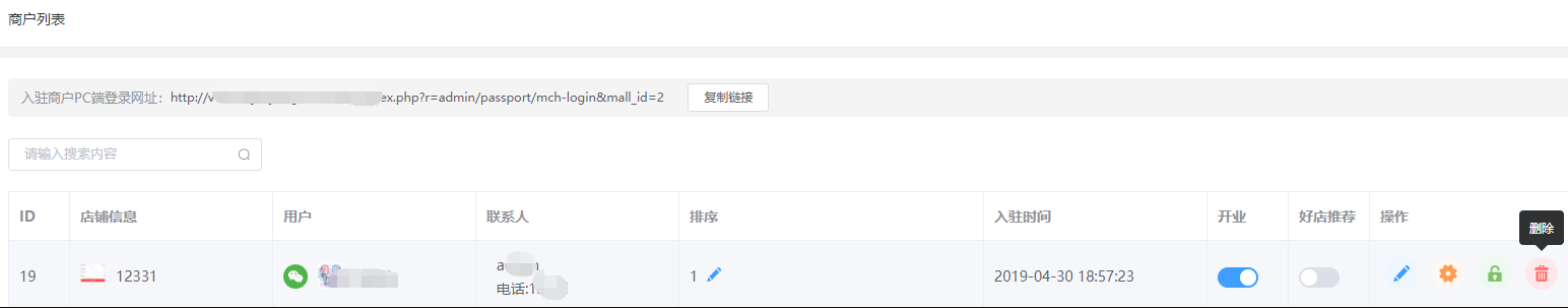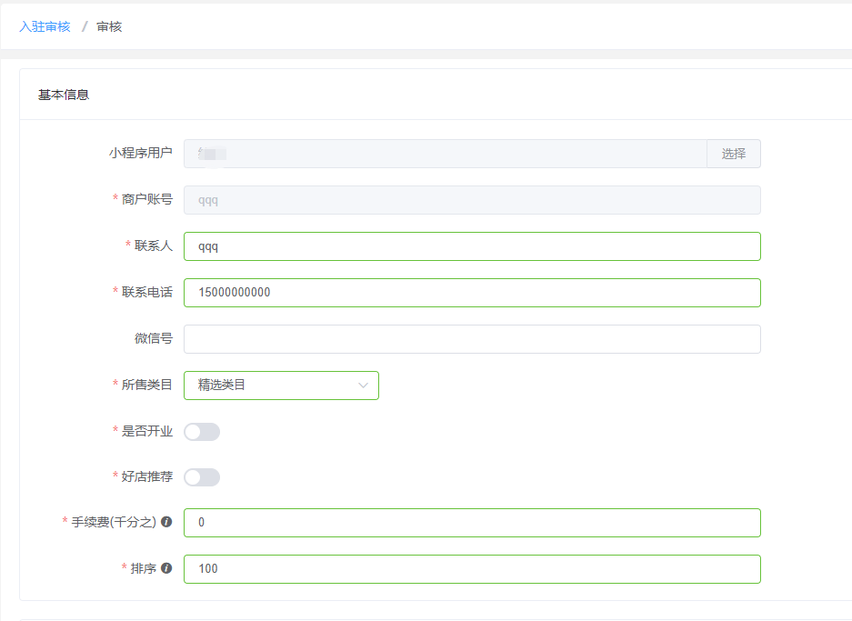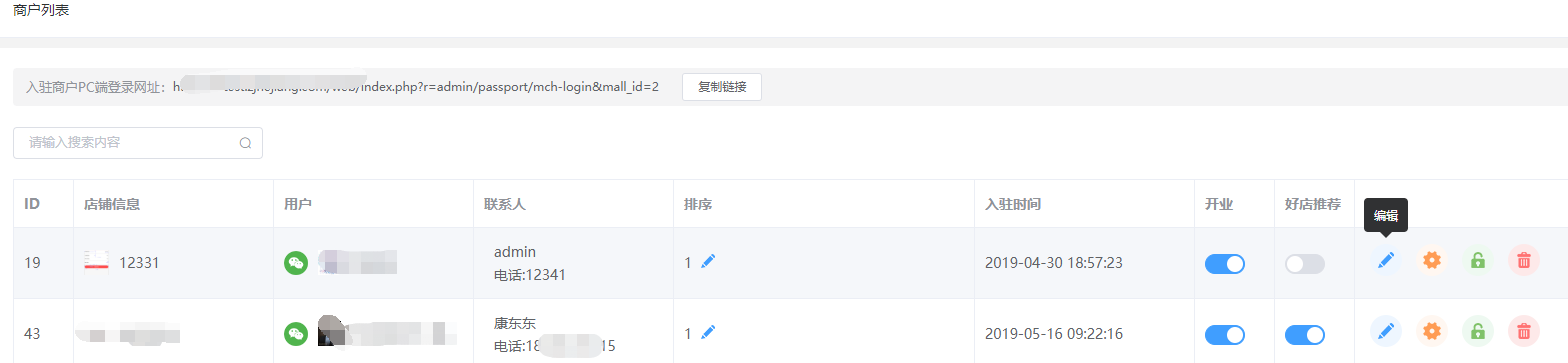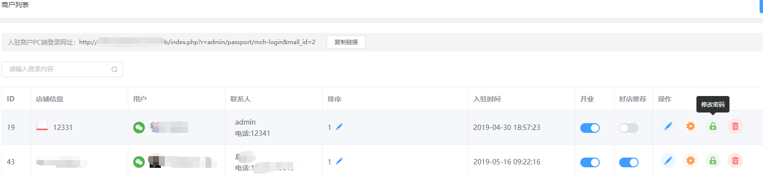 ### 多商户插件介绍  ### 1.基础设置 前言:多商户是配合商城主应用才能使用  支持选择提现方式,多商户的用户在申请提现时使用 客服图标(开启) 商户距离排序 商品上架审核 订单确认收货  1.商户距离排序(开启)  2.商品上架审核(开启)(在多商户-->商品管理里查看)  3.自定义资料审核  4.图片类型支持普通图片、营业执照、身份证  5.小程序端演示图  6.商户登录页设置  7.pc端演示图  ### 2.模板消息 可以点击一键添加模板消息(也可以手动添加:模板的内容和顺序请严格按照教程说明!!!) 生成测试二维码,扫码查看效果  ### 3.商户列表  1.多商户用户可以登录入驻商pc网址  2.可以查看用户的店铺信息   3.可以开启分销  4.可以修改用户的登录密码  5.可以删除用户的店铺  ### 4.入驻审核 可以查看待审核、通过、未通过的店铺信息  点击审核  查看基本信息  商户信息  自定义审核资料  审核信息 可选择审核通过或者不通过 审核结果对申请用户可见  ### 5.所售类目  1.添加类目(添加的分类可以让用户在添加商品的时候选择)  ### 6.提现管理  ### 7.商品管理 多商户-->多商户设置里面开启了商品上架审核的话,在这边审核  点击详情可以查看商品详情 点击删除可以删除商品 ### 8.订单管理  只支持查询、筛选、批量导出、查看订单详情 ### 9.多商户用户端  1.商品管理  2.订单管理  3.财务管理  4.用户管理  5.多商户用户手机端  ### 10.分销功能 首页商城必须开启分销层级 1进插件中心-商户列表-找到要开启的商户-点设置开启分销   2.商户登陆自己的后台-店铺设置开启分销  3.商户给自己的商品设置分销佣金
