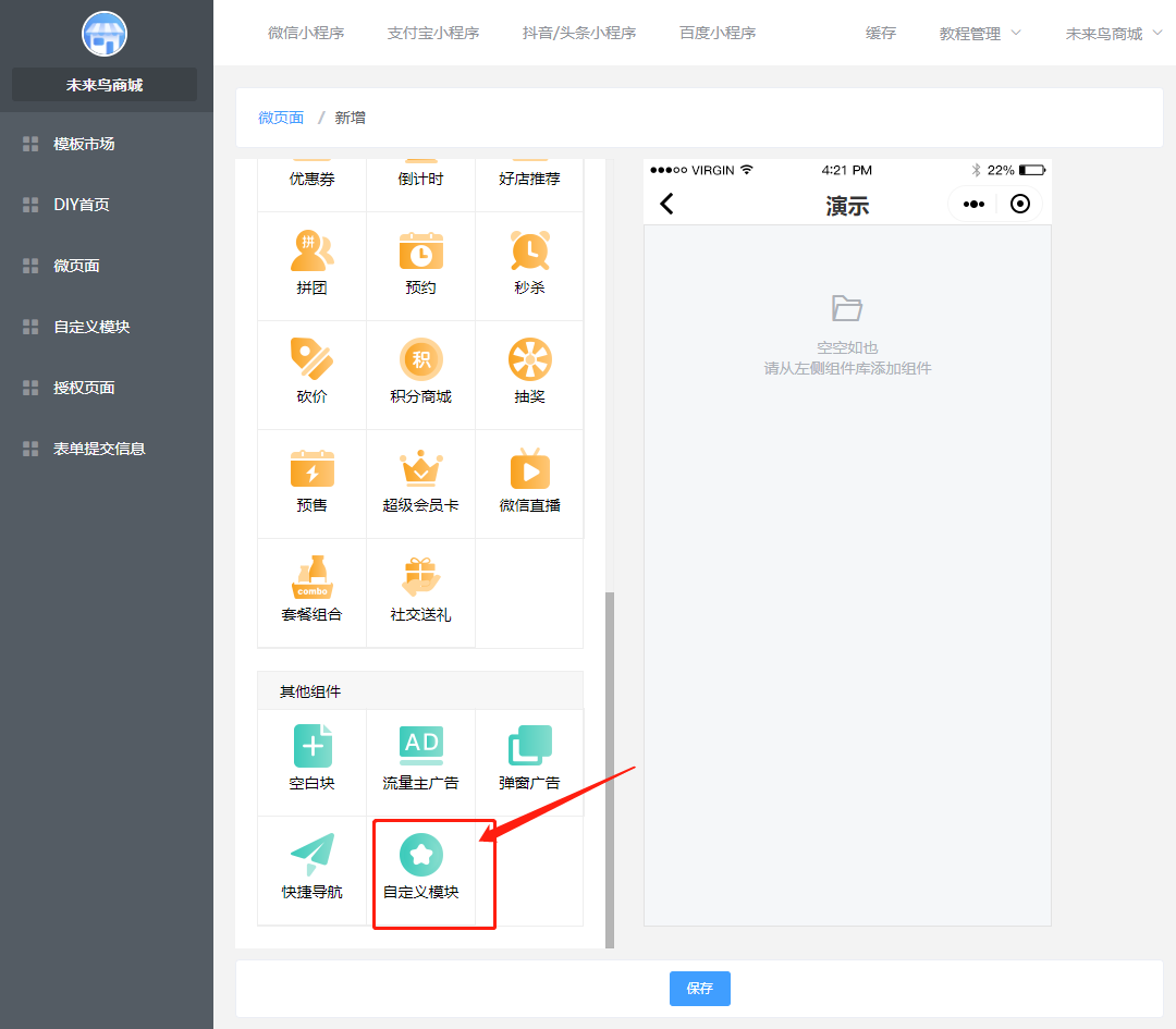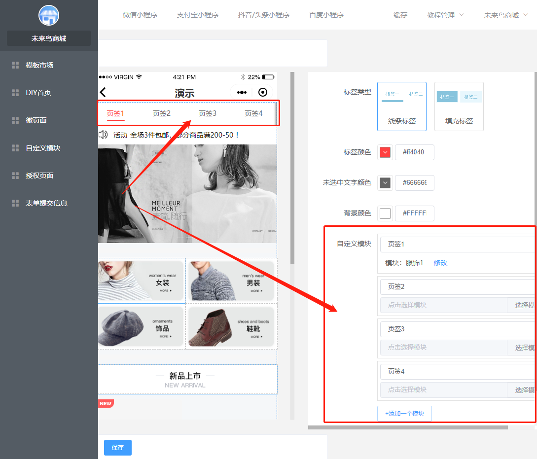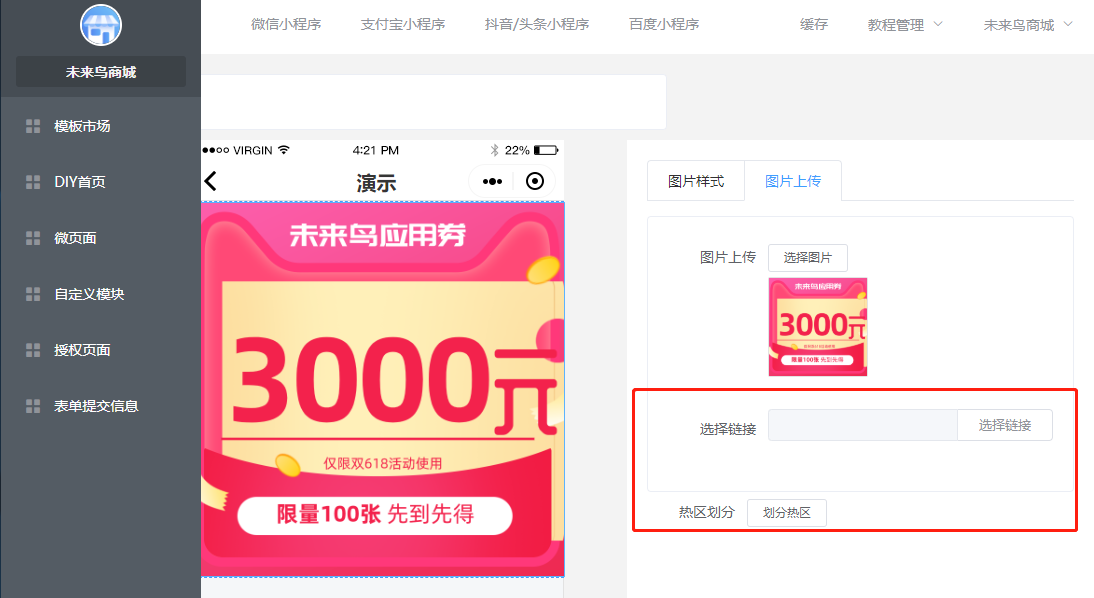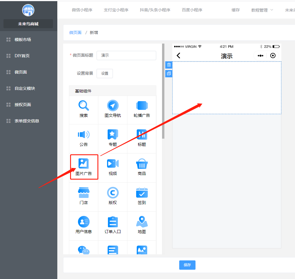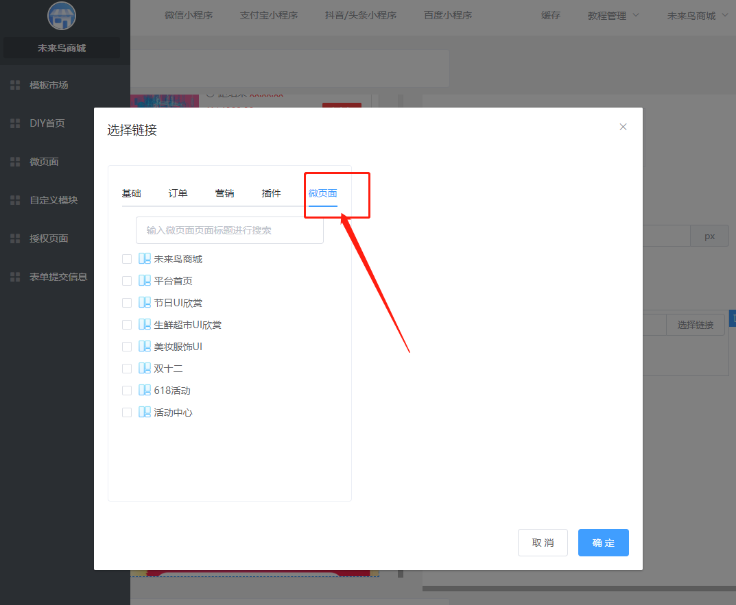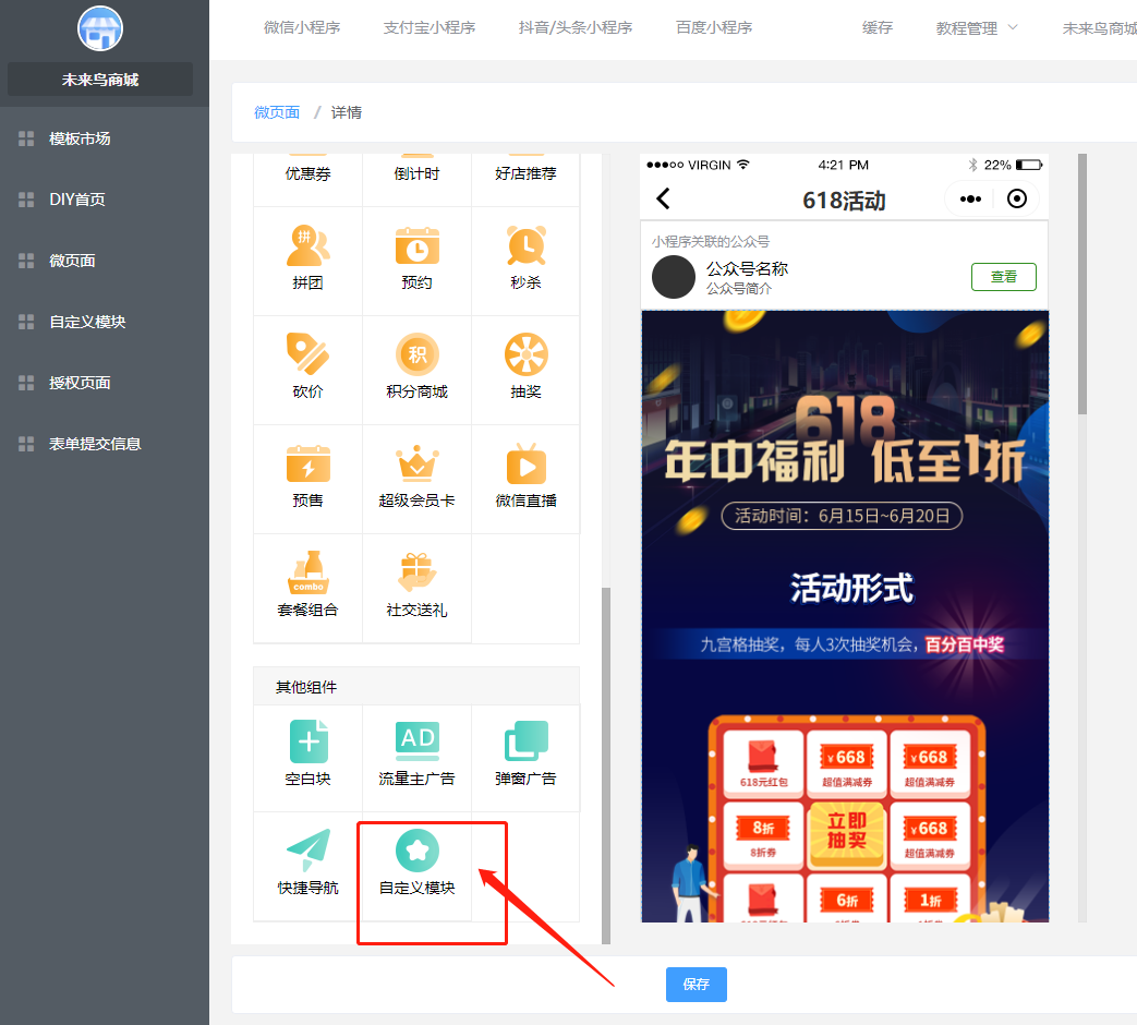 ## 一.商城UI的创建 ### 1.进入低代码设计插件  ### 2.创建或新建微页面  ### 3.选择模版  找到适合的模版,然后选择加载,如果是有一定UI设计基础,可以选择使用空白模版自定义设计。  加载成功以后,就可以去低代码DIY了 ### 4.编辑DIY页面  ==如果是第一次接触低代码DIY设计,请点击学习下新手引导== 左边可以选择:所有基础组件,营销组件,其他组件等,也可以做下页面设置和背景设置 右边可以选择:风格,细节调整,样式更换,以及链接的选择 整个编辑完,可以选择右下角的保存  ### 5.微页面设置首页UI 保存以后,返回微页面,设置首页  **当然了,您也可以在这里进行,UI的编辑,推广,首页设置渠道设置,设置浏览权限和分享设置等等**  到这里一般的低代码UI设计,就OK了,操作非常简单,就跟以前QQ空间DIY一样 ## 二.自定义模块使用(进阶)  ### 1 创建自定义模块   ** 注意:唯一性组件例如快捷导航,关注公众号这种在微页面中设置,要使用自定义模块 ** ### 2.设置首页 创建好微页面之后设置为首页  ### 3.其他地方调用 其他地方调用微页面(首页不需要) ### 4.链接器选择 在选择链接的地方,选择微页面  ### 5.页签设置 **在微页面使用自定义模块组件——添加模块(选择模板)——再次点击添加模块(添加页签)——编辑页签**   ## 三.图片广告热区使用方法 ### 1 选用图片广告组件 (右边选择图片样式,上传图片)   ### 2 划分热区 直接选择链接或者划分热区:热区功能表示可以在一个图片中点击不同的区域跳转不同的链接   ## 四.自定义授权页面使用规则  **当开启开关,可以使用自己上传的授权图片来替换默认的授权弹框图片,点击划分热区,设置登陆区域跟取消区域**  ## 五.模板市场使用  ## 六.关于DIY插件的介绍