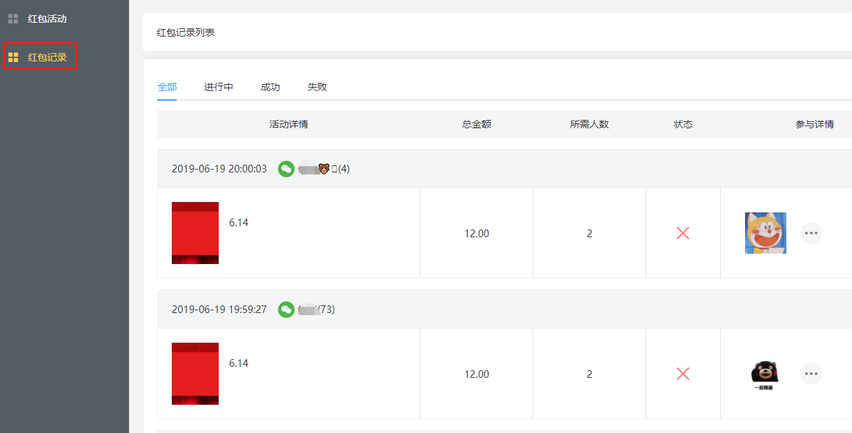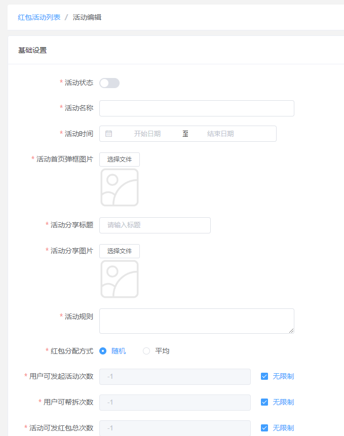 ### 关于裂变拆红包   #### 添加红包活动   #### 红包记录  #### 推荐设置 - 推荐商品状态开启,则用户拆开红包后有推荐商品 - 关闭自定义推荐商品的话,是按商品列表排序显示前10件商品;开启自定义推荐,根据添加的商品排序(最多显示20个商品)  #### 小程序端演示  #### 小程序端演示