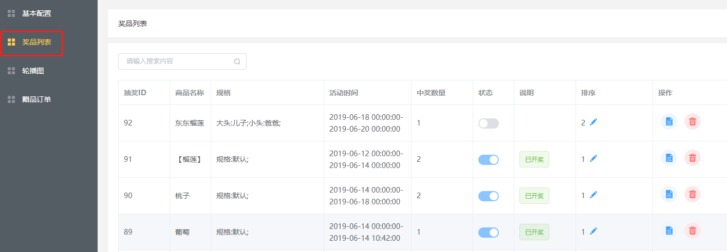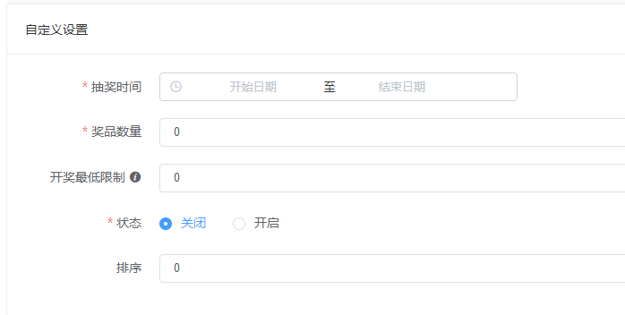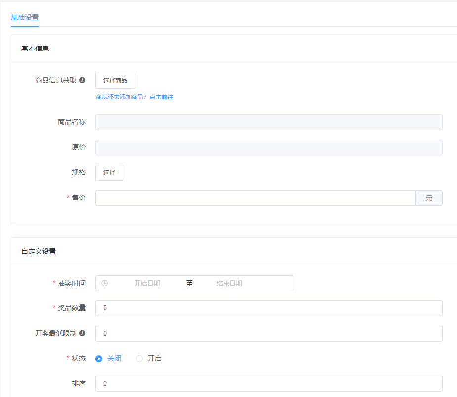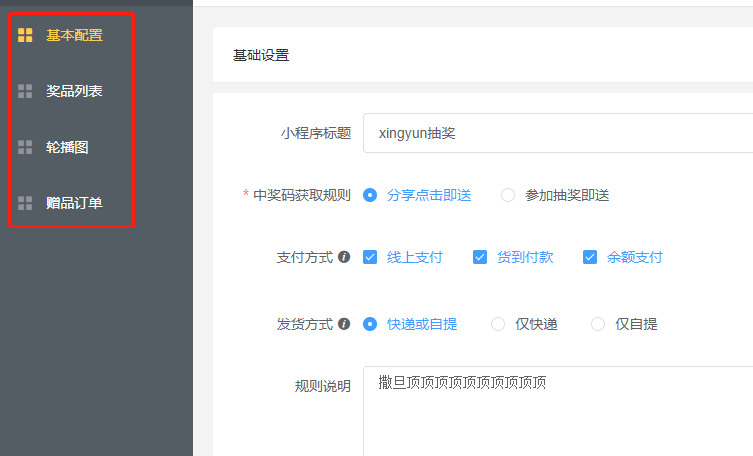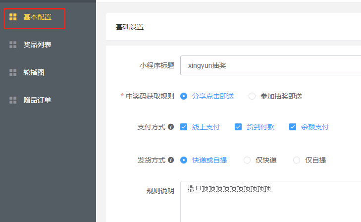 ### 关于幸运抽奖  ### 幸运抽奖  ### 基础设置 #### 基础设置 - 标题,抽奖页面标题自定义 - 中奖码获取规则:分享点击即送,分享出去 其他用户点击授权之后即送 ; 参与抽奖即送,用户点击分享链接并且必须参与活动才送 - 支持单独设置支付方式 - 支持单独设置发货方式 - 规则说明:在活动详情点击流程查看规则  ### 奖品列表 #### 奖品列表  #### 添加奖品  - 只能信息获取选择商品 - 不再支持单独添加抽奖商品,所有的商品都从商城:商品管理-->商品管理里添加 - 商品名称、原价不支持修改 - 选择商品之后指定一个规格参与活动  #### 自定义设置 - 设置活动开始日期,结束日期 - 奖品数量 - 开奖最低限制:值必须大于等于0 - 排序(在抽奖首页生效) - 状态(开启关闭) - 奖品设置好之后只能删除 无法编辑  ### 轮播图 #### 轮播图  #### 点击添加轮播图点击添加轮播图  - 点击开启编辑  - 添加轮播图  - 支持的跳转链接 ### 赠品订单 #### 赠品订单