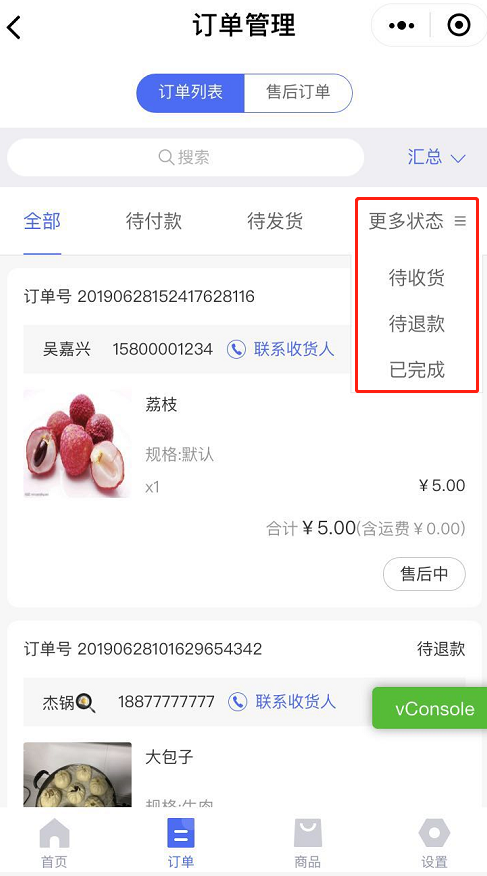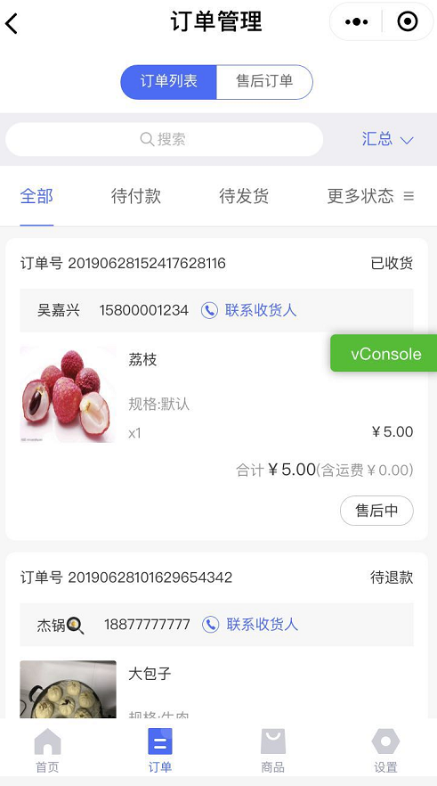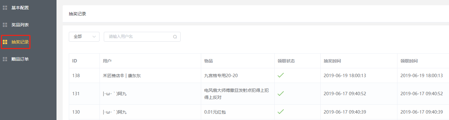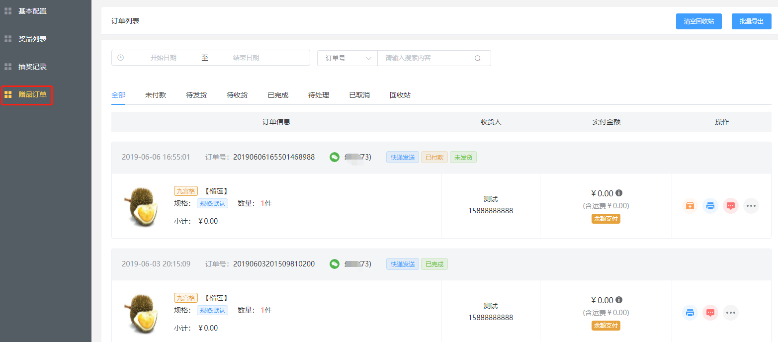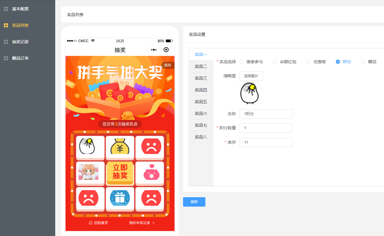 ### 关于九宫格抽奖   ### 基本配置 #### 九宫格抽奖设置  - 设置中奖几率:万分之xx - 注意:该中奖几率是指每次抽奖的中奖几率,先判断该次抽奖是否中奖,在中奖的情况下,从有库存的奖品中随机抽取,库存越大,几率越高。 - 抽奖规则设置: - 一天N次 指每个人每天的抽奖次数; - 一人N次 指每个人该次活动时间内一共能抽奖次数 - 消耗积分:每次抽奖需要消耗积分,不填或者填0不消耗积分 - 支持单独设置支付方式 - 支持单独设置发货方式 ### 奖品列表 #### 奖品列表  - 奖品可设置谢谢参与(默认),余额红包(余额),优惠券,积分,赠品(商城商品),必须要有一个谢谢参与 - 可设置库存,抽中既减少库存,注意:商品中奖之后发货是根据该商品管理中的库存去判断,诺该商品没有库存,会提示无法兑换 ### 抽奖记录 #### 抽奖记录 用户抽奖记录列表  ### 赠品订单 #### 订单列表  ### 手机端管理 #### 手机端管理 安装完插件后,在管理员列表添加管理员  添加完后去小程序管理-->用户中心选择插件-->商城管理。  #### 小程序端演示  #### 商城管理首页  - 可以筛选支付金额、支付订单数、支付人数、支付件数 - 支持全部、砍价、预约、积分、秒杀、拼团插件 #### 订单管理 - 首页的订单消息:用户下单、申请取消订单(也叫退款提醒)、申请售后的时候首页出现数字提醒,直到操作该笔订单。点击订单,可以直接进行查看处理   #### 订单管理 - 订单右侧显示订单状态。 订单列表  - 汇总:汇总里面有可以进行筛选,今日、昨日、7日、自定义  - 更多状态:待收货、待退款、已完成  - 售后订单  #### 审核消息 - 审核消息:有多商户插件的用户申请开店、开启分销中心后申请成为分销商,在这里显示。如果没有多商户插件只显示分销商审核消息,不开启分销中心有多商户插件则只显示多商户审核消息,如果两者都没有,整个审核消息关闭。 ##### 入驻商  - 入驻商审核详情  #### 分销商 - 分销商审核直接选择通过or拒绝  #### 提现申请 - 提现申请:多商户申请提现和分销商申请提现。如果只有多商户则只显示多商户的,只开启分销则只显示分销商的,如果两者都没有,整个提现申请关闭。  未审核里点击通过去未打款  #### 评论管理 - 评论管理:显示用户对商品的评价。  - 支持回复、隐藏。  - 回复的评论在已回复查看,支持修改、隐藏。  #### 用户管理 - 用户管理:如果没有开启分销,用户管理里面分销商不显示。 - 全部用户 - 支持充值、扣除积分和金额  #### 分销商  #### 核销员  #### 商品管理  #### 添加商品   - 多规格商品只支持一种规格比如 只有颜色、只有重量等。 #### 商城设置 - 短信通知跟邮件通知按钮如果后台不配置的话,那前端不显示整个按钮。