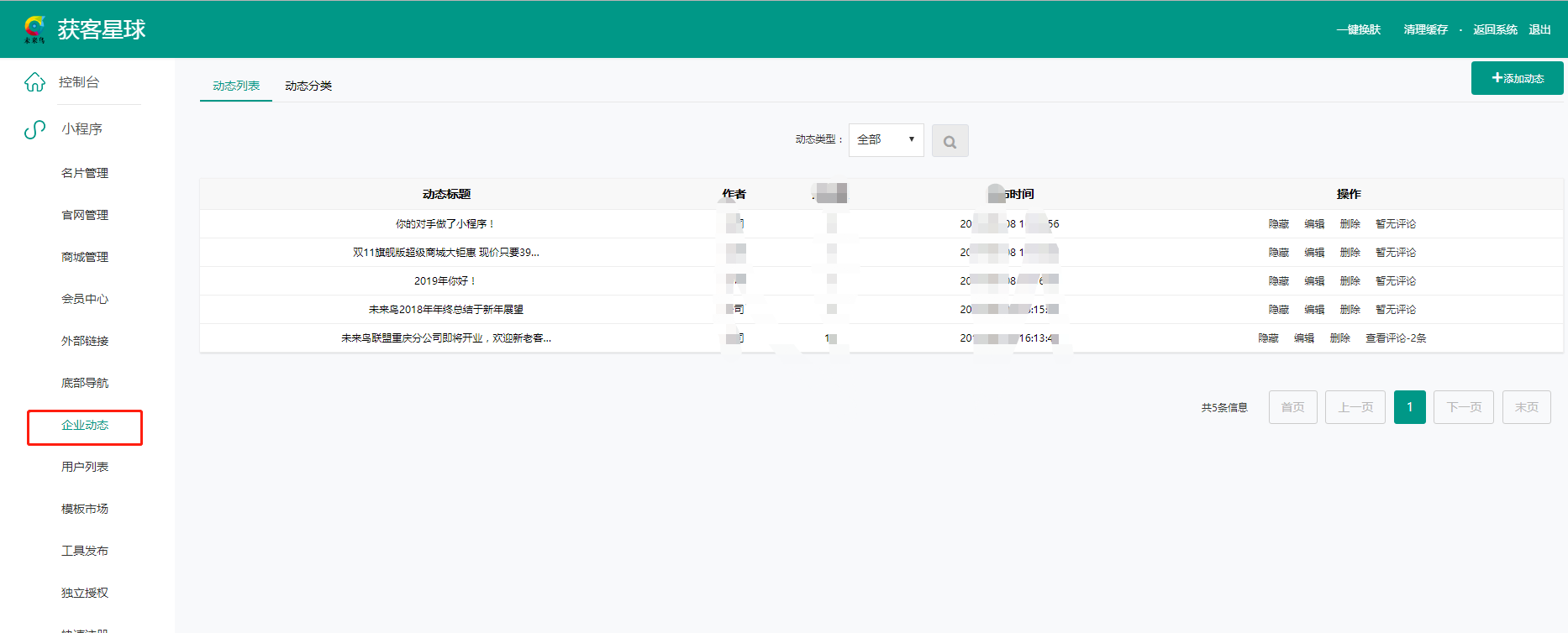 ### 5、企业动态  #### 这里添加发布的动态信息,会显示在小程序端的动态模块里。