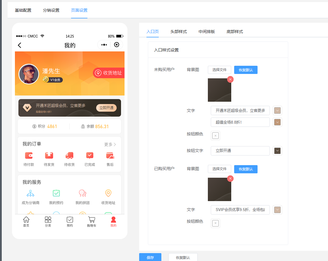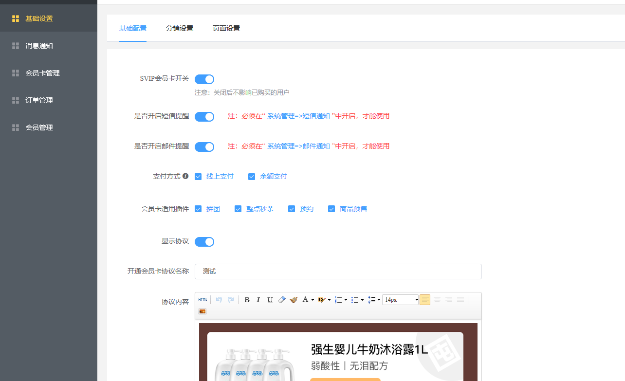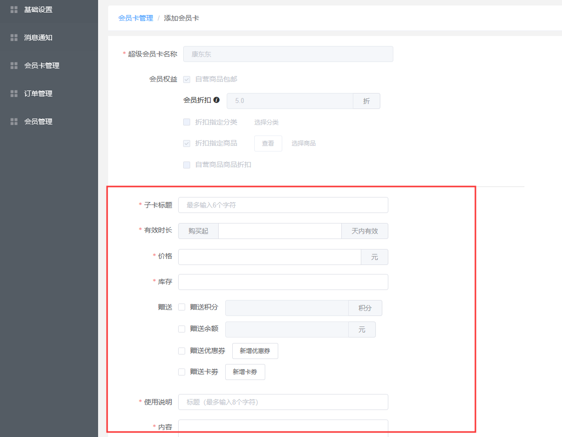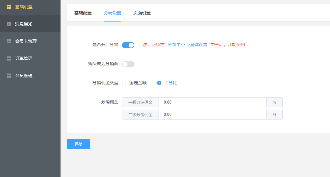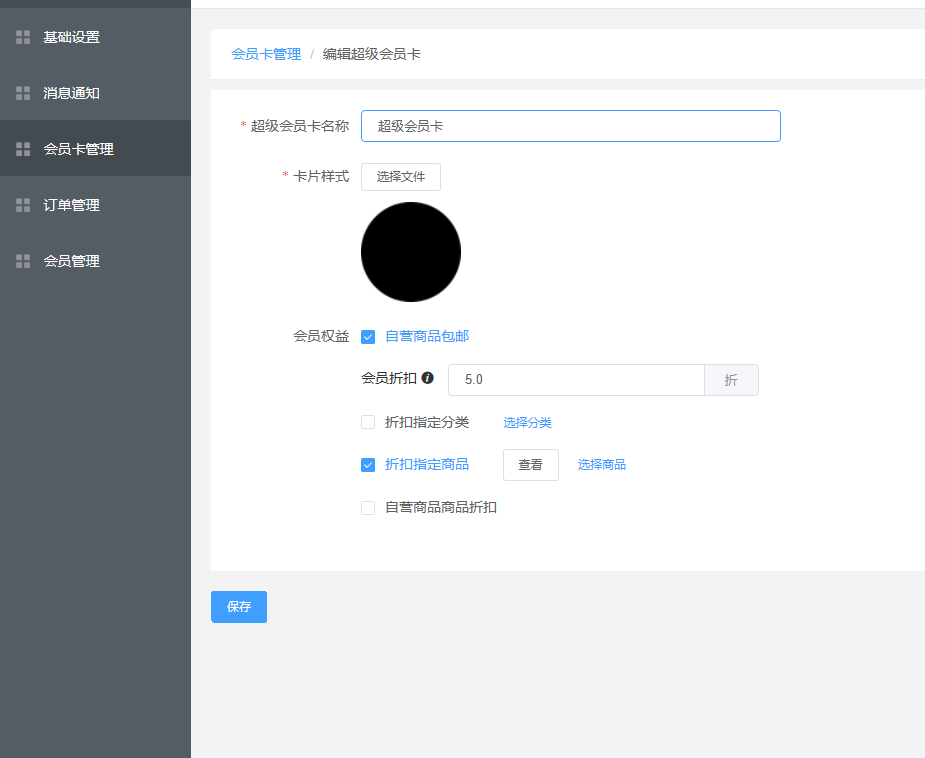 ### 关于超级会员卡     #### 1.SVIP会员卡开关,关闭之后用户中心入口消失  2.分销设置:可以设置单独佣金,也可以设置购买成为分销商  3.自定义设置:可以设置各个会员卡页面的元素  ##### 1.目前会员卡只有一种主卡可以设置权限, (必须添加主卡,否则无法看到用户中心入口) 子卡只是设置赠送规则,价格,时长;  可以设置商城商品包邮,指定分类/商品/全场折扣 ##### 2.子卡内容设置:  ##### 3.使用说明: 1.权益已购买时候为准,举例:购买时候权益为7折,后面改成了5折,则下单结算时候还是7折,若续费了任意一个子卡,则变更为5折 2.开关说明:1.单商品-会员价设置里面有单独的启用开关,若关闭的话,则该商品不会享受超级会员卡折扣