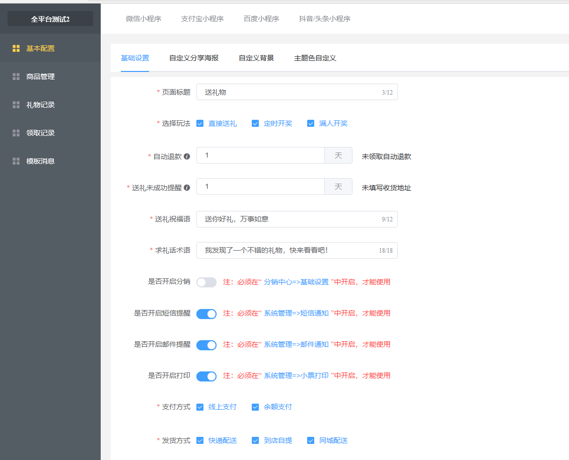 ### 关于社交送礼  ### 基础配置  - 支持修改小程序页面标题; - 支持3种玩法: - 1.直接送礼:可以送单人也可以送多人,当选择单人,则领取人获得所有礼物;当选择多人,每个人只能领取1个礼物; - 2.定时开奖:设置开奖时间,到时间在所有领取人种开奖; - 3.满人开奖:设置人数,当领取人人数满足则开奖; - 自动退款:未领取自动退款时间; - 送礼未成功提醒:领取人不填写地址下单,提醒送礼人未领取成功 - 支持单独分销开关; - 支持单独邮件提醒开关; - 支持单独短信提醒开关; - 支持小票打印; - 支持支付方式跟发货方式的选择; - 支付方式只针对送礼人; ### 商品管理  可以拉取商城商品库商品进行单独的设置