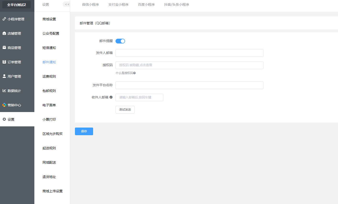 ### 邮件通知 #### 邮件的作用: 用户付款后通知商户 注意:发件人邮箱一定要是QQ邮箱  获取授权码:( 授权码必须是发件人邮箱对应的授权码) 点击链接根据教程来配置,获取授权码 点击测试,可测试发送 *** 注意:输入收件人邮箱需要按回车**
