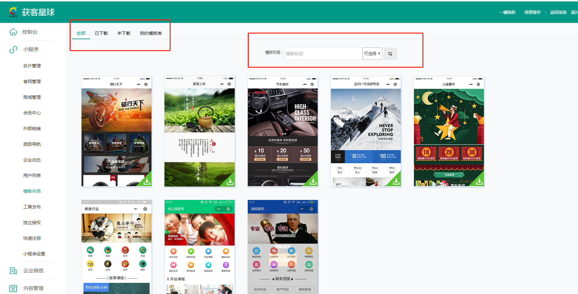 ### 模板市场  显示所有的平台模板,需要下载。 管理员有权限查看所有模板。(限独立部署总管理员)