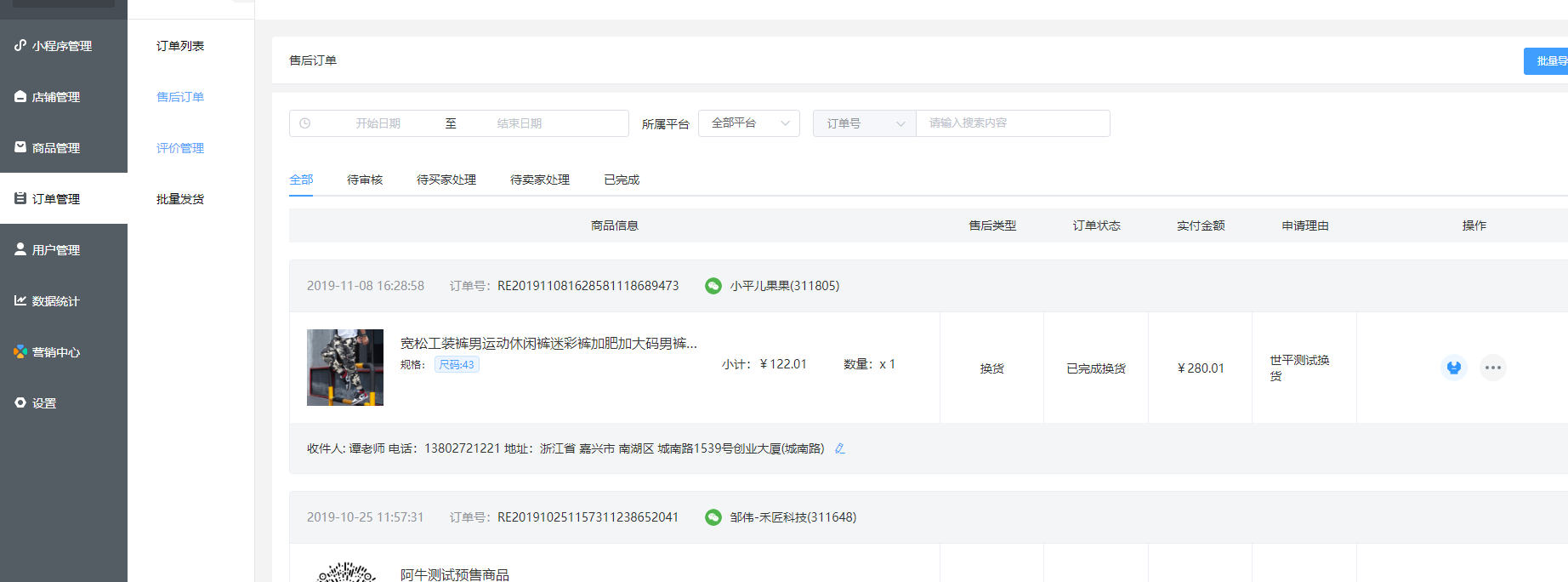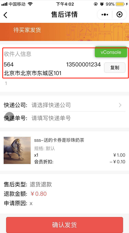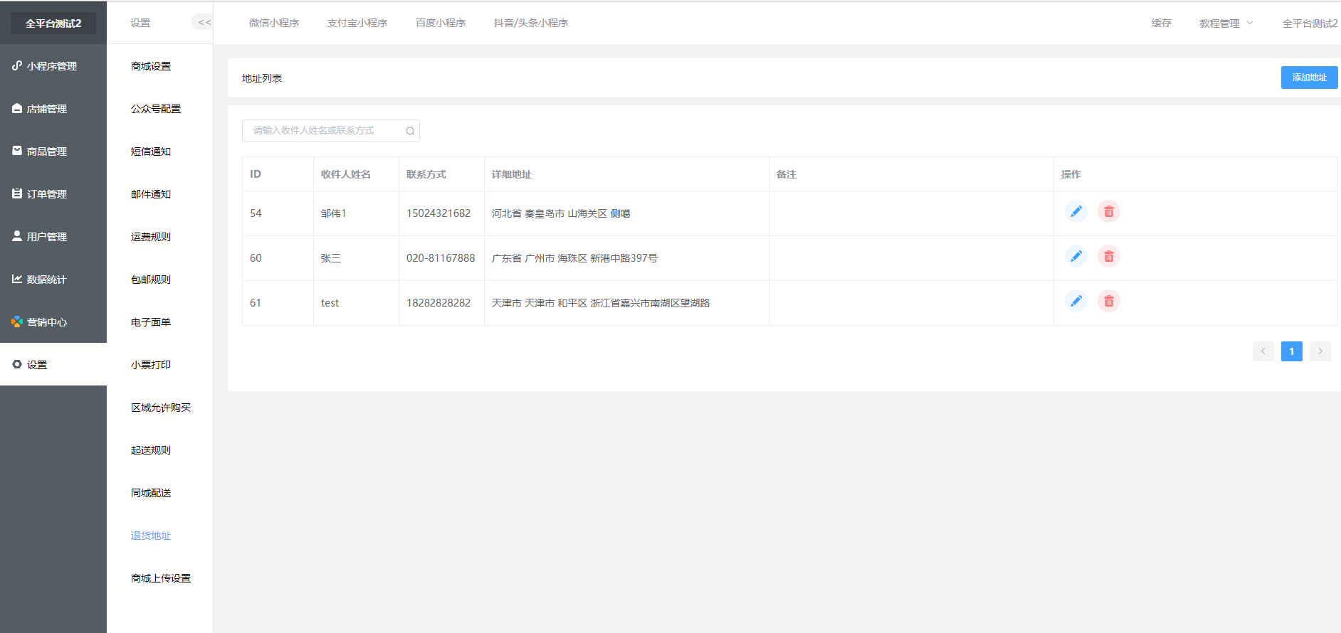 ### 退货地址  ### 注意:退货地址用于消费者申请退货流程的  #### 小程序端:
