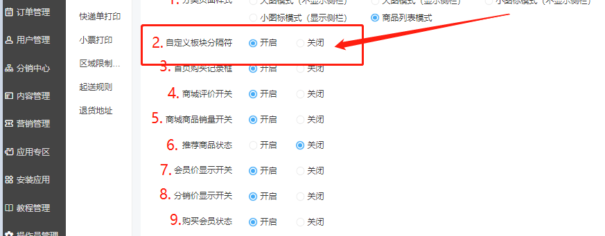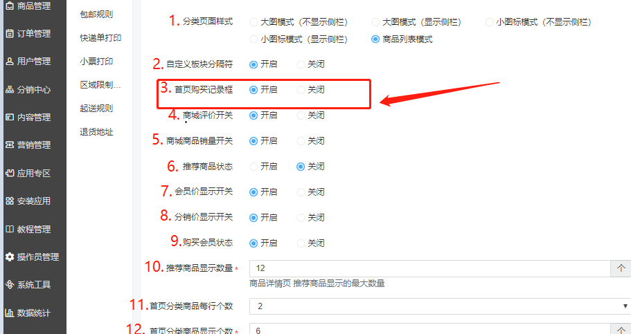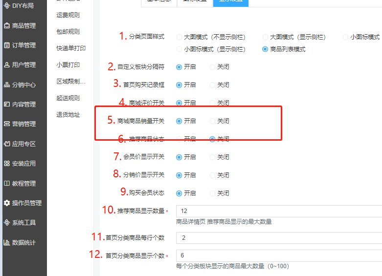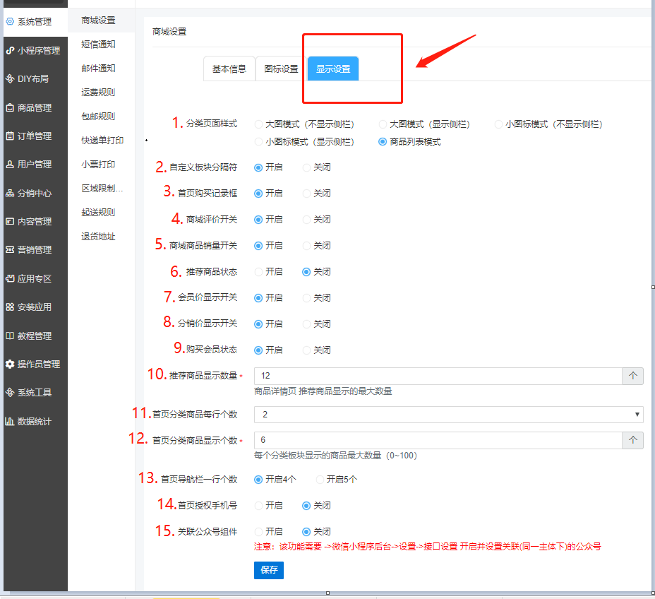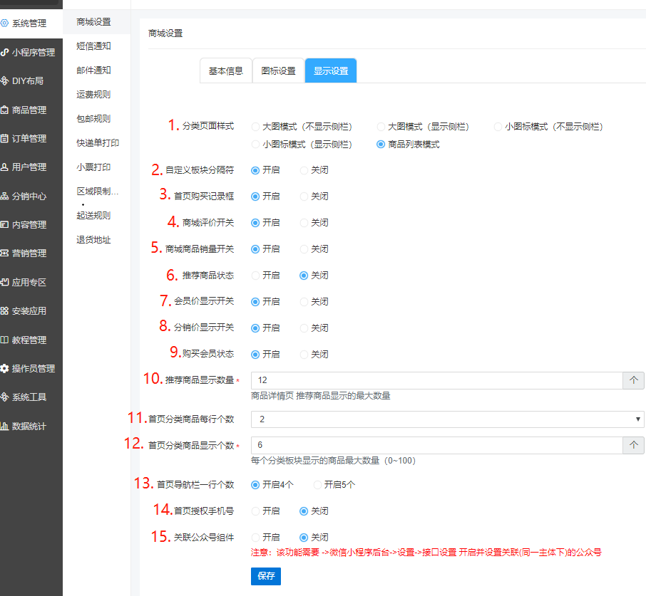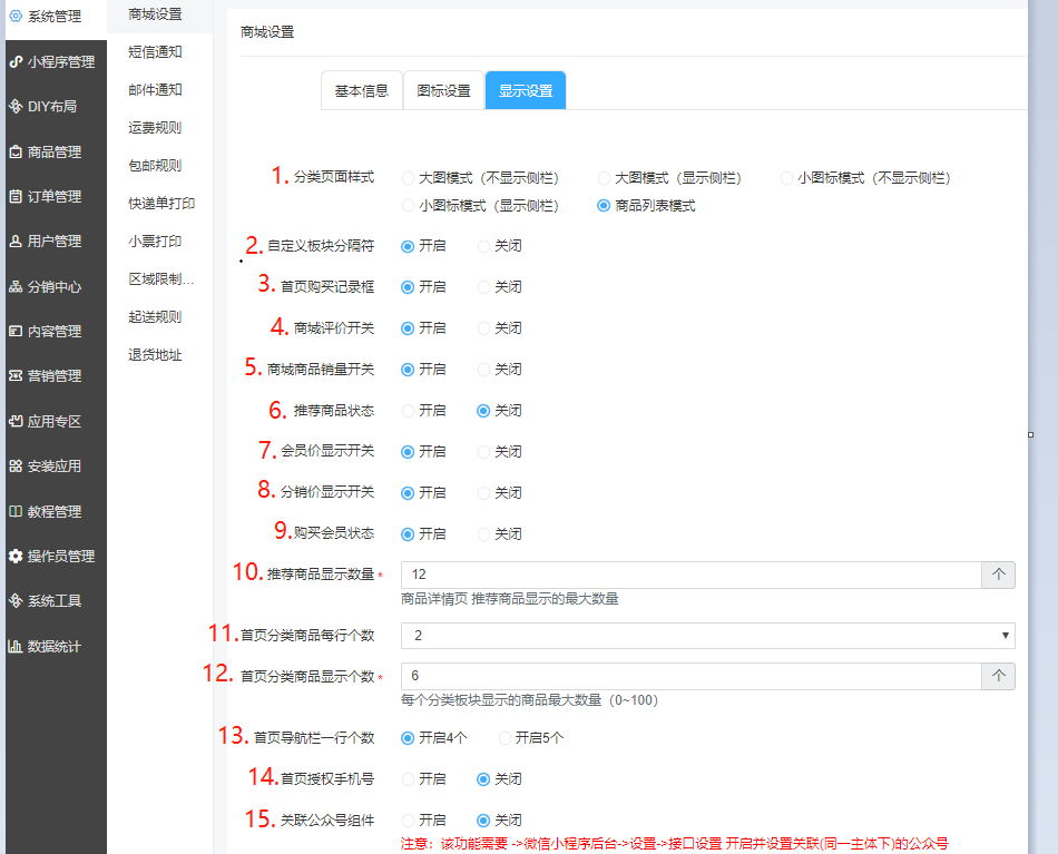 ### 显示设置  ### 分类页面样式 #### 后台: #### 页面样式分类  ##### 注意:切换样式的时候记得清理下小程序缓存,侧栏展示的是二级分类 #### 前台: - 大图模式(不显示侧栏)  - 大图模式(显示侧栏)  - 小图模式(不显示侧栏)  - 小图模式(显示侧栏)  - 商品列表模式  ### 自定义版块分隔符 #### 后台: #### 自定义版块分割符  #### 前台  ### 首页购买记录框 #### 后台: #### 首页购买记录框  ### 商城评价开关 #### 后台: #### 商城评价开关  #### 前台: #### 开启商城评价开关  #### 关闭商城评价开关  ### 商城商品销量开关 #### 后台: #### 商城商品销量开关  ### 推荐商品状态 #### 后台: #### 推荐商品状态  ### 会员价显示开关 #### 后台: #### 会员价显示开关  #### 前台 #### 开启会员价显示开关  #### 关闭会员价显示开关  ### 分销价显示开关 #### 后台: #### 分销价显示开关  #### 前台 #### 开启分销价显示开关  #### 关闭分销价显示开关  ### 购买会员状态 #### 后台: #### 购买会员状态  ### 推荐商品显示数量 #### 后台: #### 推荐商品显示数量  ### 首页分类商品每行个数 #### 后台: #### 首页分类商品每行个数  ### 首页分类商品显示个数 #### 后台: #### 首页分类商品显示个数  ### 首页导航栏一行个数 #### 后台: #### 首页导航栏一行个数  ### 首页授权手机号 #### 后台: #### 首页授权手机号  ##### 注意:发布审核的时候记得关闭,微信审核人员的手机号是没有手机卡的,他们测试不了会不让通过审核的 #### 前台 #### 开启首页授权手机号  ### 首页关联公众号组件 #### 后台: #### 首页关联公众号组件  #### 注意:该功能需要 ->微信小程序后台->设置->接口设置 开启并设置关联(同一主体下)的公众号