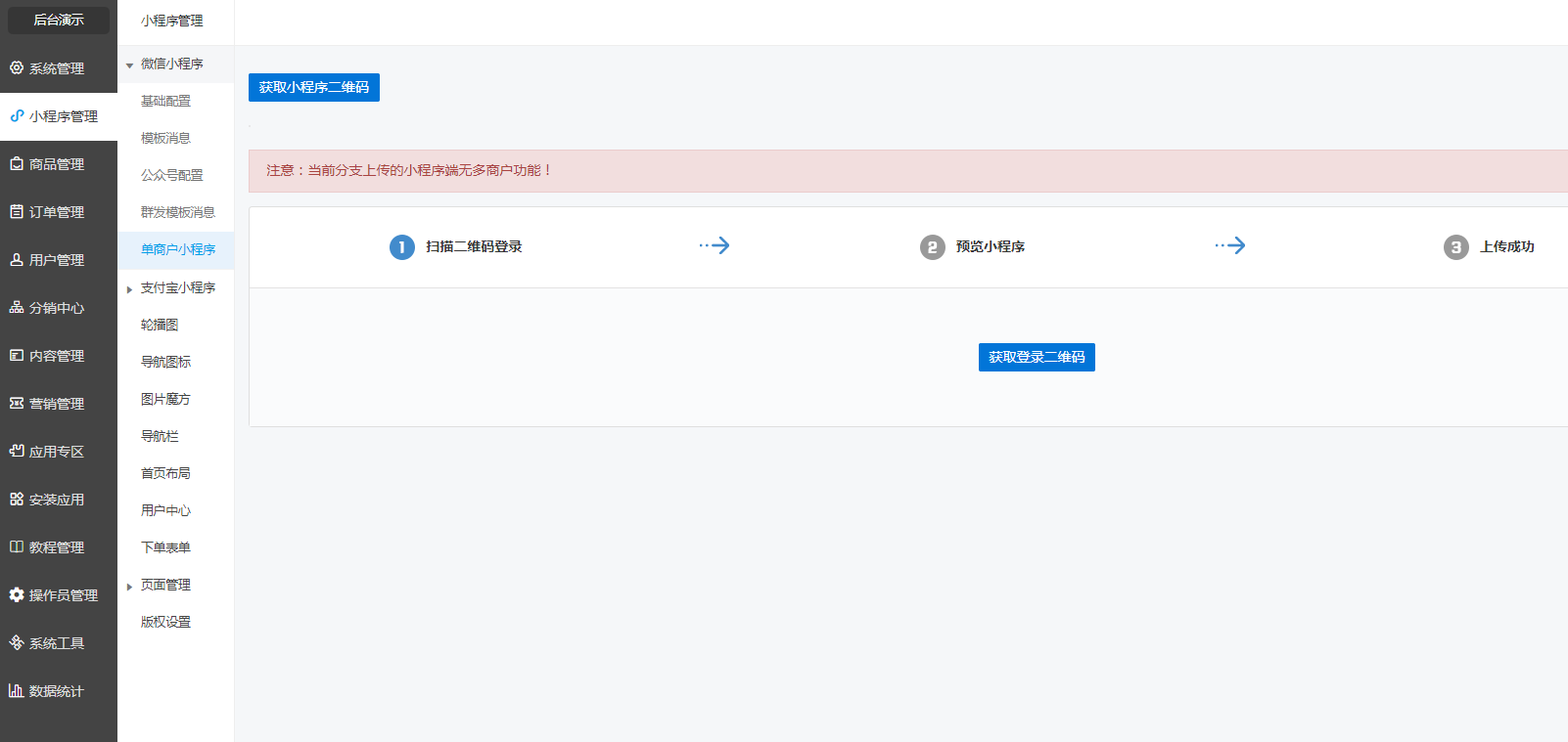 ### 单商户小程序 #### 注意:单商户发布是指,小程序前端去除多商户代码的,多商户功能是用不了的