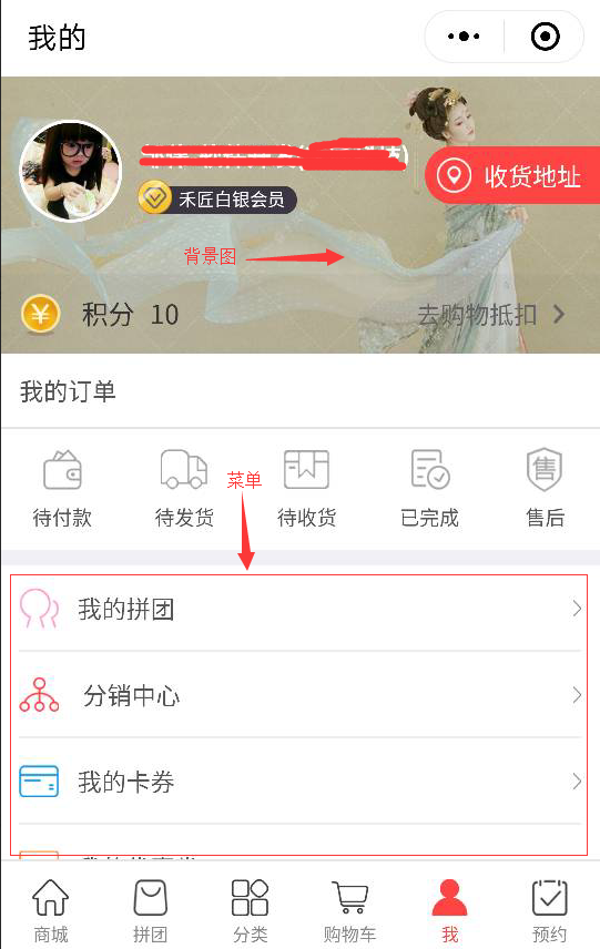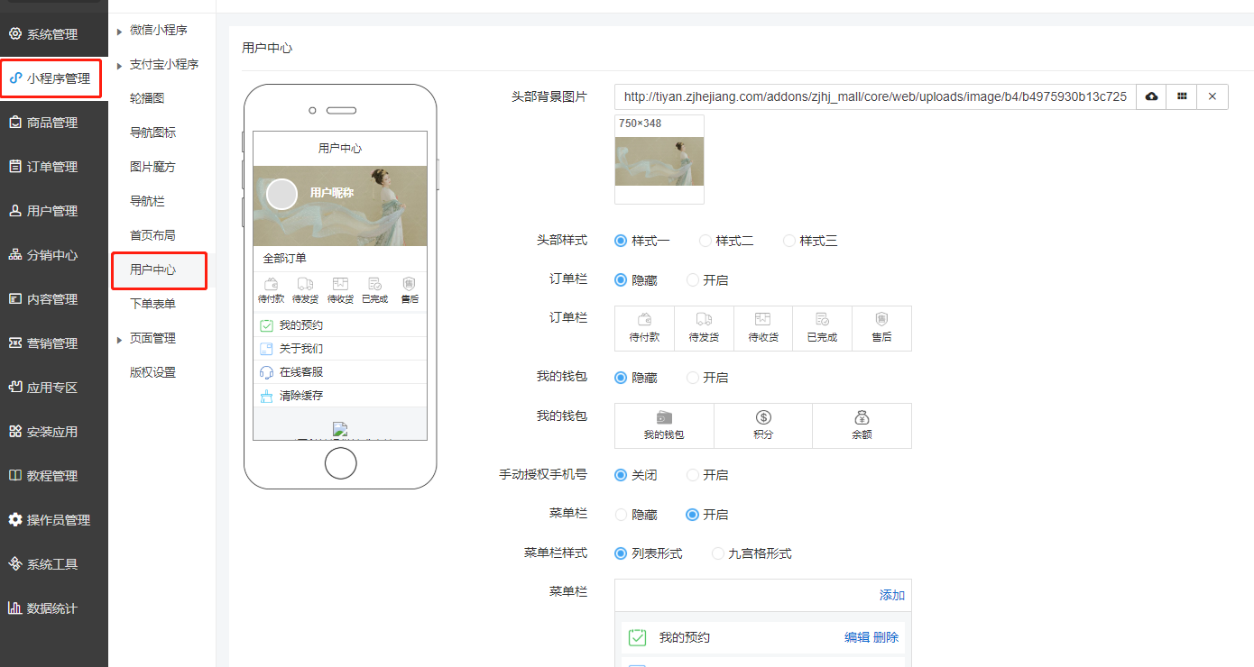 ### 用户中心 #### 请看配置的位置:  #### 说明: - 菜单支持拖动排序 - 菜单支持显示隐藏 - 支持设置用户中心顶部背景图 - 订单栏支持显示隐藏 - 支持订单栏文字和图标自定义 - 我的钱包支持显示隐藏(积分和余额) - *手动授权手机号支持开启关闭 - 头部样式支持三种  - 支持自定义菜单名称 - 菜单栏支持列表形式和九宫格形式  #### 效果图: