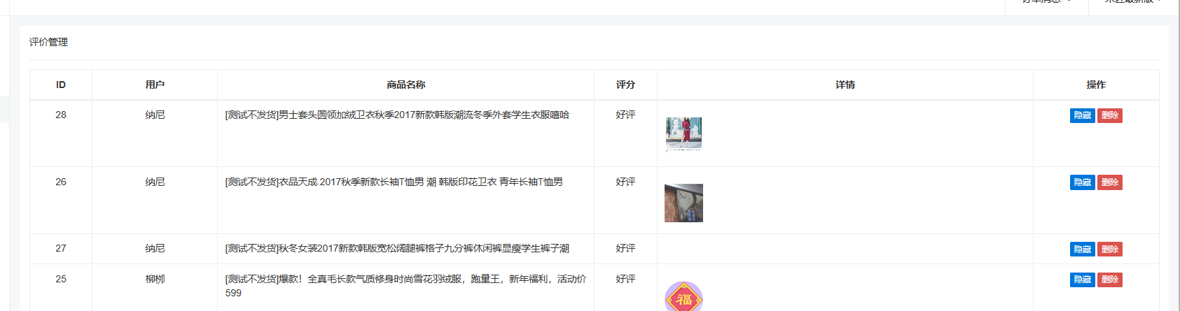 ### 评价管理 #### 评论管理  评论管理主要用于订单完成之后的评论功能,用户可在手机上对已购买商品进行评论,上传图片,在商品详情-评论种展示; 后台可以对这些评论进行管理,可以隐藏,也可删除