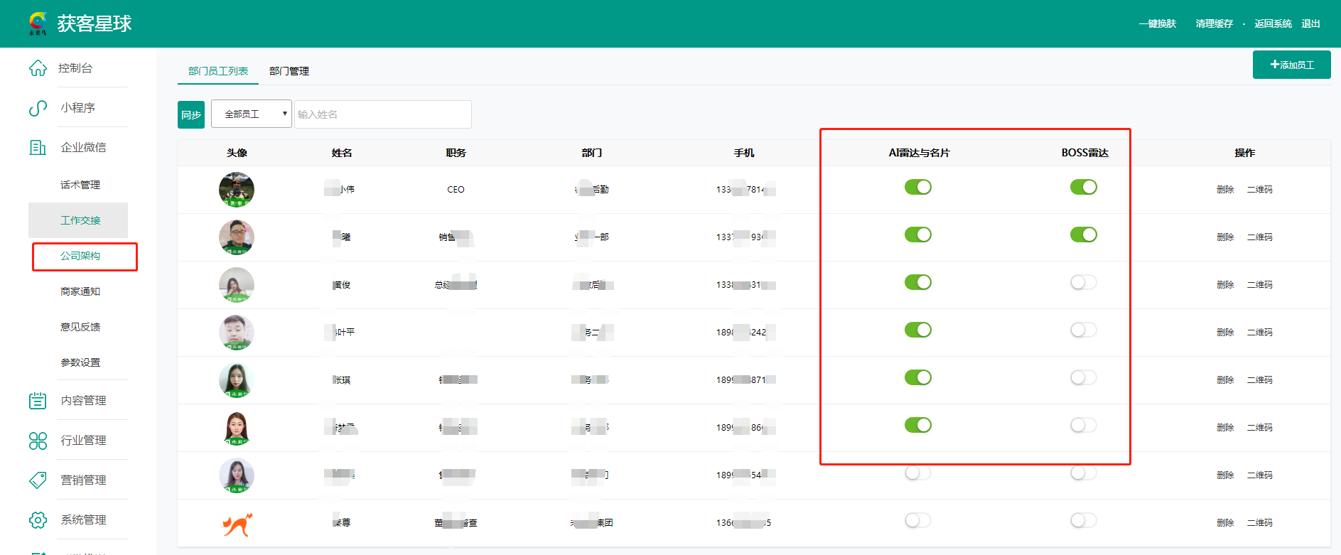 ### 公司架构  - 公司架构,显示所有的部门、员工基本信息。 - 操作时注意,先添加部门,后添加员工。 - 同步至微信:直接覆盖企业微信里的信息。慎用此操作,点击此按钮,会弹出确认对话框。(注意对话框提示内容:会将本平台的数据同步至微信平台,确认同步吗)。 - 重新获取:先清除小程序中涉及员工企业客户这一块的信息,然后获取企业微信里的通讯录数据,如果获取不成功这边也是会删除的。 - 顶部绿色按钮“删除”:是批量删除按钮。