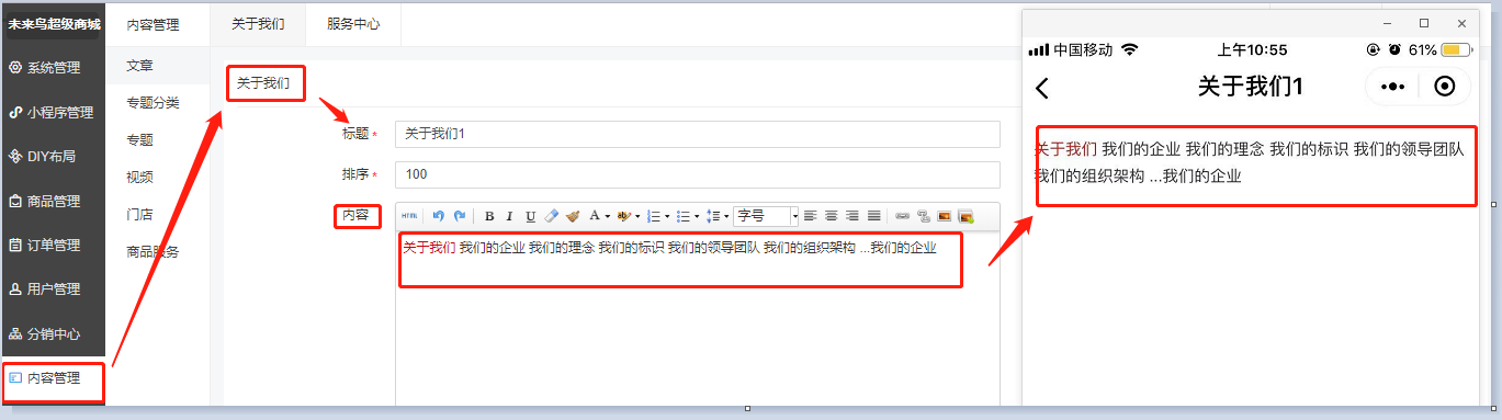### 文章管理 ### 文章管理 文章管理主要用于前端个人中心-服务中心&关于我们 注:可在商城管理-小程序设置-用户中心自行选择开启关闭 #### 1.关于我们: 可在自定义富文本框中编辑内容,在前端展示平台信息; #### 效果图:  #### 2.服务中心: 服务中心可添加多条信息,自己设置排序(默认排序100 越小越前),服务中心一般用于平台帮助说明文档 #### 效果图: