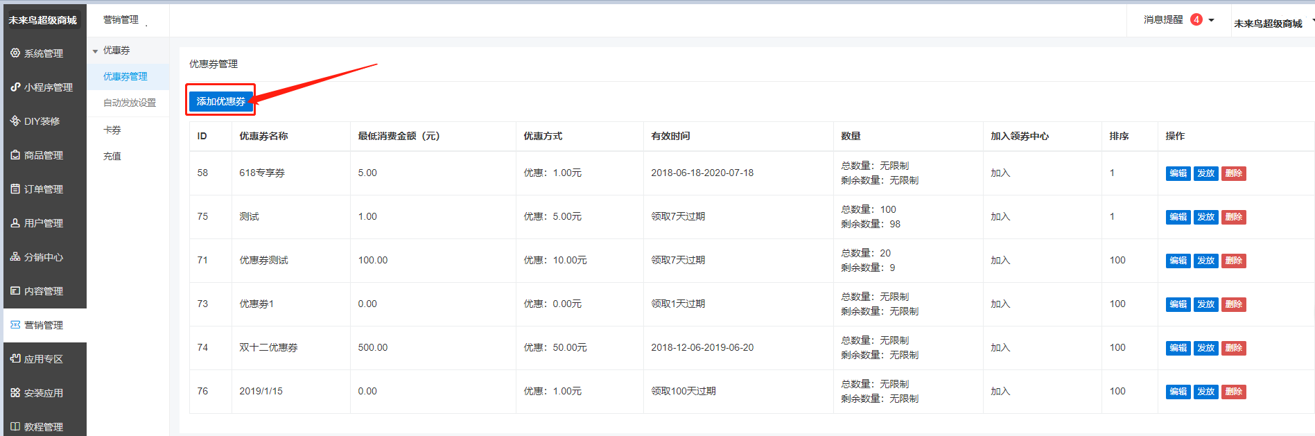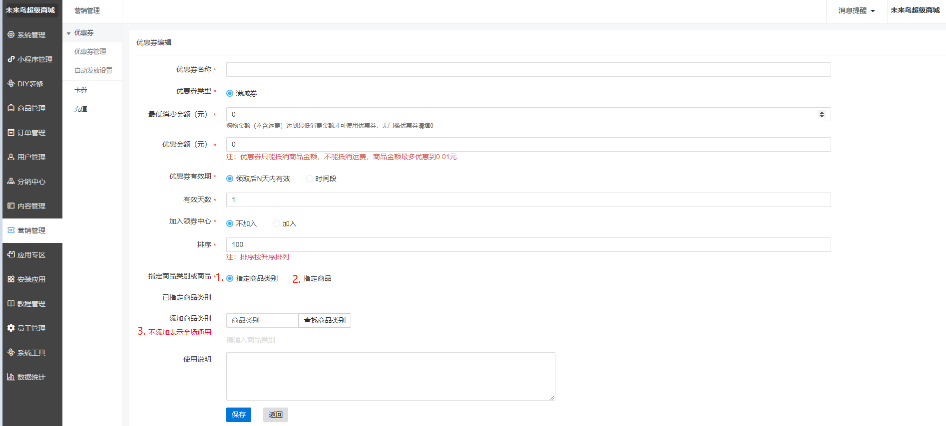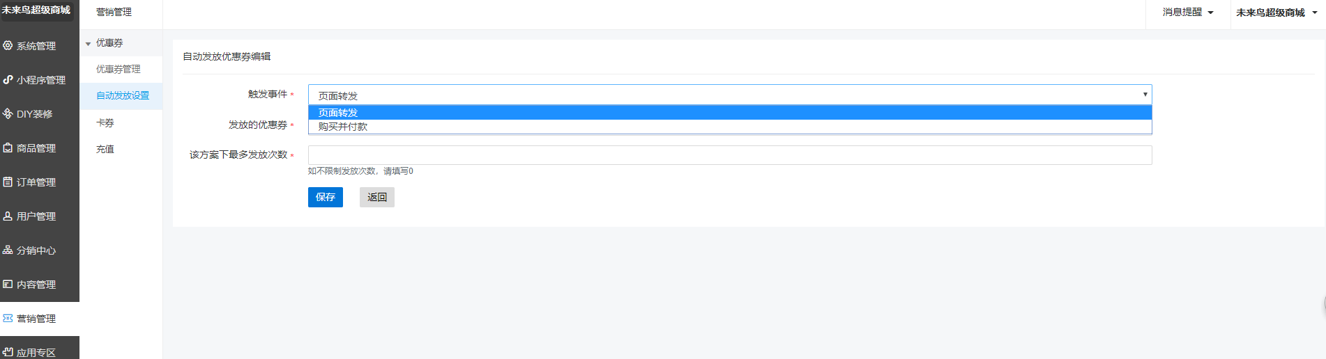 ### 优惠券 #### 第一步: 点击:添加优惠券  注:优惠券只能抵消商品金额,不能抵消运费,商品金额最多优惠到0.01元  1.可指定商品类别使用  2.可指定商品使用  3.不添加表示全场通用  #### 第二步:添加自动发放方案 选择触发事件和发放的优惠券  小程序端显示如下:  若,小程序端没有显示 是因为没有到“商城管理”—>“小程序设置”—>“首页布局” —>“添加领券中心”