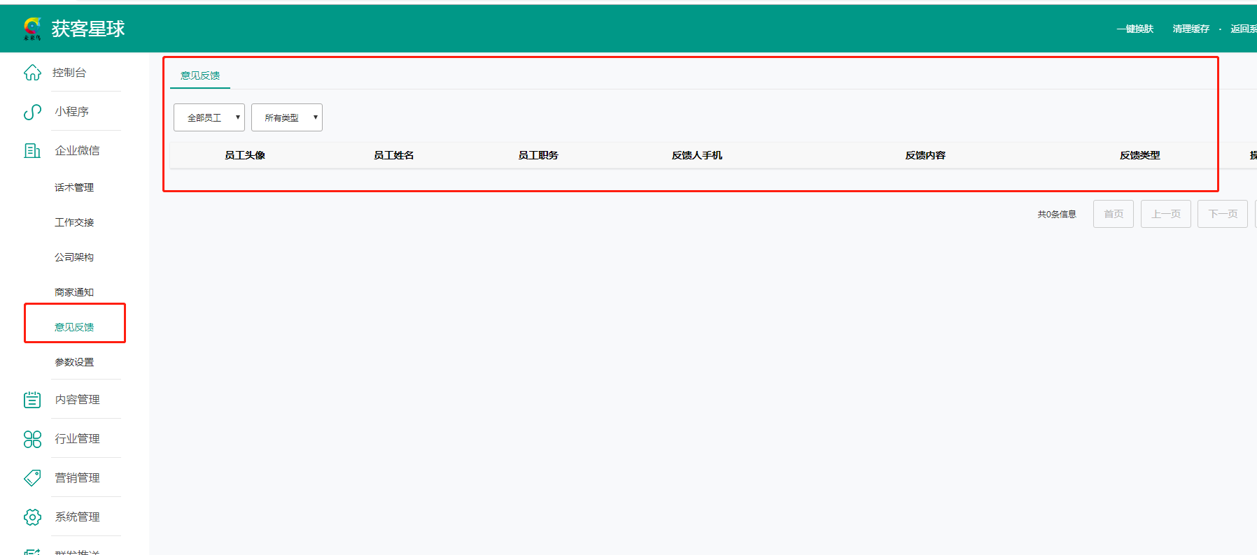 ### 意见反馈  在手机端企业微信APP我--意见反馈提交内容后台可以查看