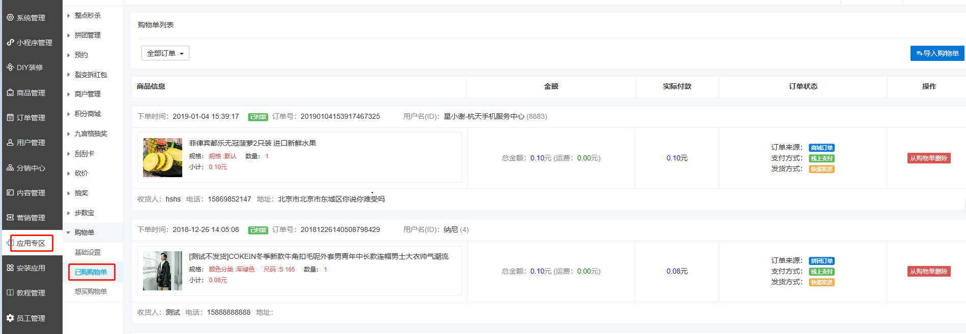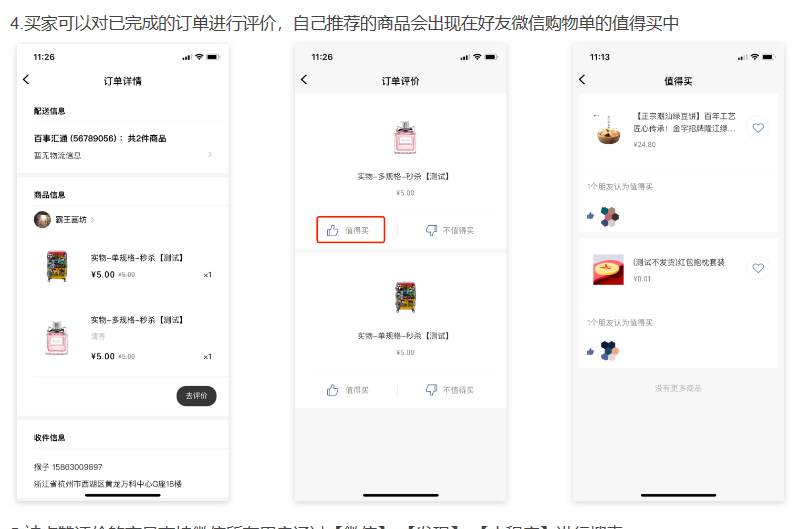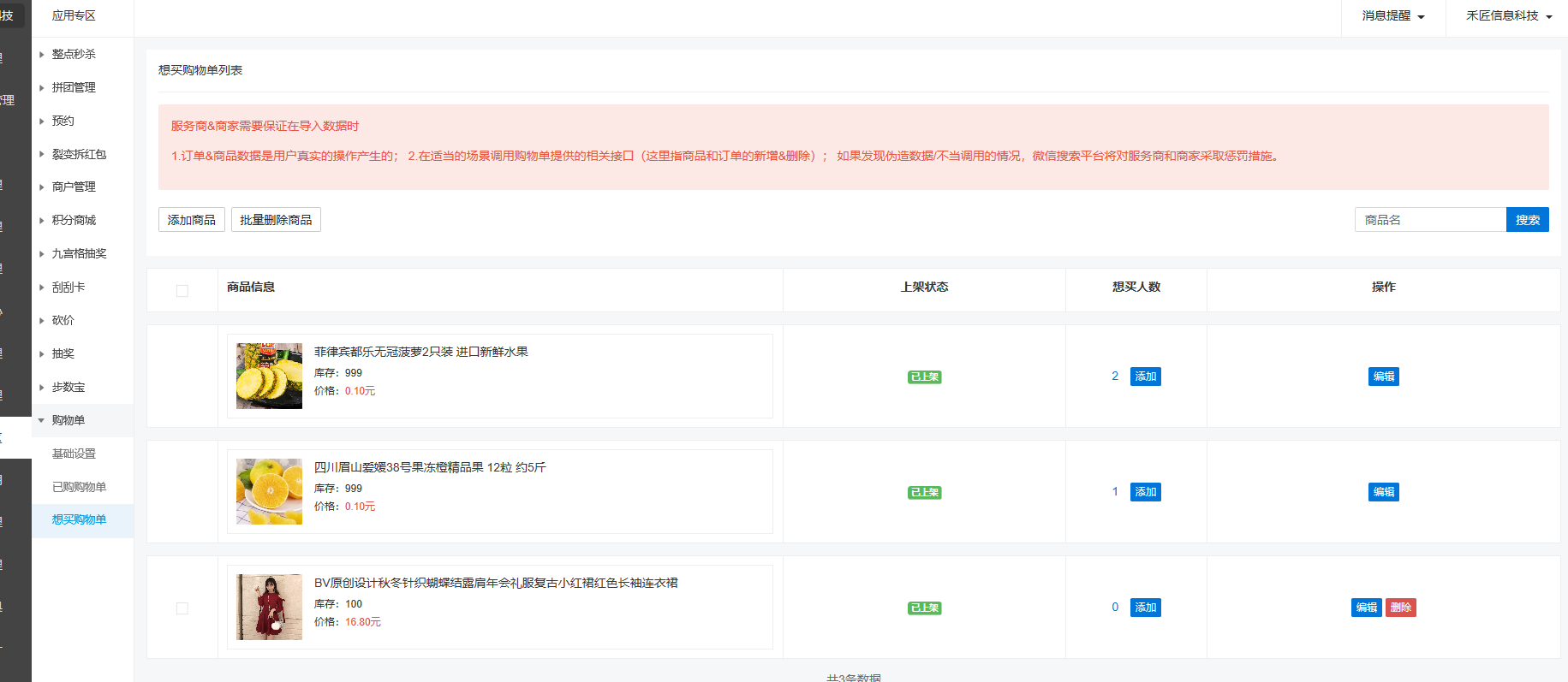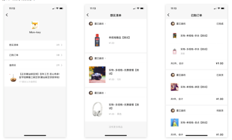 ### 好物圈功能 #### 注:需要商城升级到3.1.6版本并且拥有好物圈插件  #### 1.买家操作: 1这里的开关是指用户自动触发加入好物圈跟想买清单的功能,  需要小程序3.1.16版本重新上传发布才可以使用 在商家小程序中将商品添加至购物车自动加入想买清单、下单支付成功后可以自动加入已购清单  #### 3.点击购物单可以查看在小程序中添加的已购订单跟想买清单,并且直接点击进入商城     #### 2.后台添加 1.已购购物单  只能选择商城3个月内已有订单,导入加入购物单  2.想买清单 选择商城商品,将商城授权用户添加,在用户手机-购物单-想买清单中就会自动增加商品
