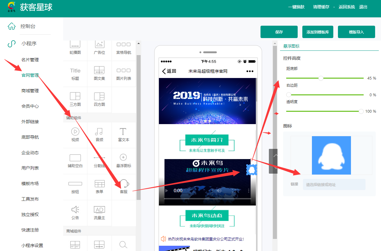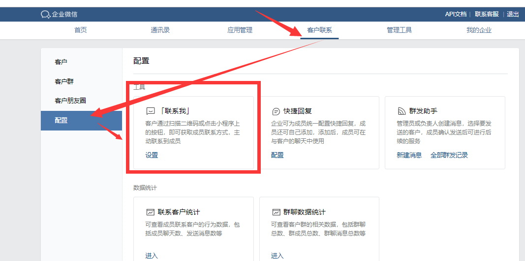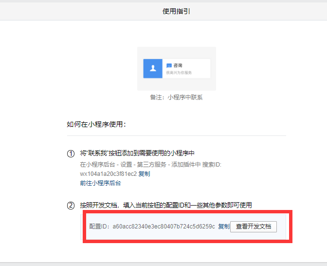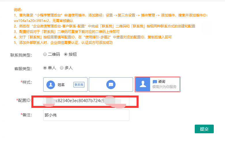 [TOC] ### 企业微信联系我插件! ##### 一.微信小程序后台配置: - 首先登录“小程序管理后台”申请使用插件,添加路径:设置 ->第三方设置 -> 插件管理 -> 添加插件,搜索并添加插件ID: wx104a1a20c3f81ec2,无需审核确认 - wx104a1a20c3f81ec2 设置-第三方设置-添加  ##### 二、然后在“企业微信管理后台-客户联系-配置”中完成「联系我」二维码和「联系我」按钮两种联系方式的创建和配置  - 1、配置好后对于「联系我」二维码可直接下载对应的二维码上传即可  但这个只适用于公众号和扫码识别,不适用于小程序 - 2、对于「联系我」按钮需要填写配置ID,在“使用指引-步骤2”中查看对应的配置ID,复制后填入即可  - 3、添加完毕,返回查看“使用指引”  - 4、其中1为联系我插件ID,您需要输入2中的配置ID到获客星球后台  ##### 三.获客星球后台正确输入方式  - 注意:添加外部联系人时,企业微信需要认证,认证后方可添加成功 四.企业微信“联系我”在装修官网或商城时的插入方式 1.小程序——官网管理或商城管理—装修——辅助组件——悬浮图标  2.选择链接的时候选择—联系我  ##### 四.在小程序端的展现方式