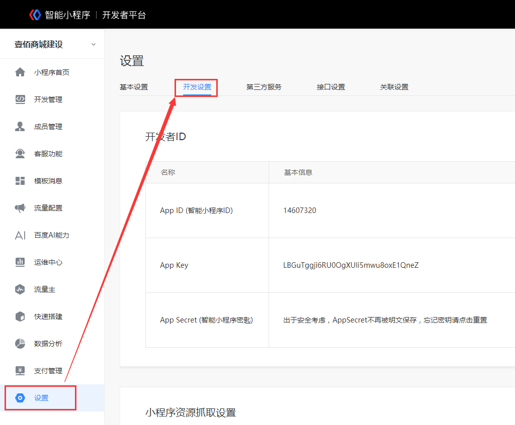 #### 一、对接百度小程序,需要填写小程序名称、APP_ID、APP_KEY、APP_SECRET等信息  #### 二、登录百度小程序后台,打开“设置”菜单的“开发设置”页面,可获取小程序的APP_ID、APP_KEY、APP_SECRET等信息,复制到后台即可  #### 三、填写小程序服务器域名,同样是打开“设置”菜单的“开发设置”页面,页面向下拉可看到服务器域名相关的设置,填写站点域名即可(站点需配置SSL域名证书)