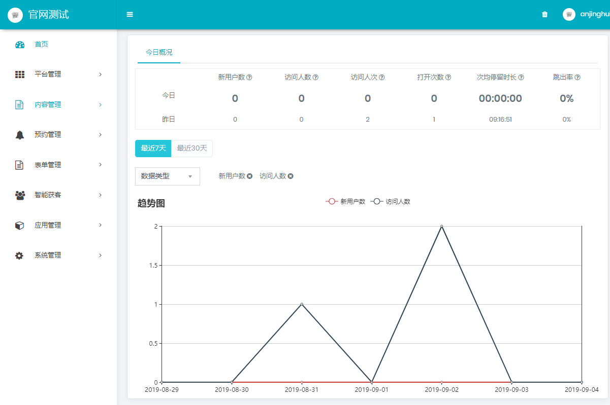 ### 首页可查看今日概况(新用户数、访问人数、访问人次、打开次数、次均停留时常、跳出率) ### 数据类型可以调整趋势图显示信息可以更直观的显示数据