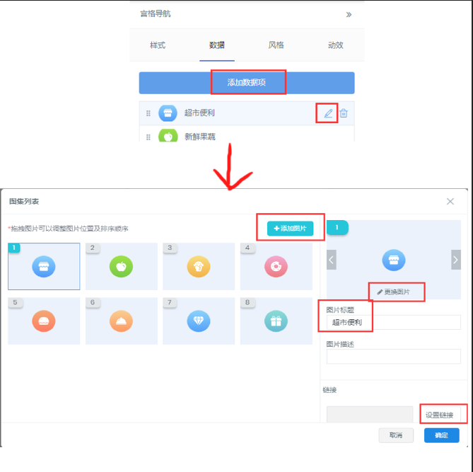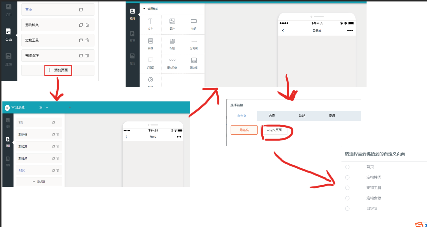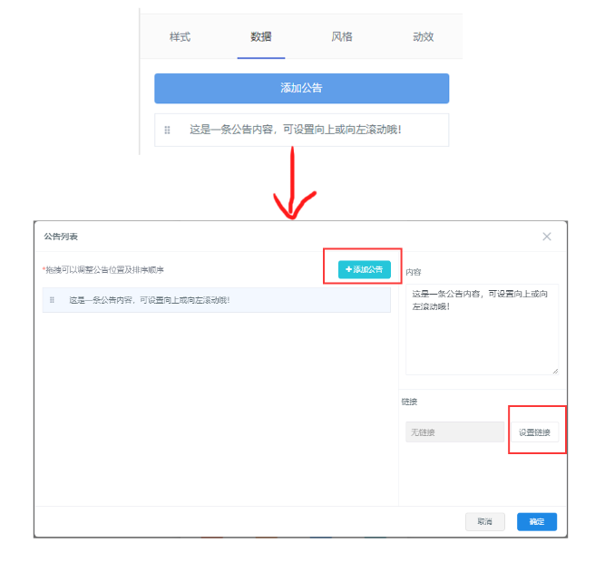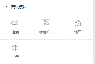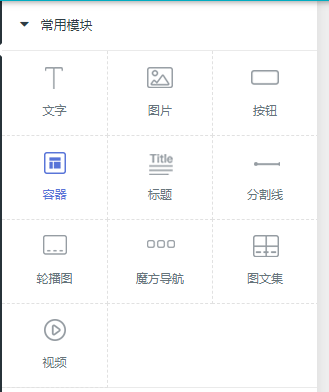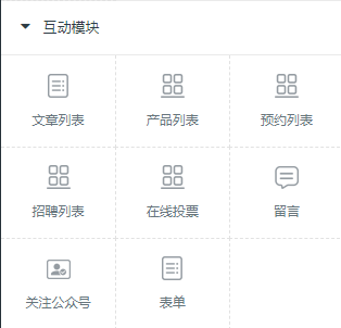 1.1、常用模块 常用模块包括文字、图片、按钮、容器、标题、分割线、轮播图、魔方导航、图文集和视频等  轮播图、魔方导航、图文集数据设计的时候可根据下方标注进行操作  所有模块都包括样式、数据、风格、动效属性 以“宫格导航”为例,点击组件之后,选择页面右侧的“数据”选项卡,可添加或编辑相关数  “视频”组件添加添加注意视频链接地址及视频封面的设置  所有数据更改填写可根据提示进行操作 ### 1.2、互动模块  互动模块所有数据获取都是通过后台(文章管理、产品管理,预约管理、招聘管理、表单管理、投票管理)获取相关数据 操作流程  (文章列表、产品列表、预约列表、招聘列表、在线投票)都可以通过手动、自动的方式选择数据 所有数据更改填写可根据提示进行操作 ### 1.3、高级模块  搜索、微信广告、地图数据填写的时候需注意细节的填写   上图为公告的数据填写,可通过添加公告进入图片右边的页面进行添加公告、内容更改、设置链接 ### 2.1.2、页面 此功能实现DIY页面的设计,根据自己需求做自己需要要的页面  ## 操作流程  添加页面——选择页面——点击控件(设计页面)——(在需要链接此页面的位置)设置链接——自定义——自定义页面——选择 ## 2.1.3、属性  设置文章显示颜色,也可根据自己喜欢的颜色设置  可根据自己需要进行选择或者取消