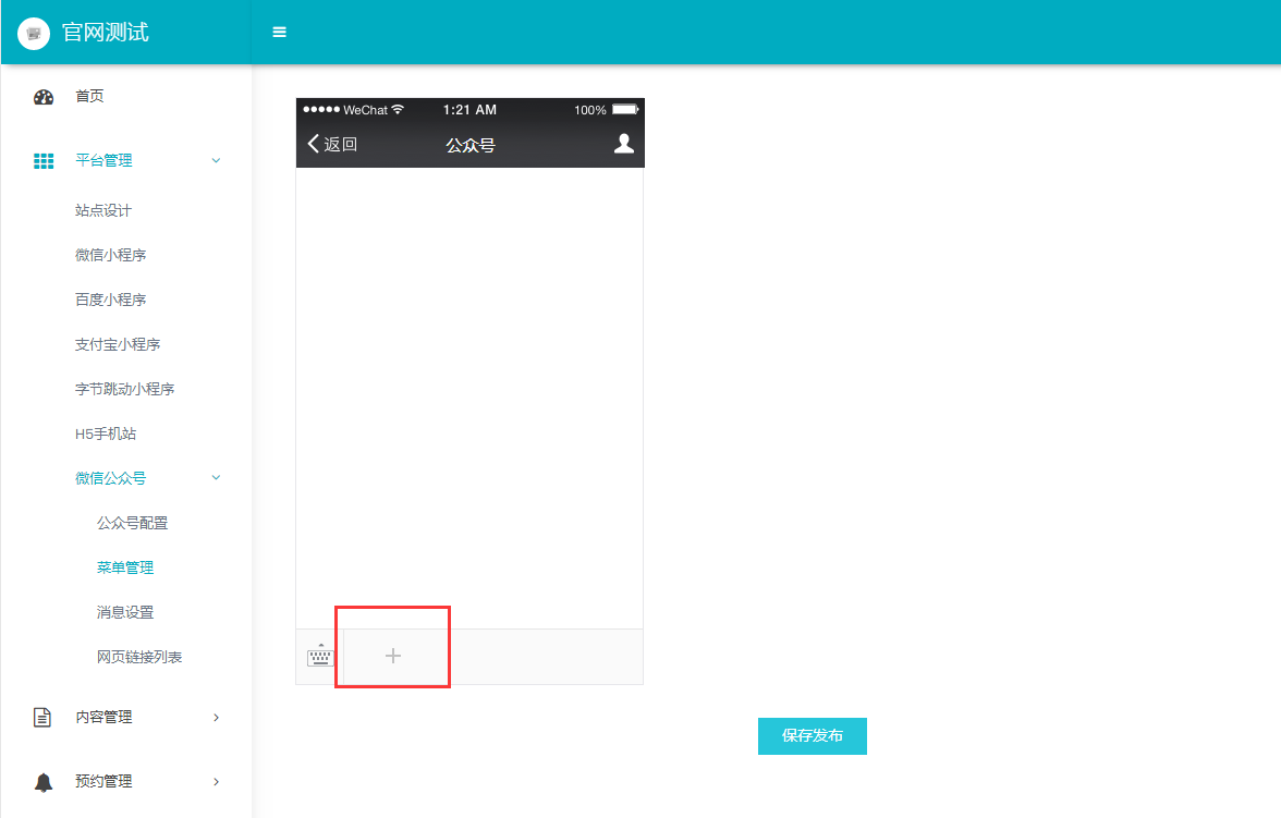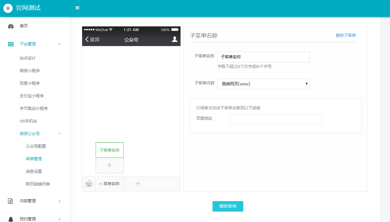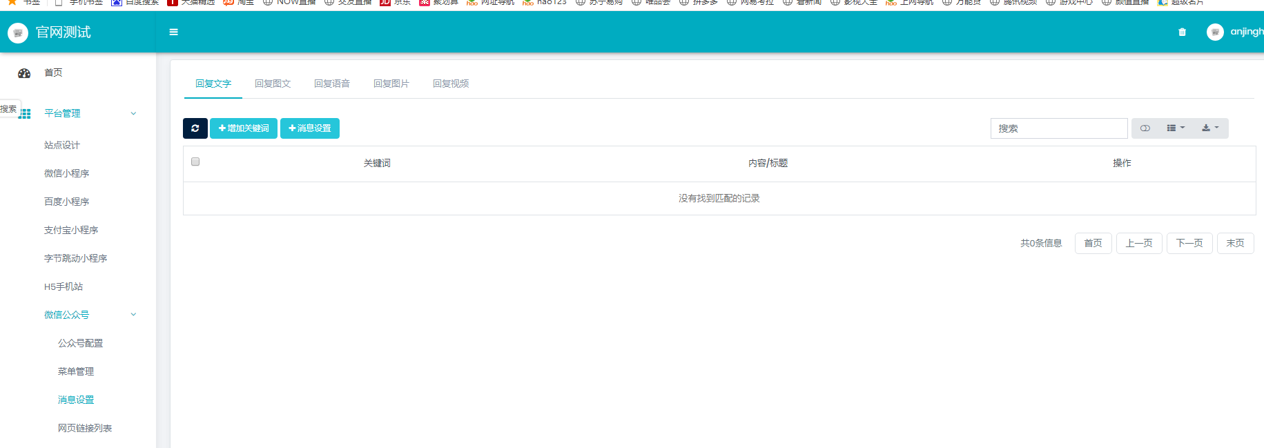 # 2.7.1、公众号配置  数据获取可参考一、壹佰智慧轻站操作手册的微信公众号相关 ### 2.7.2、菜单管理    可通过自己需求添加菜单以及子菜单,添加后右侧右侧为属性,可以设置标题,链接、删除此菜单等。 ### 2.7.3、消息设置  消息设置 增加的关键字 可以在菜单中使用 对应菜单填写关键字 当手机上点击这个菜单时 就会触发这个关键字设置的内容  菜单管理具体操作流程 ### 2.7.4、网页链接列表  链接可在菜单管理里面进行使用 具体步骤如下  将链接复制下来粘贴到第三个框页面地址文本框中