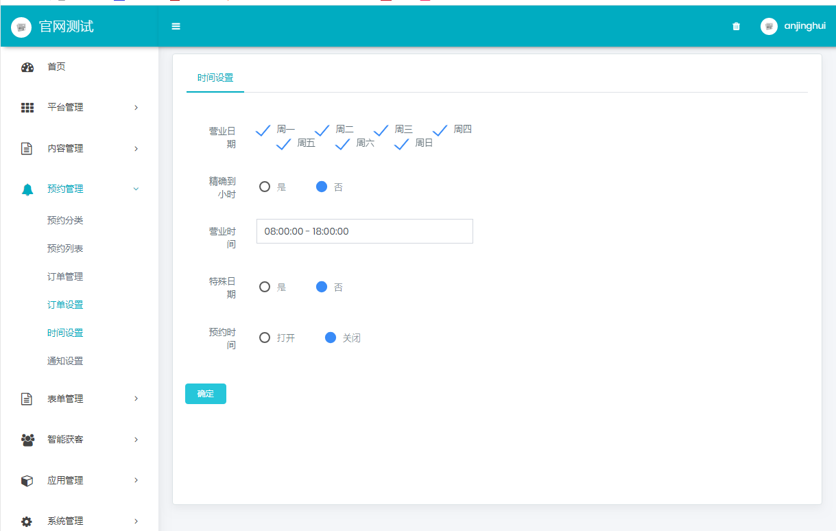 ### 4.5、时间设置  此功能用于商家设置工作时间,设置此功能时注意特殊日期,和预约时间的设置,此设置和预约列表——添加里面的预约时间存在联系