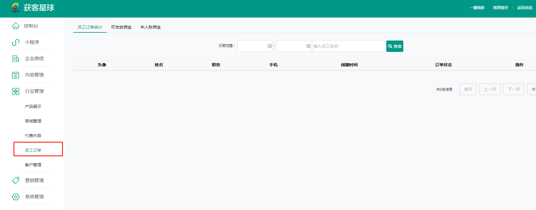 ### 员工订单  用来显示用户通过该员工名片进入商城购买商品的订单统计,以及该员工可以发放的佣金明细。 要想使用这个功能,需要在“商城管理——添加商品”界面,设置员工提成。