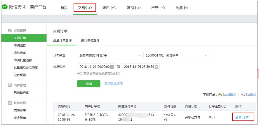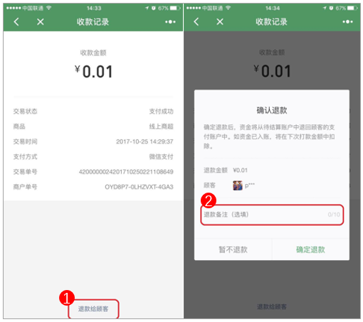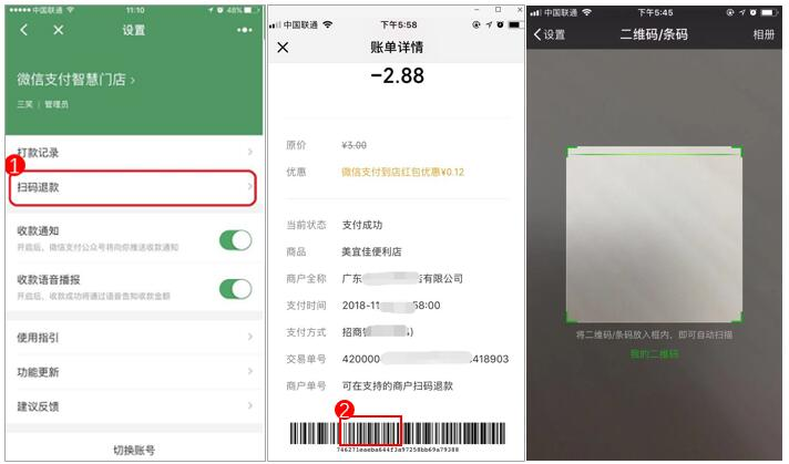 微信收款商家版退款方法 1、移动端退款方法 移动端支持部分退款和全额退款,但交易时间超过一年的订单无法提交退款。 方式一:扫码退款 退款入口:扫码退款+收款记录详情底部入口(仅管理员有权限操作) 顾客出示订单条码-商家扫码退款-商家进入扫码退款,扫描顾客商户单号条码,确认退款订单信息后,完成退款  方式二:收款记录退款 商家在收款记录-打开退款订单详情-退款给顾客。退款时可添加退款备注,备注信息会在收款详情中展示。 订单退款后,会在收款记录、收款记录详情、经营报表、打款详情中展示相关信息  温馨提示: 1)同一个订单支持发起多次退款,只要不超过订单的总金额就可以,退款状态可在收款记录详情页中查看退款的状态; 2)订单退款,金额全额退款顾客,不会收取商家该笔订单的手续费; 3)管理员可以设置店长退款权限,店长获取退款权限后,可以在买单小程序的“设置页面”和“订单详情”页中,找到退款入口,点击可操作部分退款或者全额退款。 2、PC端退款方法 登录商户平台后,可以通过查询交易订单发起退款申请或者按订单号申请退款。 1)查询交易订单发起退款:  2)按订单号申请退款,输入微信支付订单号或商户订单号任意一个即可申请: