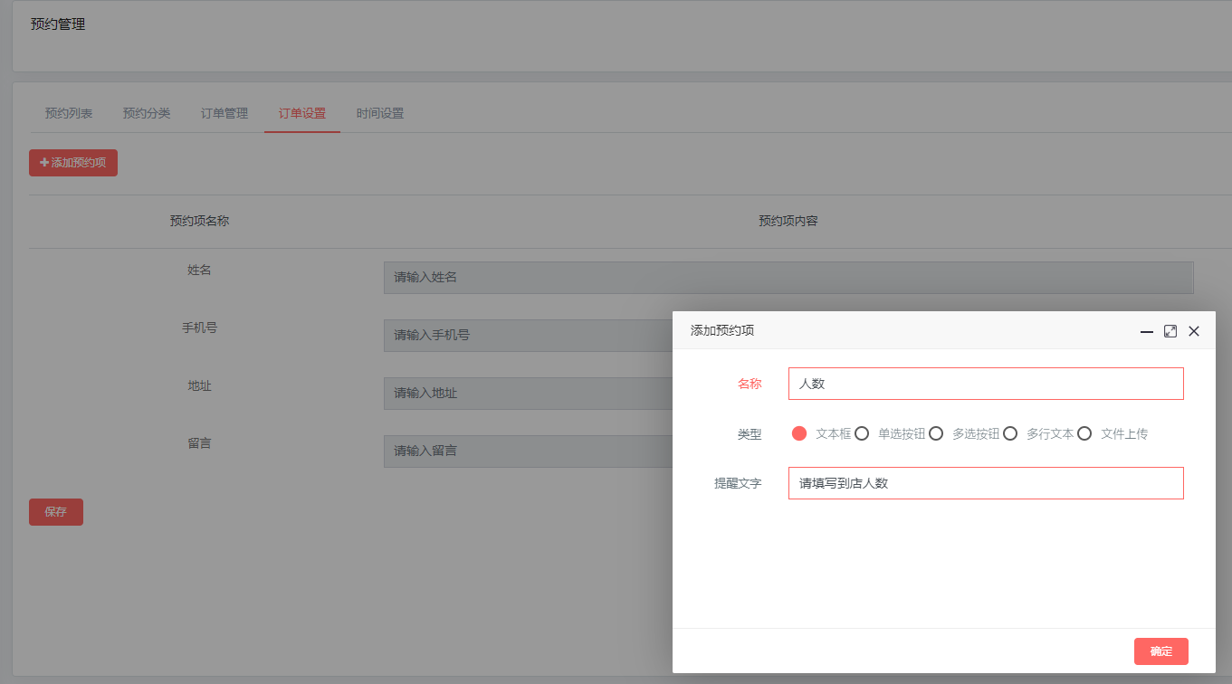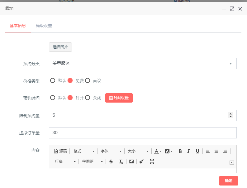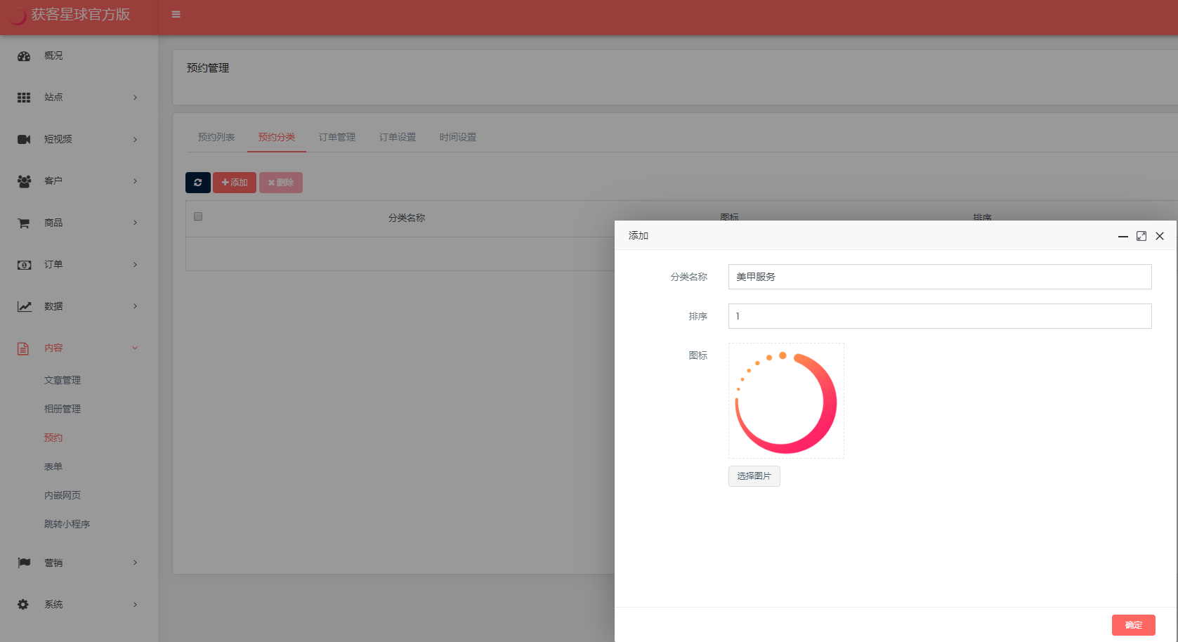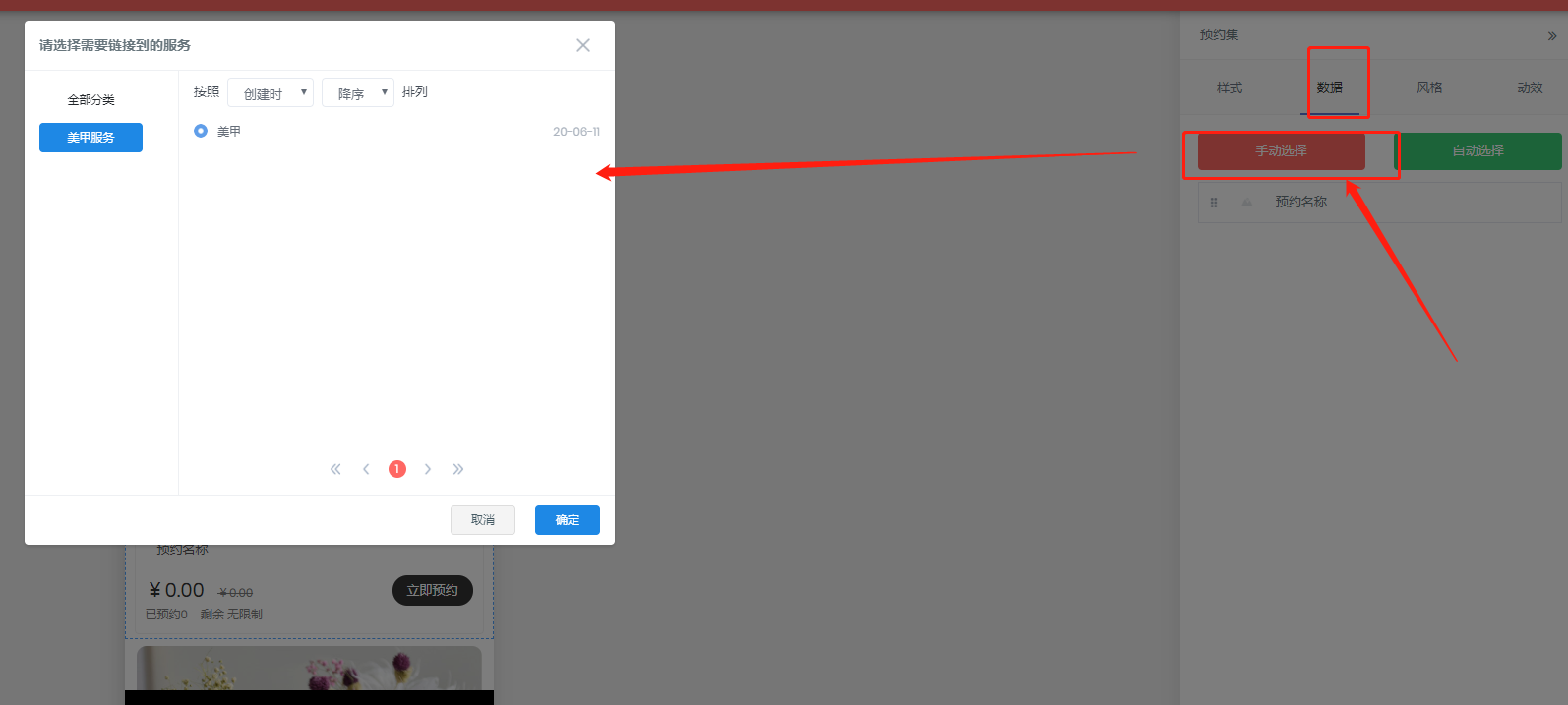 #### 一、添加预约分类 预约分类——填写信息——确定保存  #### 二、添加预约商品 1、预约列表——添加——填写预约信息——确定保存 2、预约时间:打开预约时间,可设置预约的时间限制   #### 三、订单管理 可查看所以预约订单详情 #### 四、订单设置 设置预约时,所需要填写的信息:添加预约项——填写预约需填写的信息——确定保存  #### 一、进入站点装修页面 #### 二、选择需要展示“预约功能”的页面(商城页为例) #### 三、添加一个预约列表组件——数据——手动选择——选择展示的预约商品——确定保存即可
