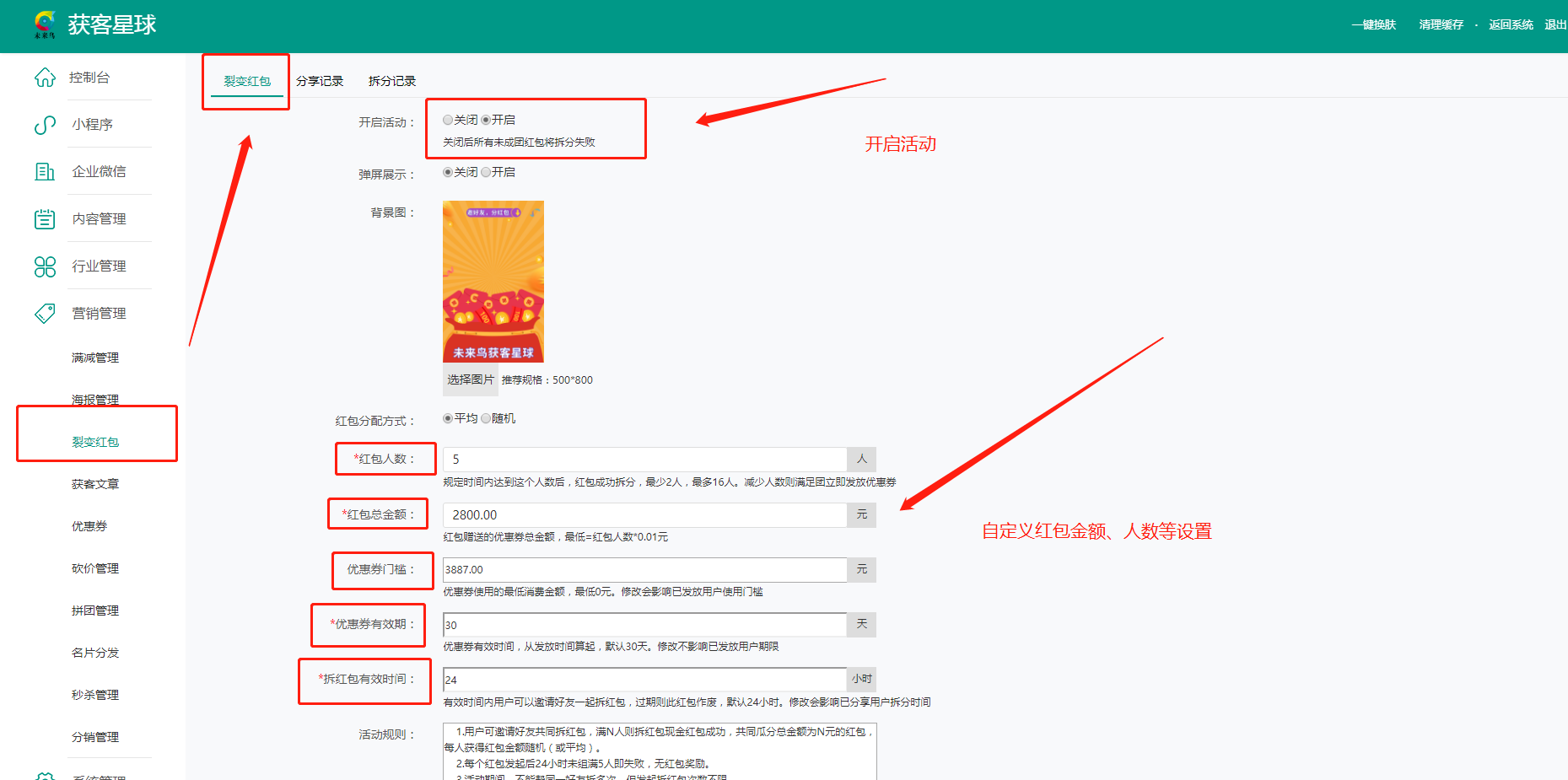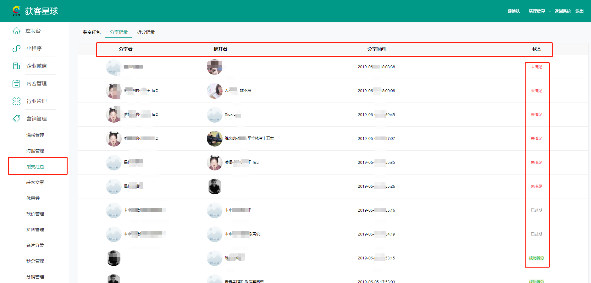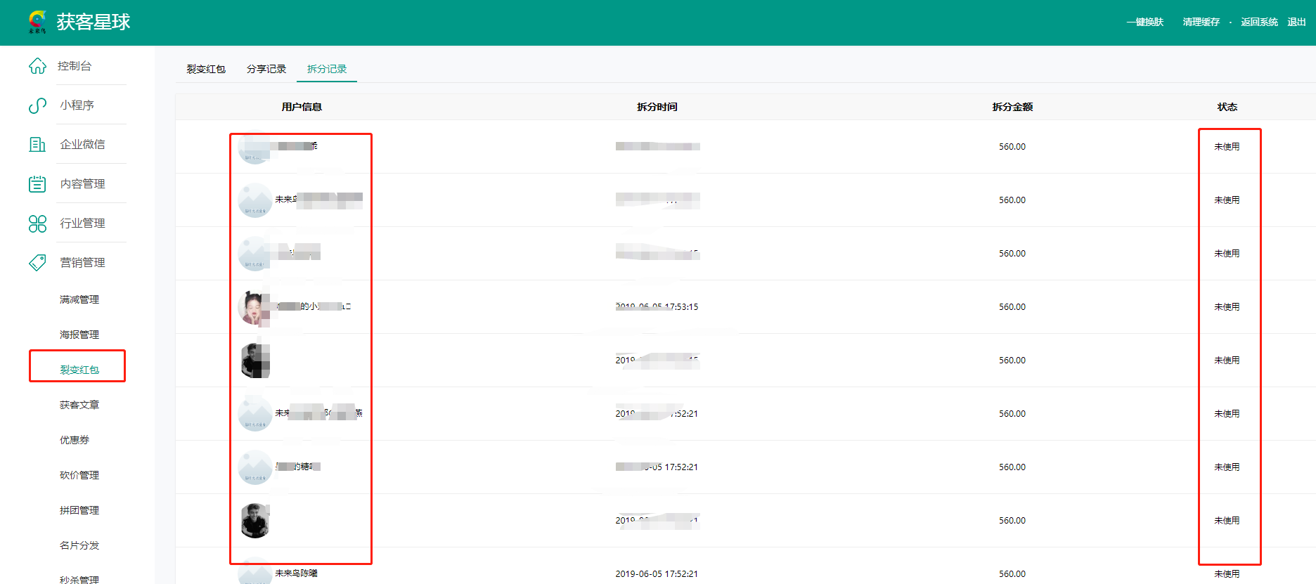 ## 裂变红包 ### 裂变红包   ### 分享记录  ### 拆分记录