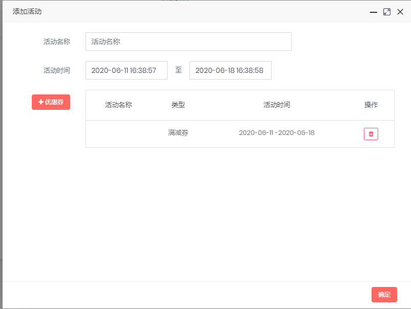 #### 一、添加优惠券 添加优惠券——填写优惠券信息——选择优惠券类型及时间等——确定保存即可(发放状态需开启才可以)  #### 二、使用优惠券 **1、新客有礼:新用户进入小程序时,弹出优惠券 ** 2、添加方式:新客有礼——添加——填写活动信息(时间与设置优惠券时间一致)——勾选优惠券——确定保存 **3、支付有礼:用户支付后弹出优惠券(添加方式相同)** **4、小程序页面显示优惠券:站点设计里,添加优惠券组件,添加优惠券即可**