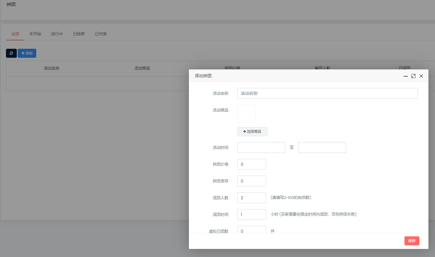 #### 添加拼团商品(砍价功能相同) 1、点击添加——根据提示添加信息即可 2、展示:站点设计版块——添加拼团模块