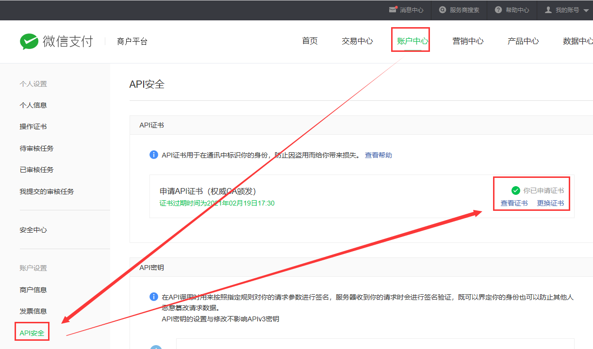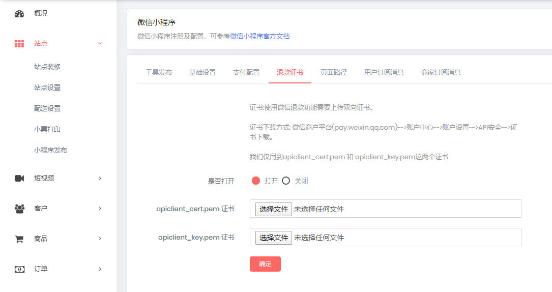 ## 配置微信自动退款 提示:如配置服务商支付,退款功能相关请参考服务商支付配置 普通微信支付的退款功能请参考下文: 一、登录微信支付商户平台,打开【账户中心】-【API安全】页面,生成并下载证书文件。  二、将下载过的证书文件解压,一共有4个文件  三、登录【获客星球】后台,打开【站点】-【小程序发布】-【微信小程序】页面  四、在【退款证书】配置页面【开启】退款功能,并上传所需的证书文件,【确定】保存即可。